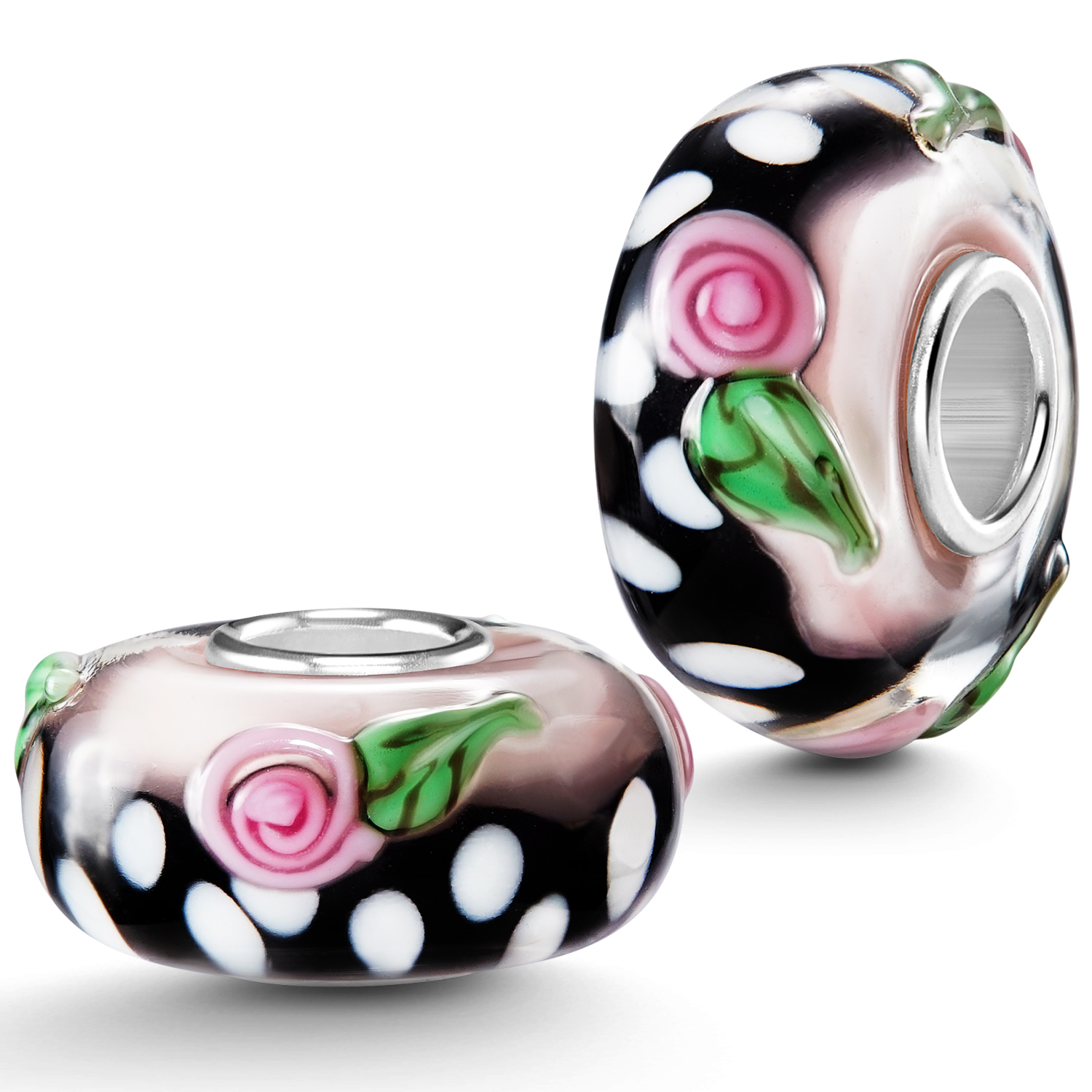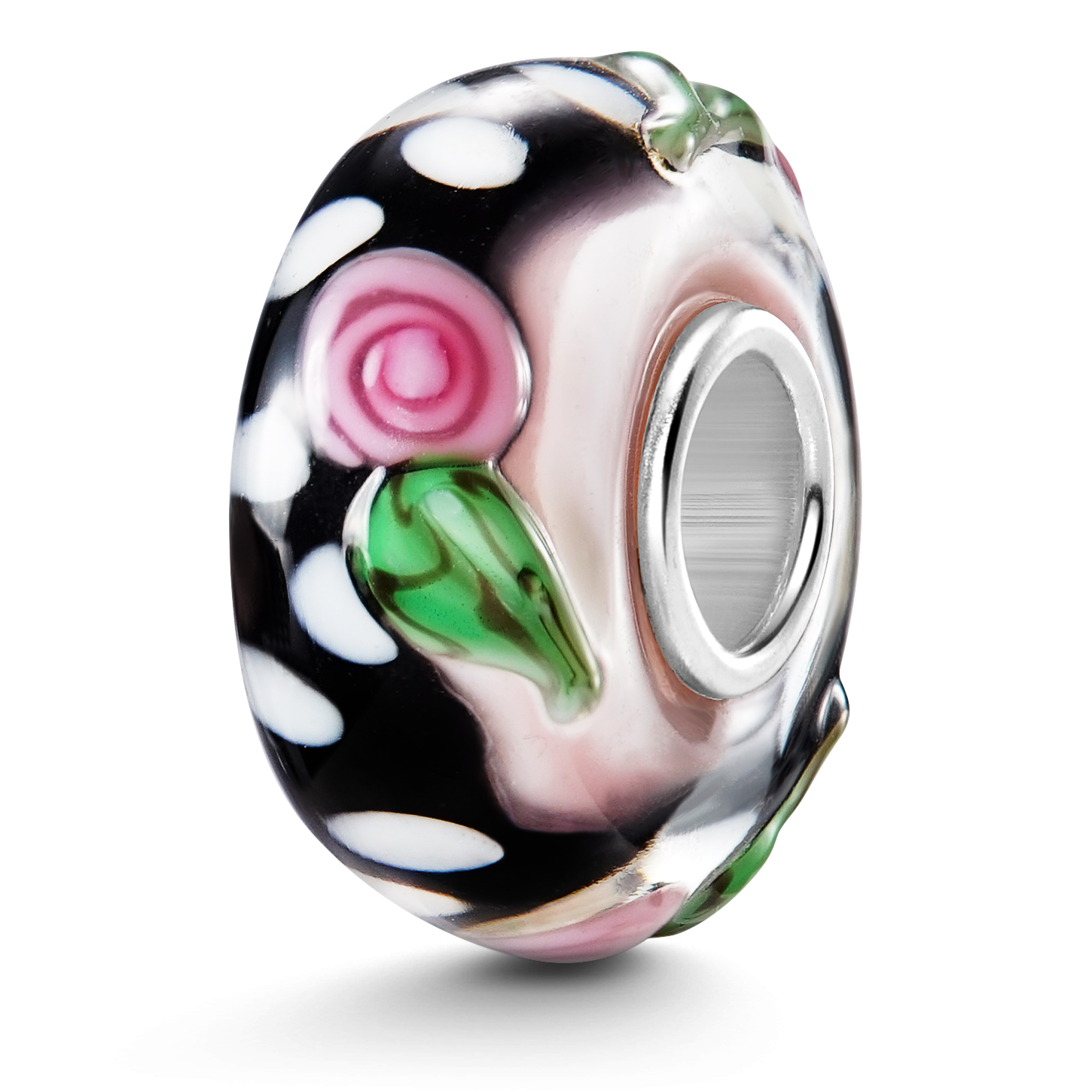 Schwarzer Glas Bead mit weißen Punkten und rosa Rosen im 3D-Design . Die Glasperle ist mit einer Hülse aus 925 Sterling Silber ausgestattet und eignet sich für Beads Armbänder und Ketten bis max 4,4mm Durchmesser.
