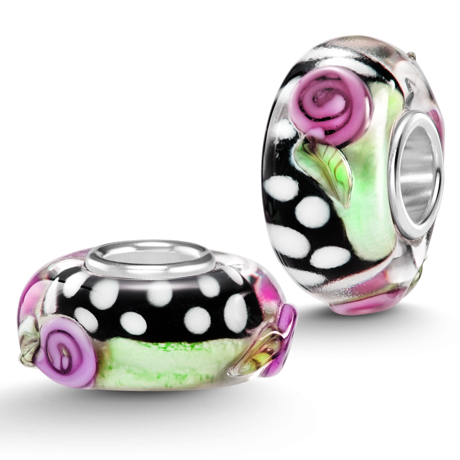 Schwarz-grüner Glas Bead mit weißen Punkten und pinken Rosen im 3D-Design . Die Glasperle ist mit einer Hülse aus 925 Sterling Silber ausgestattet und eignet sich für Beads Armbänder und Ketten bis max 4,4mm Durchmesser.