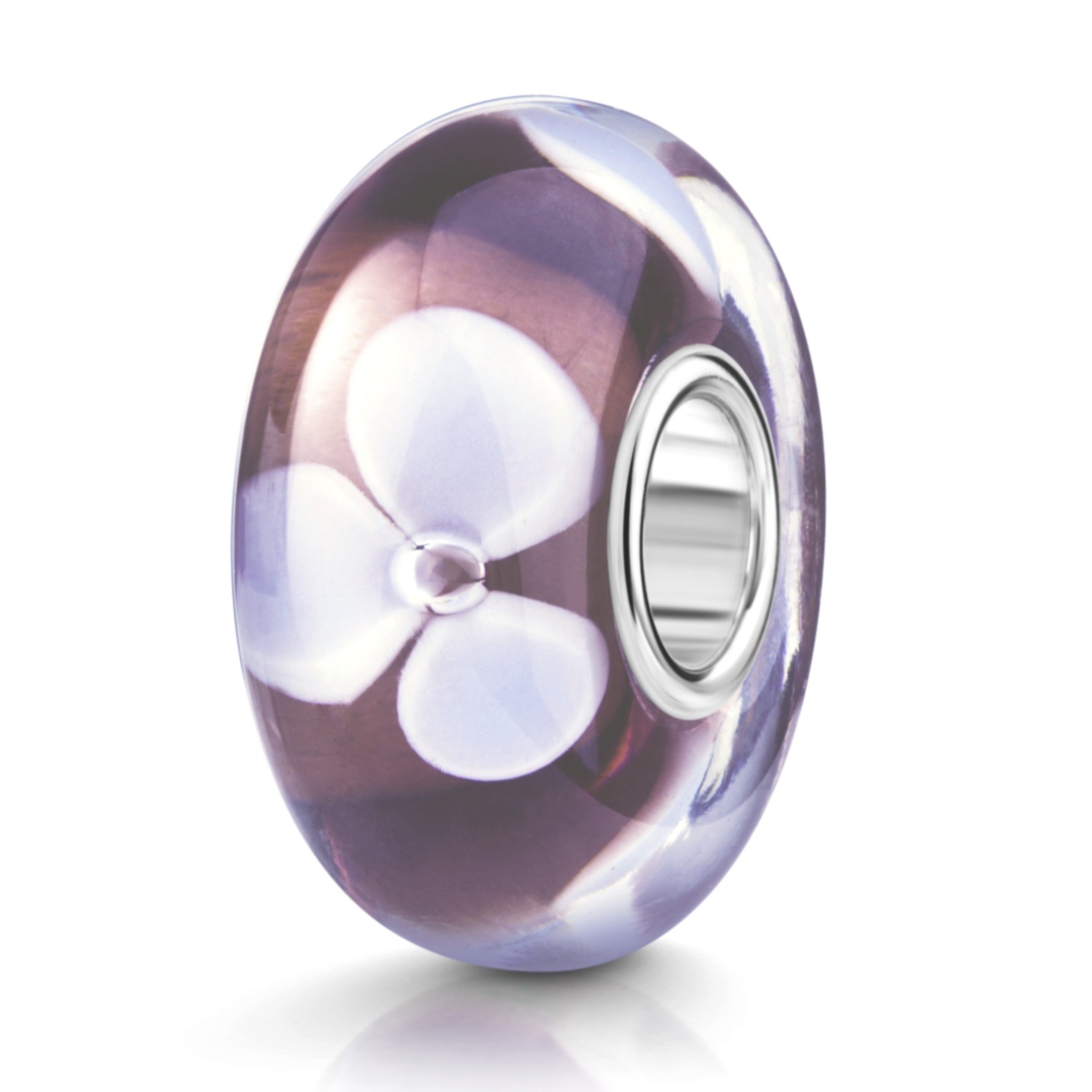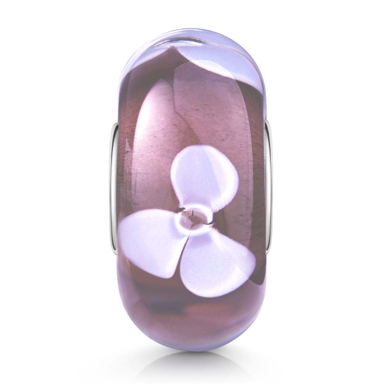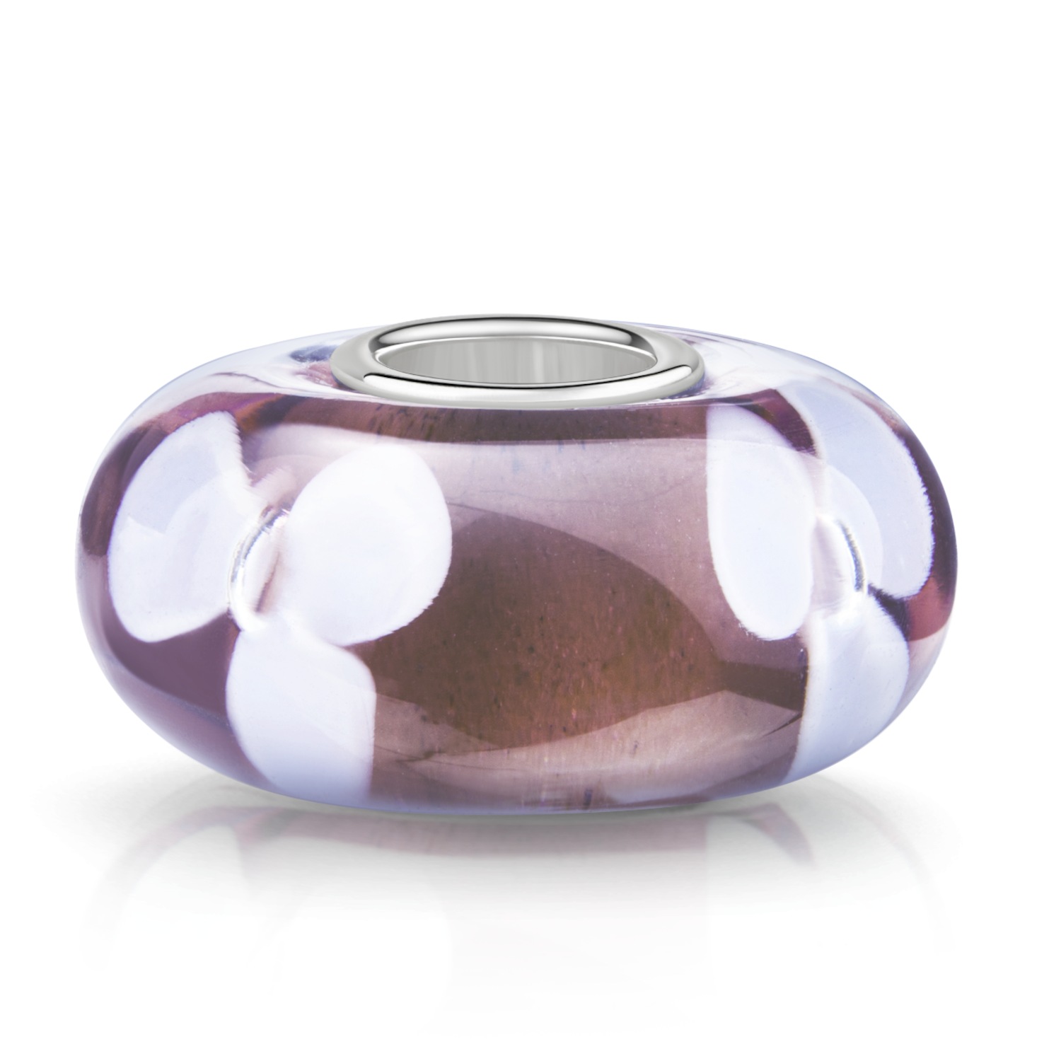 Der Bead strahlt in einem Altrosa-Farbton und ist mit 3 weißen Blüten verziert. Der im Murano-Stil gefertigt Bead eignet sich für Beads Armbänder & Ketten mit einem maximalen Durchmesser / Breite von 4,2mm.