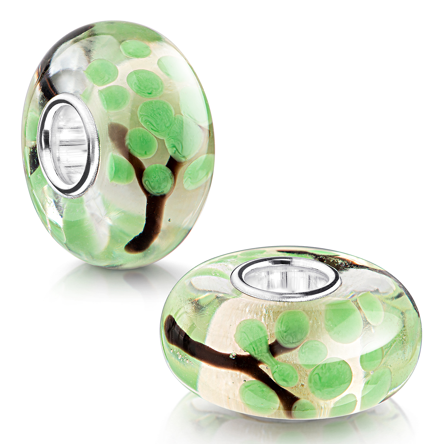Grüner Glas Bead mit wunderschönem Baum Motiv und Hülse aus massivem 925 Sterling Silber. Dieser Glas Bead ist passend auf Armbänder und Ketten bis 4,4mm Stärke.