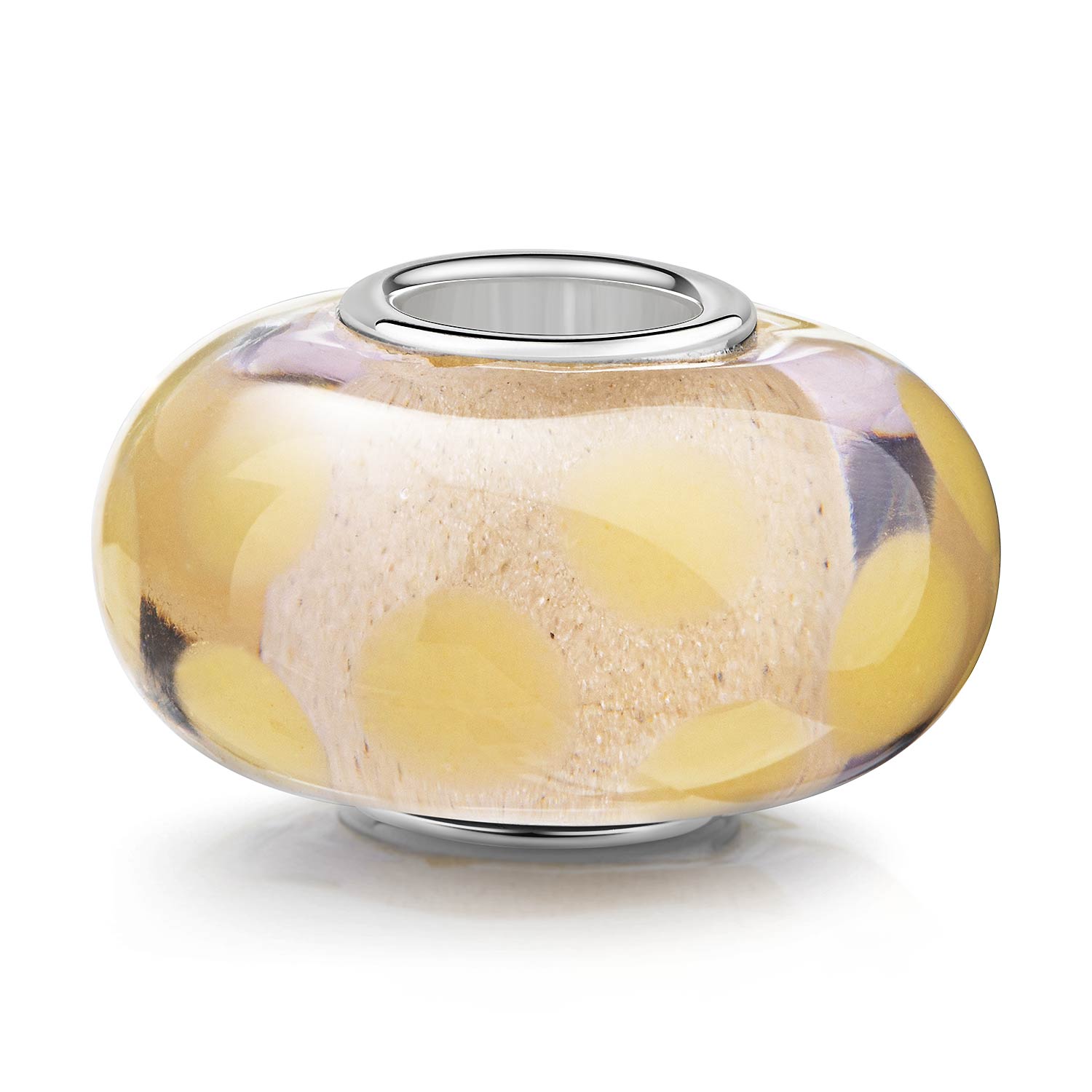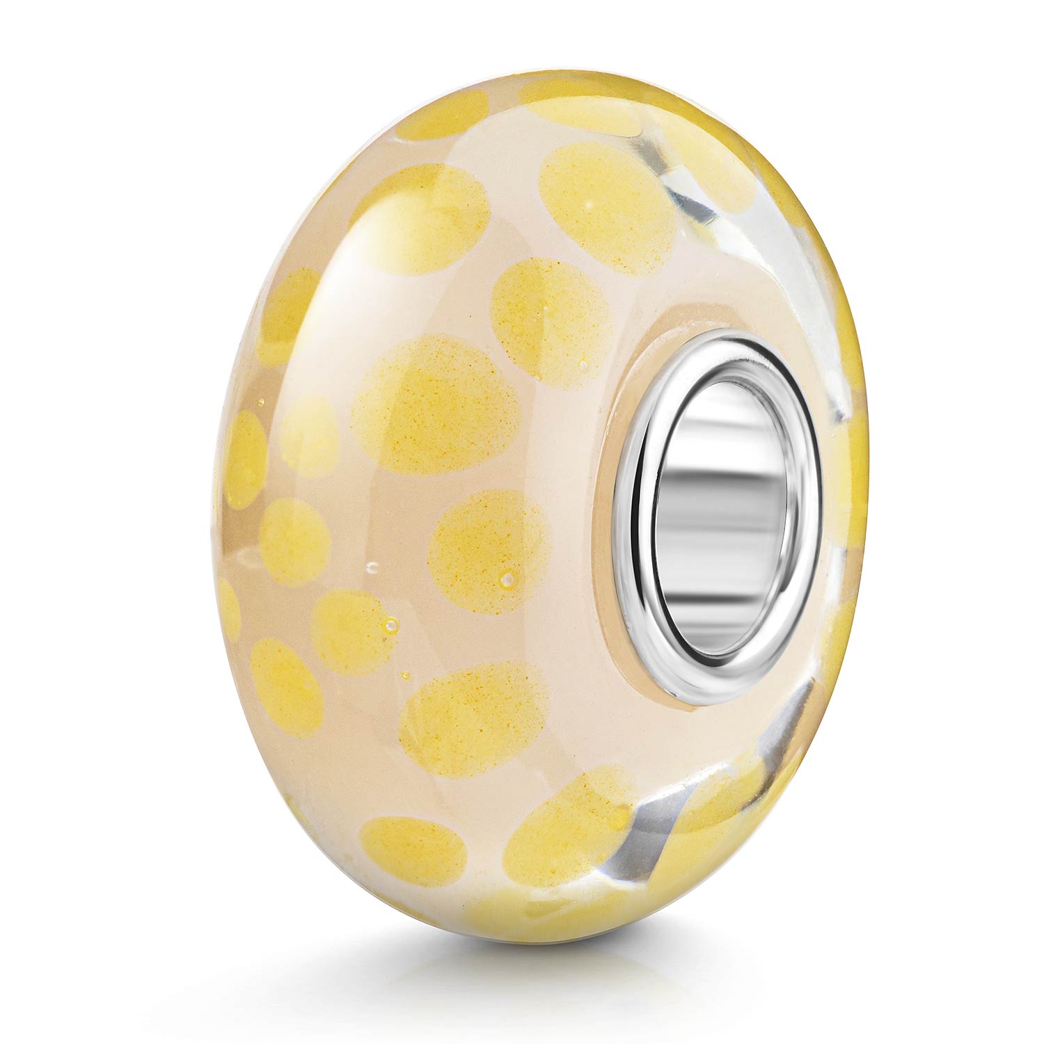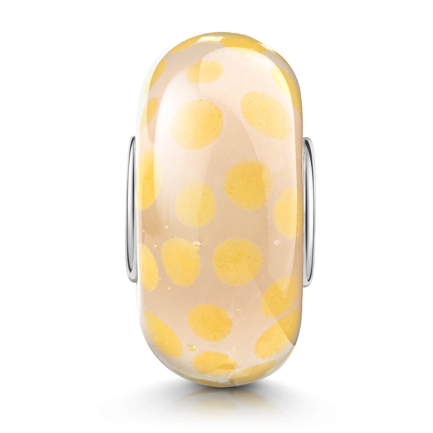 Beiger Glas Bead mit gelben Punkten gefertigt im Muranoglas-Stil. Die Glasperle ist für Beads Armbänder und Ketten bis max 4,2mm Durchmesser geeignet.