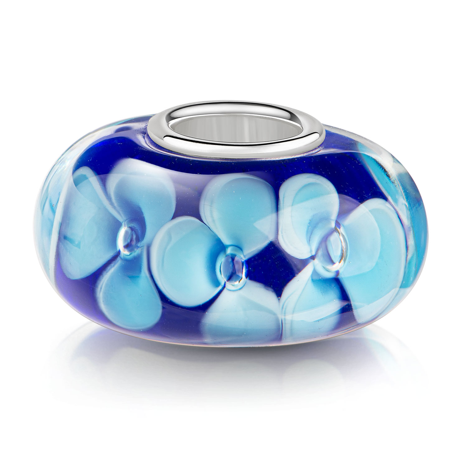 Hübscher Glas Bead in Blau mit hellblauen Blüten und einer Hülse aus massivem 925 Sterling Silber. Lieferung inkl. Materia Satin Schmuckbeutel.