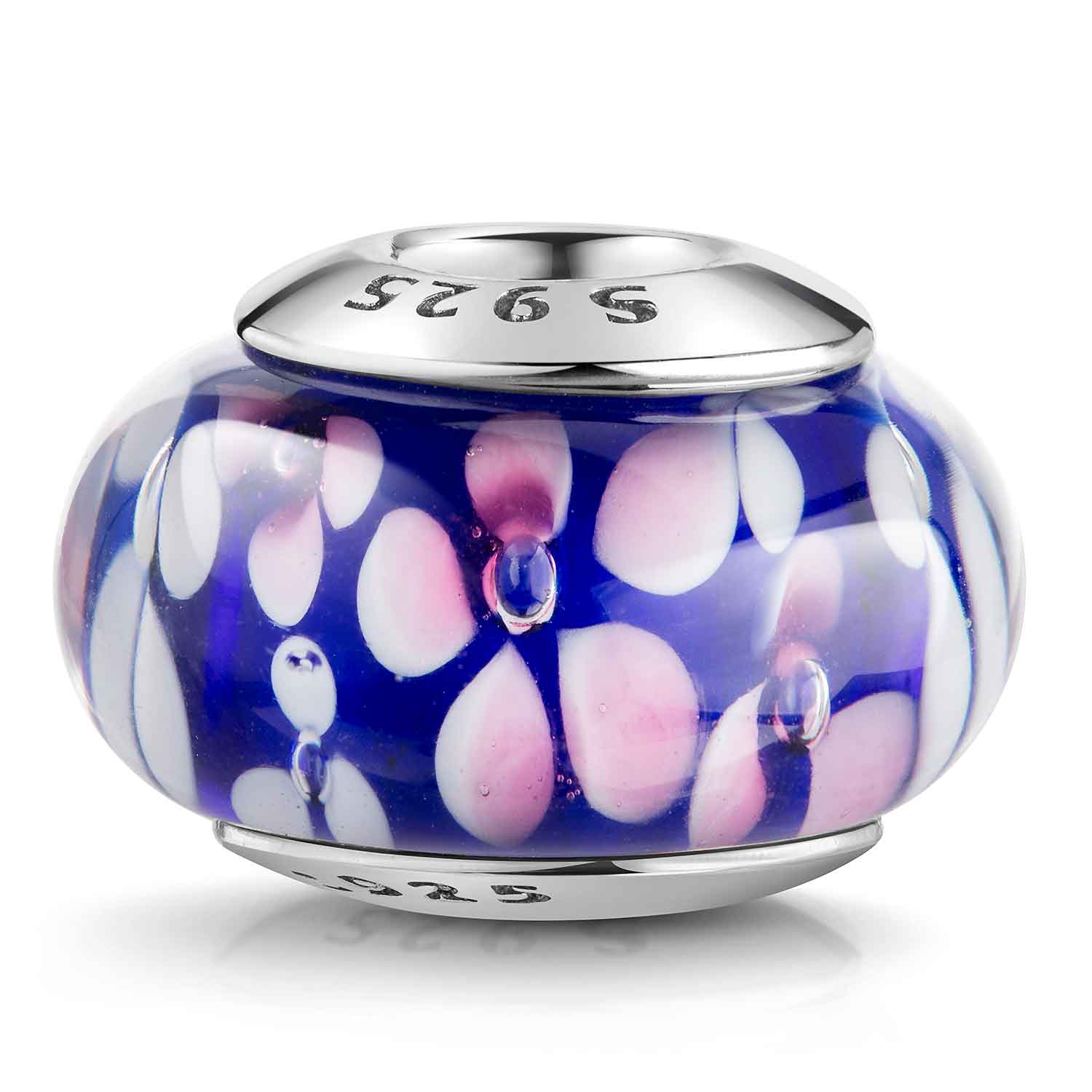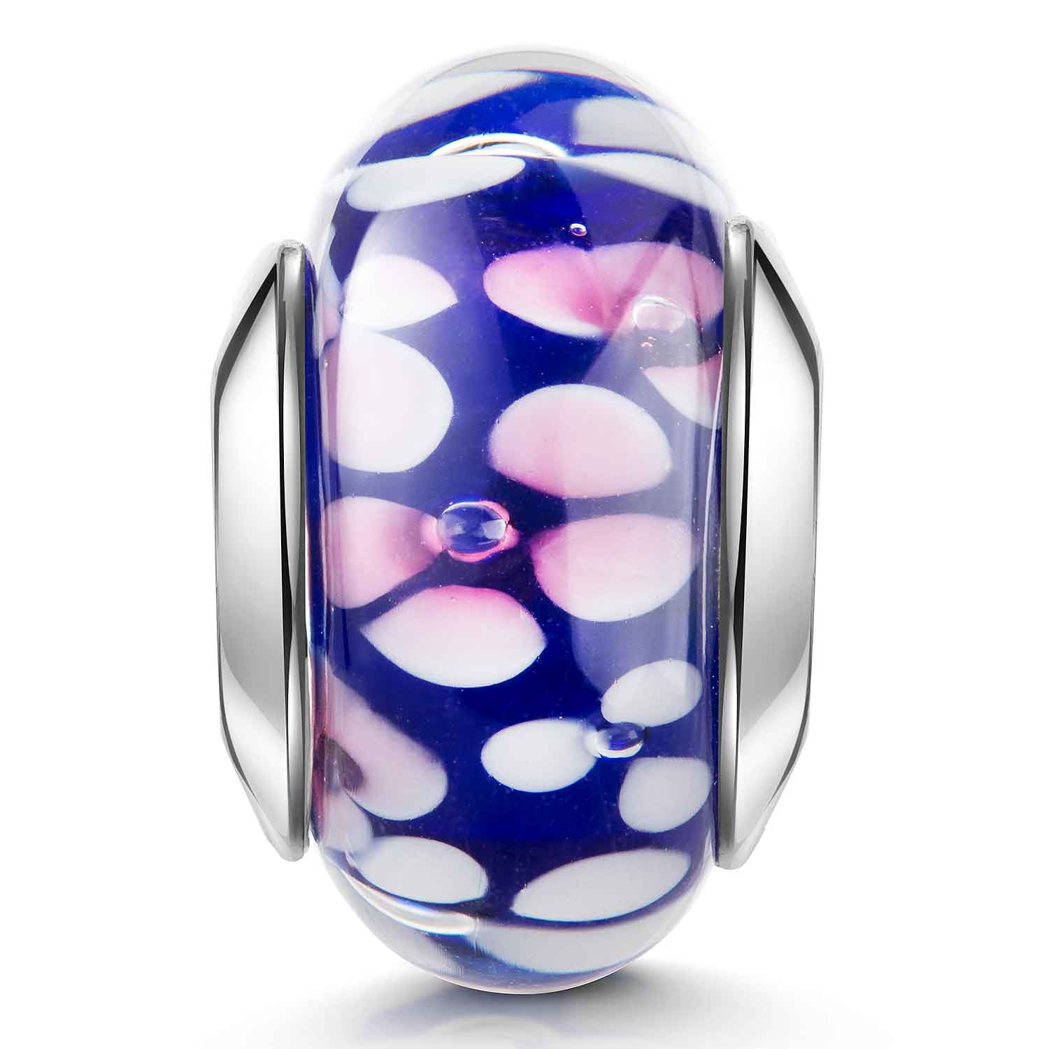 Dunkelblauer Glas Bead im Murano Stil mit wunderschönen Blüten in Weiß und Rosa. Passend zu Beads Armbändern und Ketten mit oder ohne Gewinde bis Ø3,8mm.