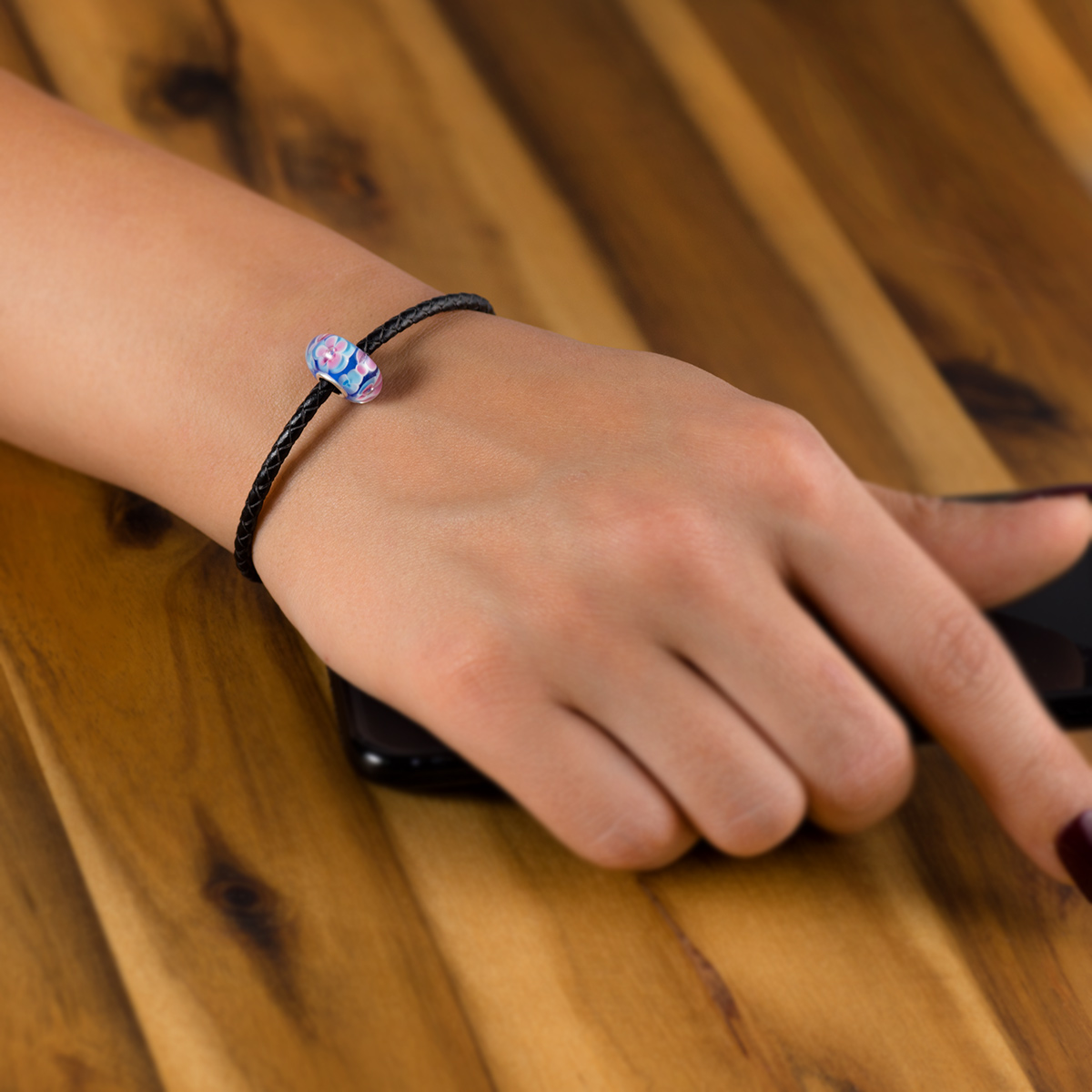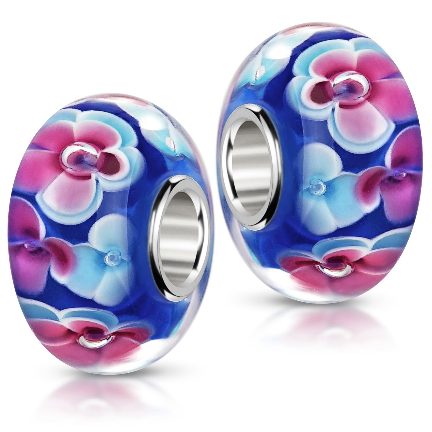 Unser blauer Glas Bead zeigt zahlreiche Blumen in den Farben Hellblau und Pink. Kleine Luftbläschen zieren das Mitte jedes Blüte. Das Element ist mit einer Hülse aus massivem 925 Sterling Silber ausgestattet. Dieser Bead ist kompatibel mit allen gängigen Beads Armbändern und Ketten bis max. 4,4mm Breite/ Durchmesser und ist daher für alle Marken Beads geeignet.