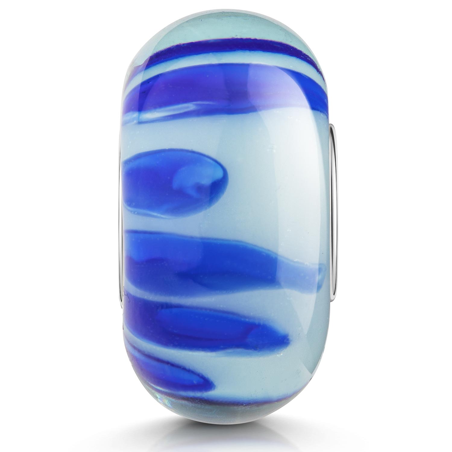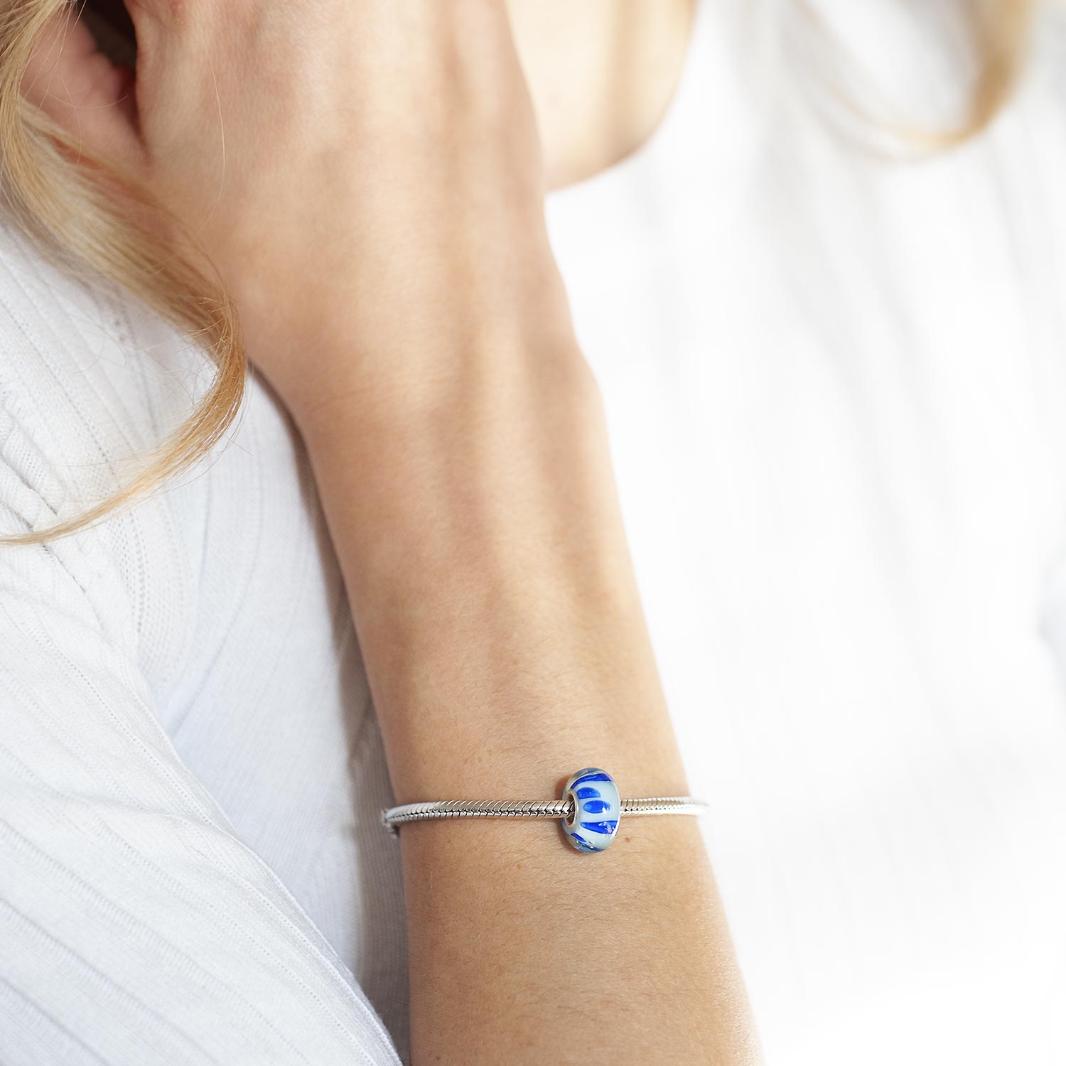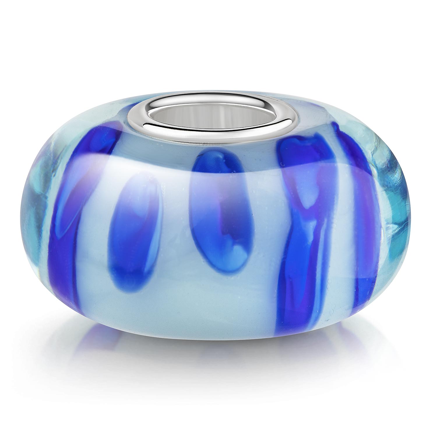 Glas Bead mit einem Muster aus Punkten in verschiedenen Blautönen mit einer hochwertigen Hülse aus 925 Sterling Silber, welcher sehr gut zu vielen anderen Beads Anhängern in unserem Schmuck Shop kombiniert werden kann. Der Bead ist kompatibel mit allen handelsüblichen Beads Armbändern und Ketten bis max. 4,4mm Breite und ist auch für alle gängigen großen Beads Marken geeignet.