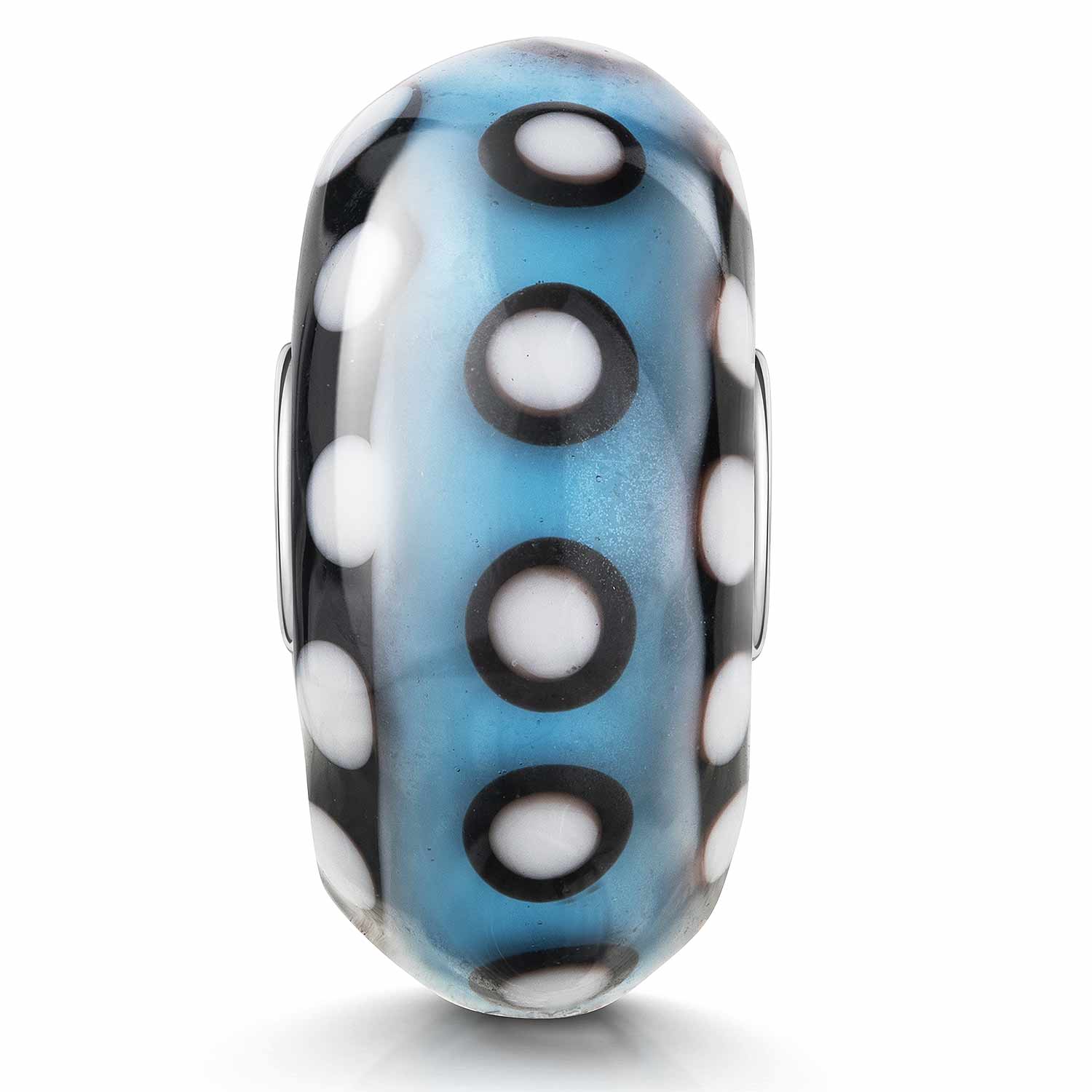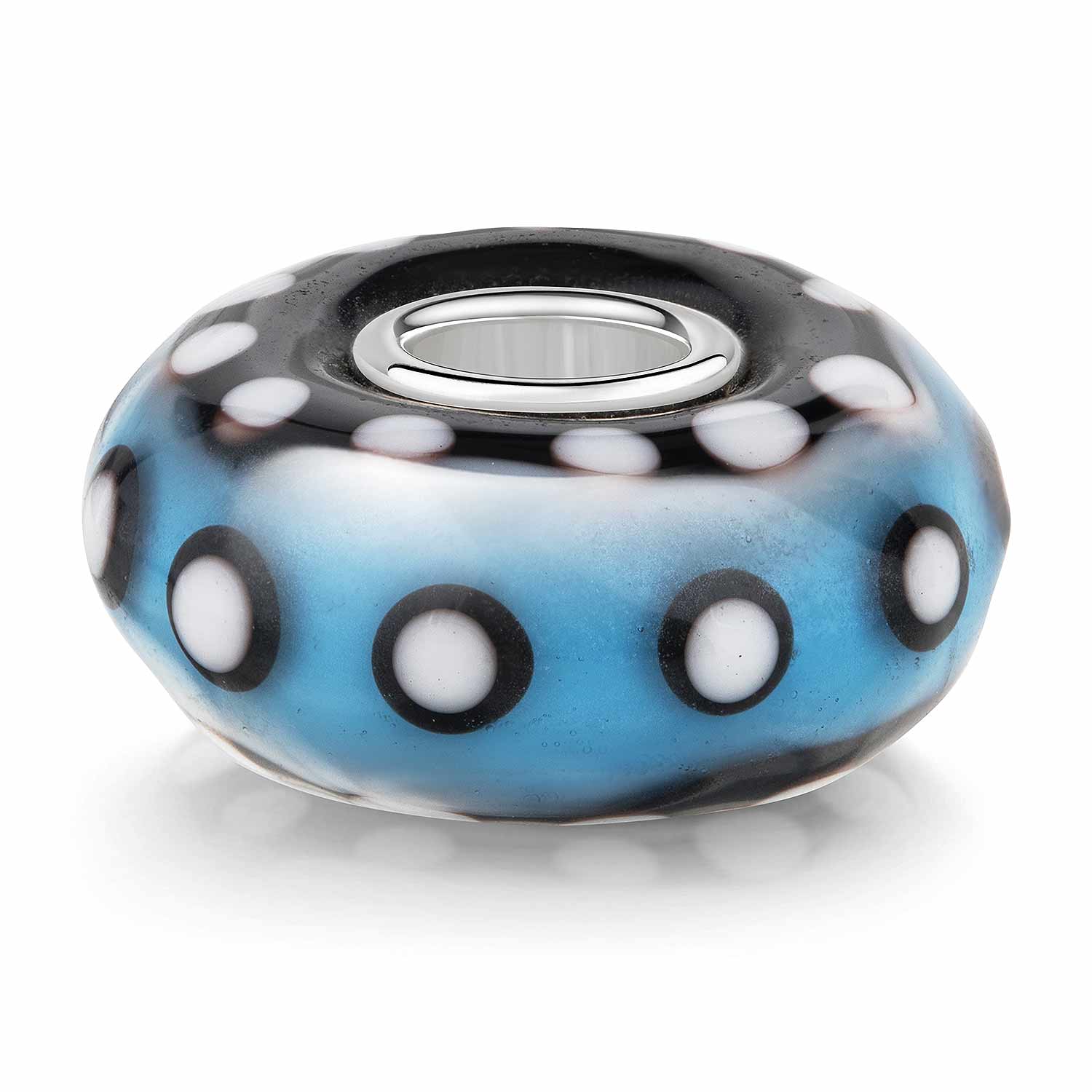 Glas Bead in Blau und Schwarz mit weißen Punkten. Er ist zusätzlich mit einer 925 Silber Hülse ausgestattet. Das Glas Element ist passend zu allen gängigen Beads Armbändern und Ketten bis max. 4,4mm Breite und ist daher für alle Marken Beads geeignet.