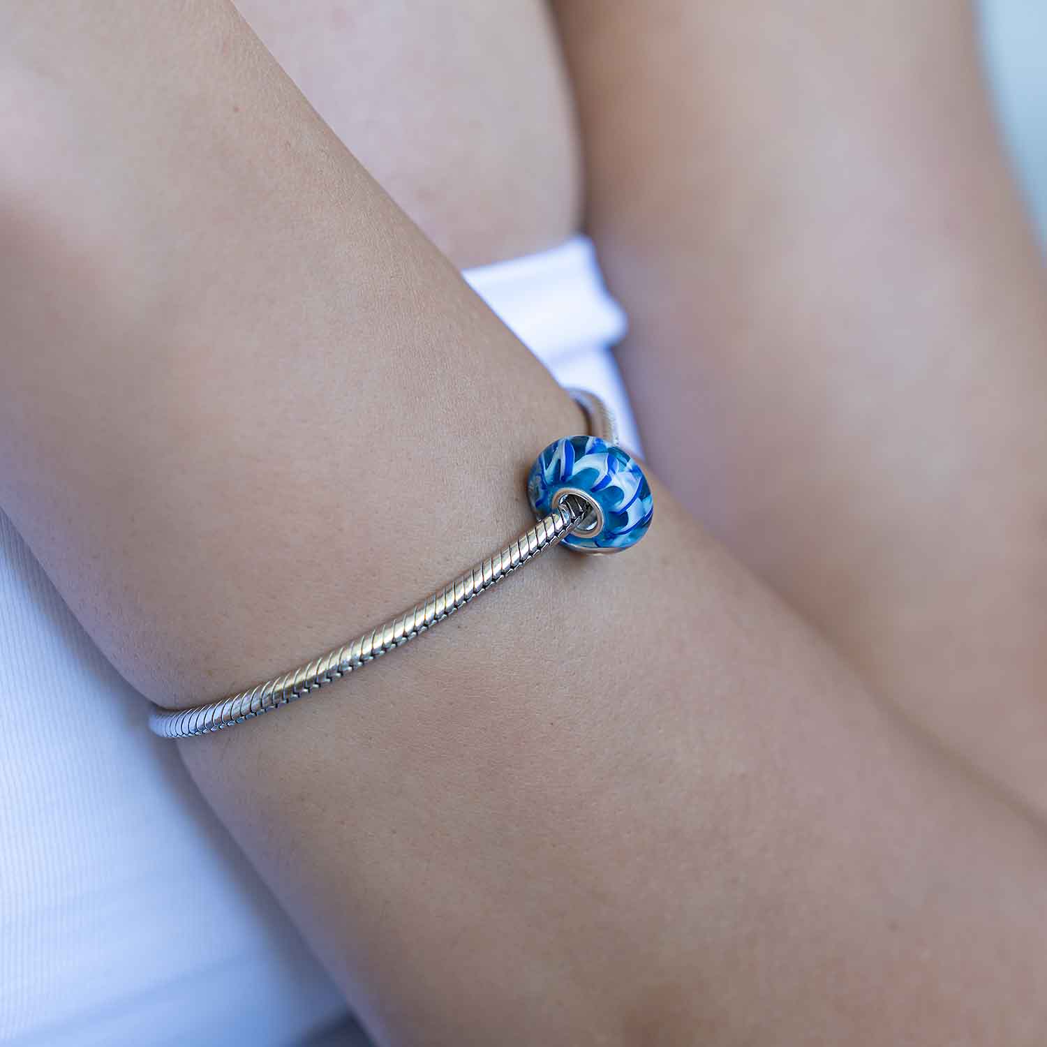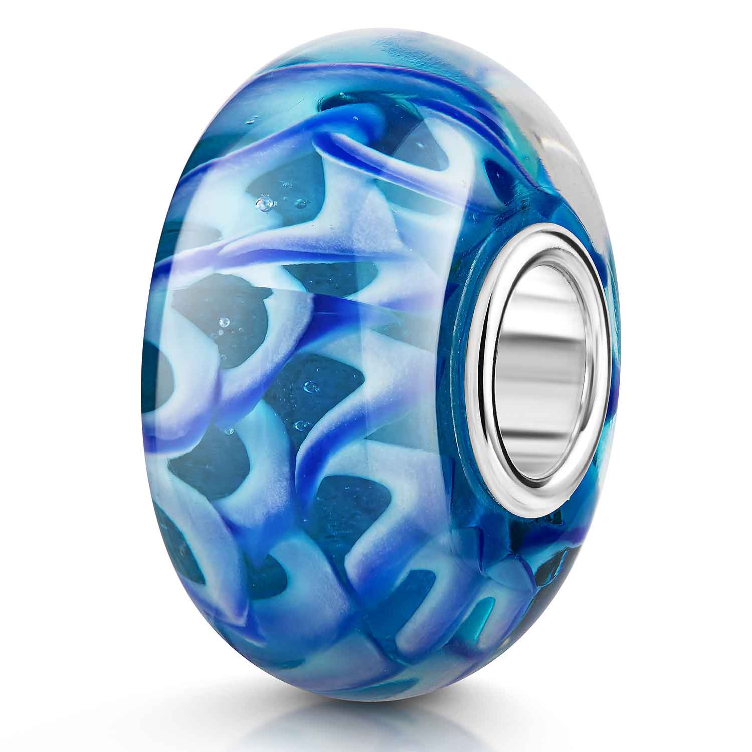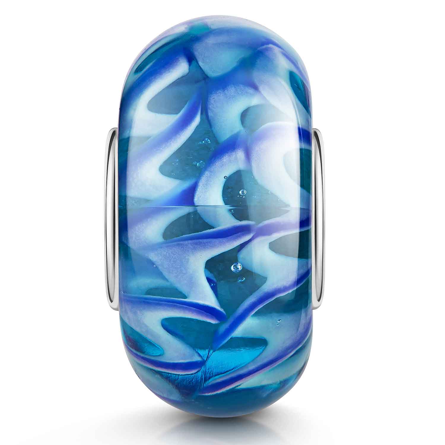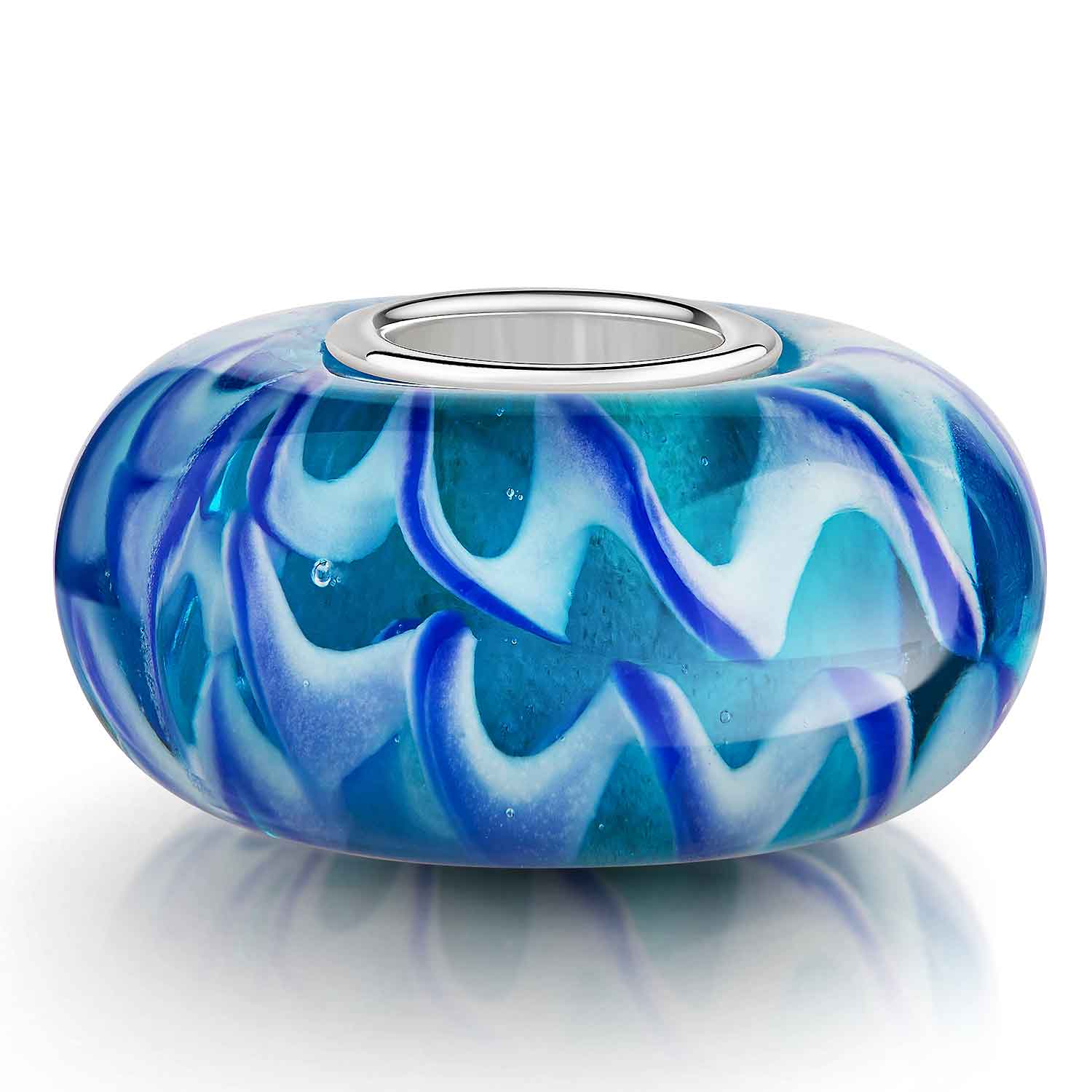 Glas Bead mit weiß-blauem Wellen Muster. Dieses Bead Element ist kompatibel zu allen Beads Armbändern & Ketten mit einer max. Stärke von 4,4mm.