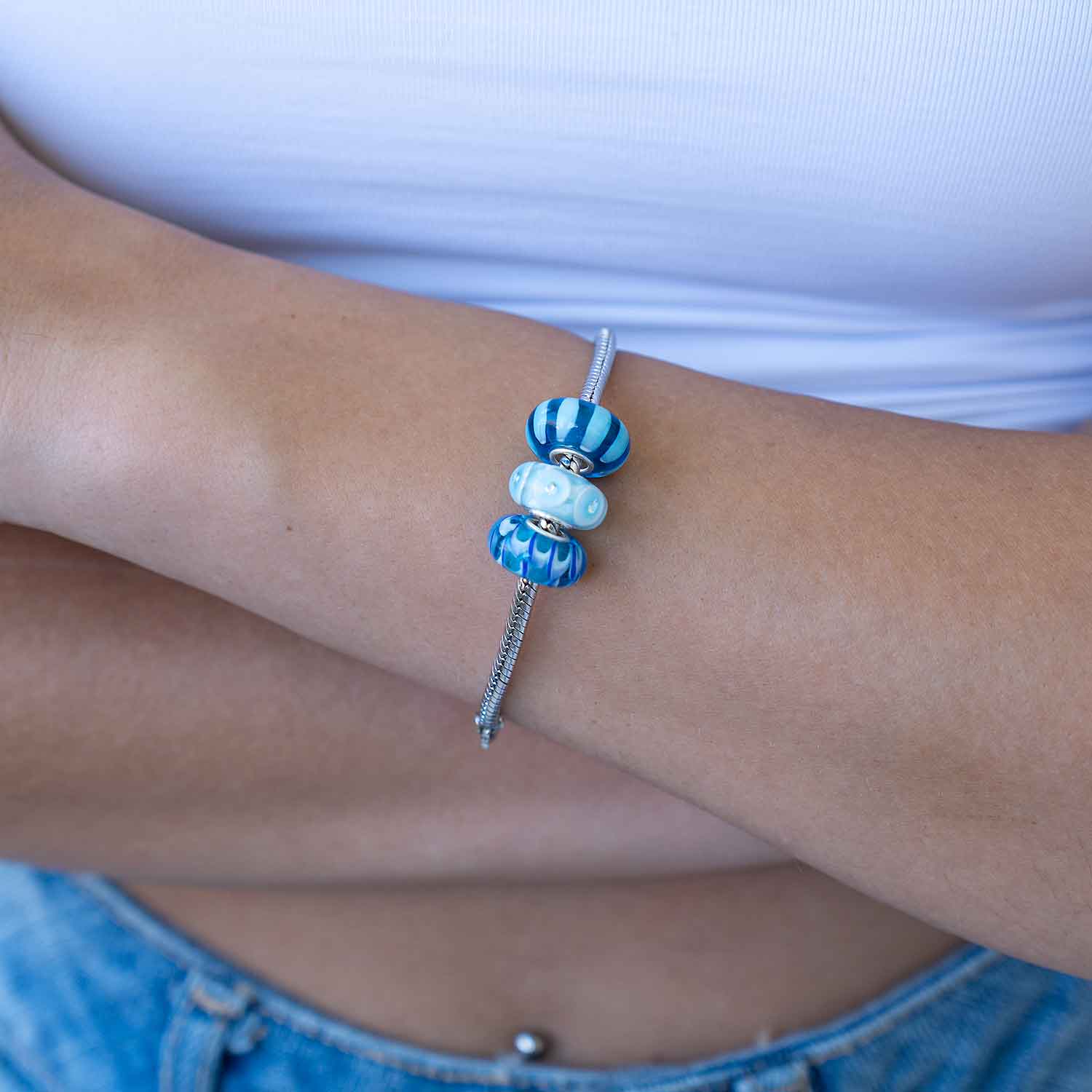 Dieser Glas Bead in blau, aus unserer European Beads Kollektion, bringt Abwechslung auf Ihr Beadsarmband. Die besonderer Machart mit Wellenmuster in diversen Blautönen, wird sie dabei begeistern. Tragen Sie diesen Bead an einem Armband oder als edlen Beads Kettenanhänger.