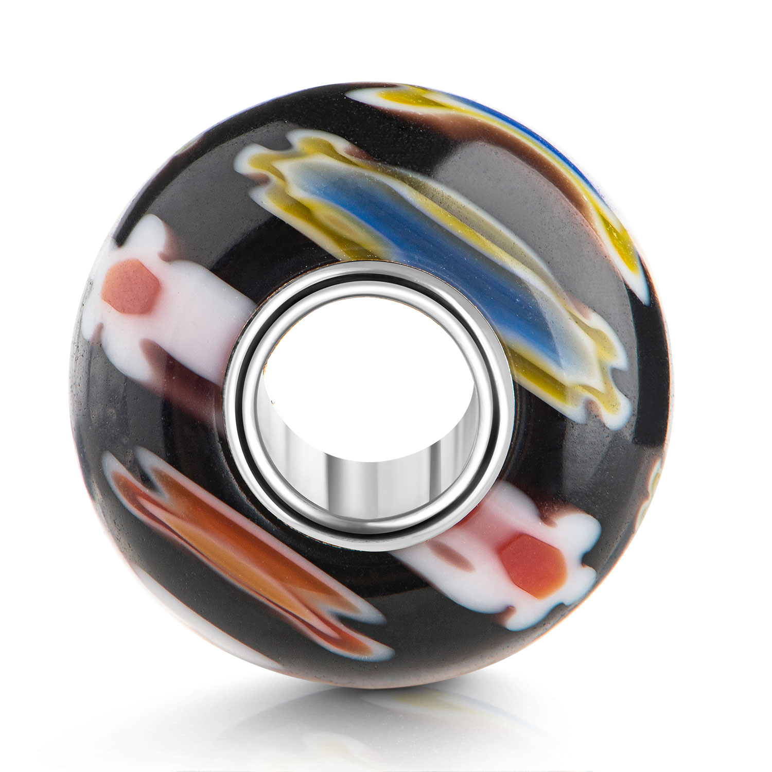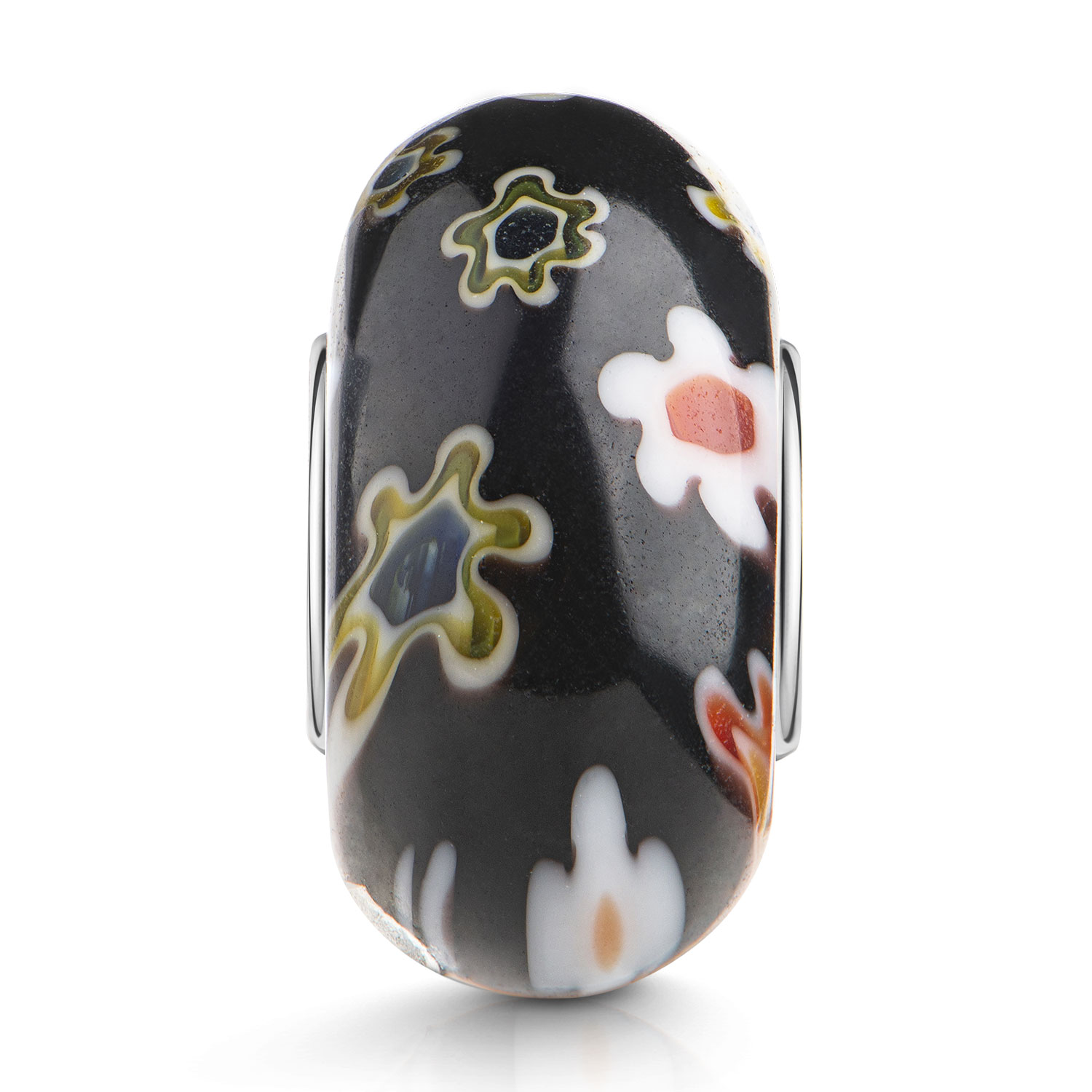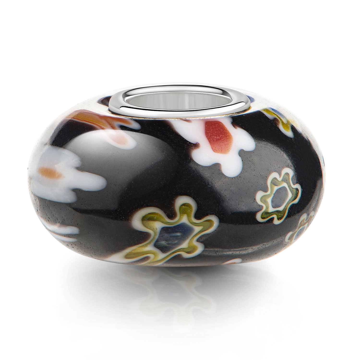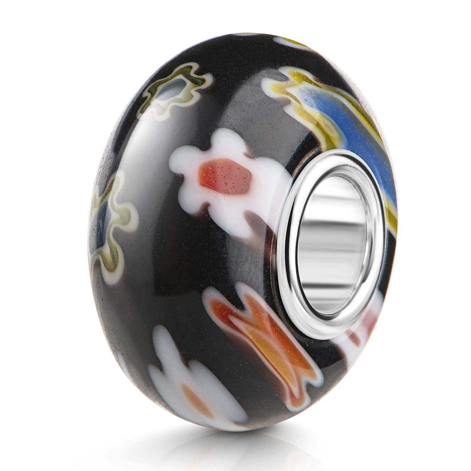 Schwarzer Glas Bead mit zahlreichen bunten Blumen. Diese Glas Perle ist passend auf alle Beads Armbänder und Ketten mit einer max. Stärke von 4,4mm.