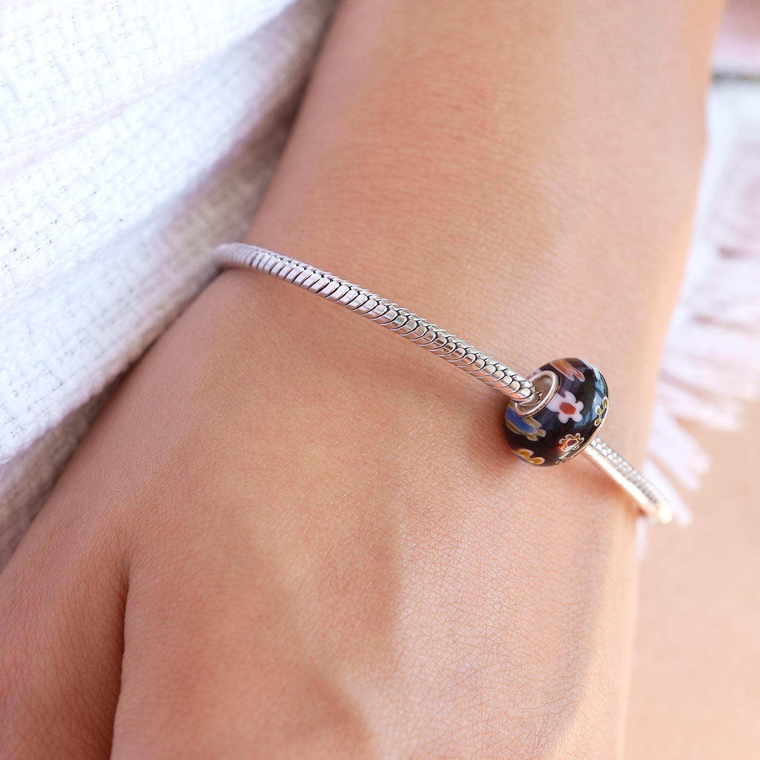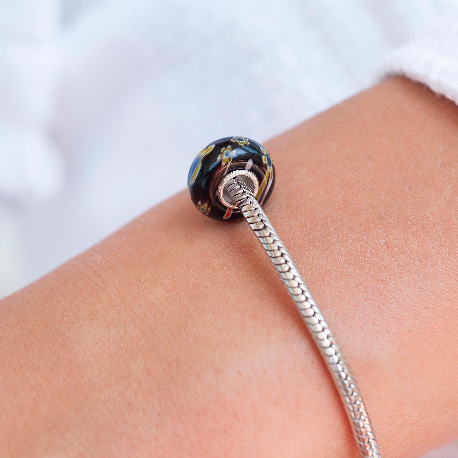 Wunderschöner Glas Bead mit fantastischen bunten Blumen Motiven auf schwarzem Untergrund. Der Bead ist mit einer Hülse aus 925 Sterling Silber ausgestattet. Er eignet sich für alle handelsüblichen Beads Armbänder und Ketten bis max. 4,4mm Breite und ist auch für alle gängigen großen Beads Marken geeignet.