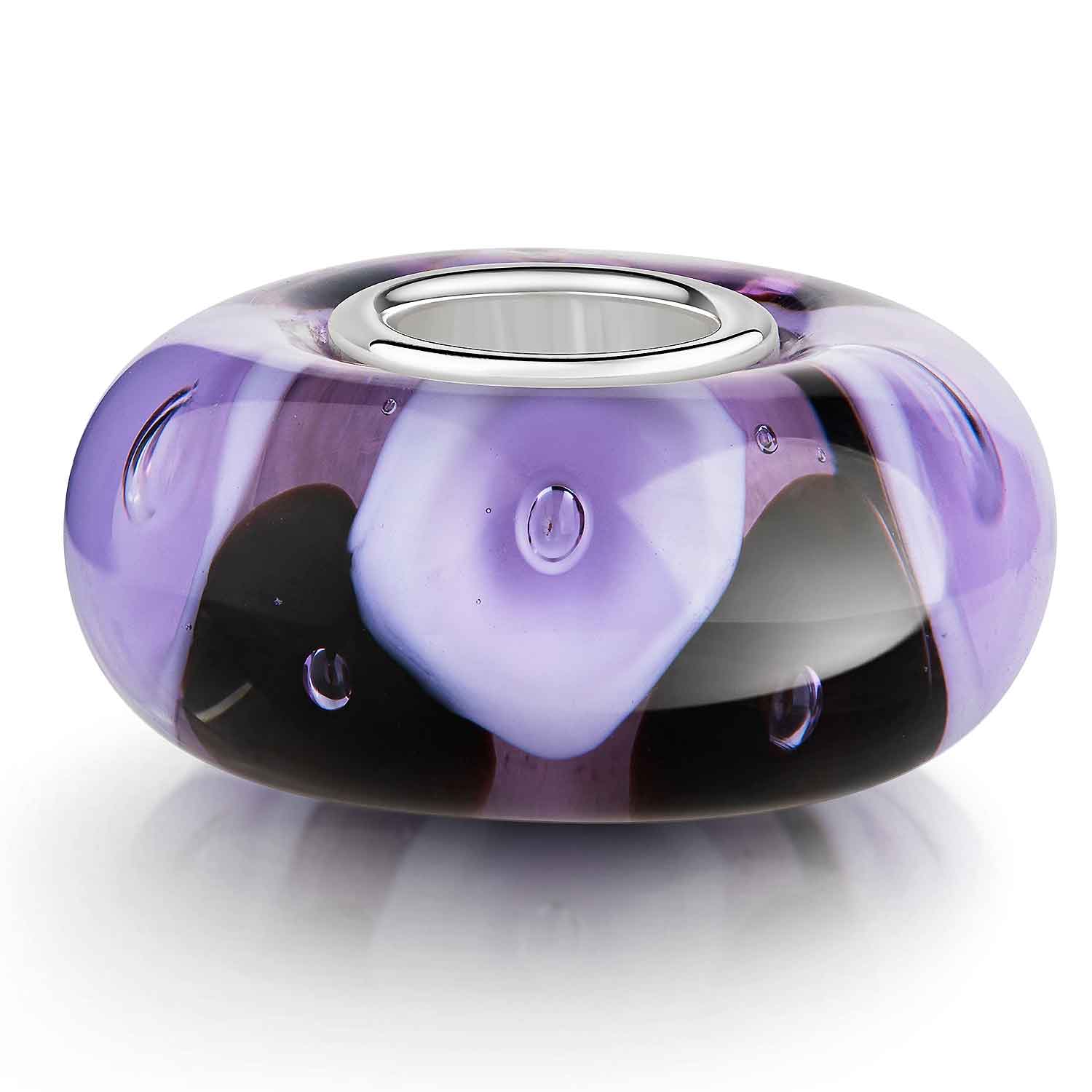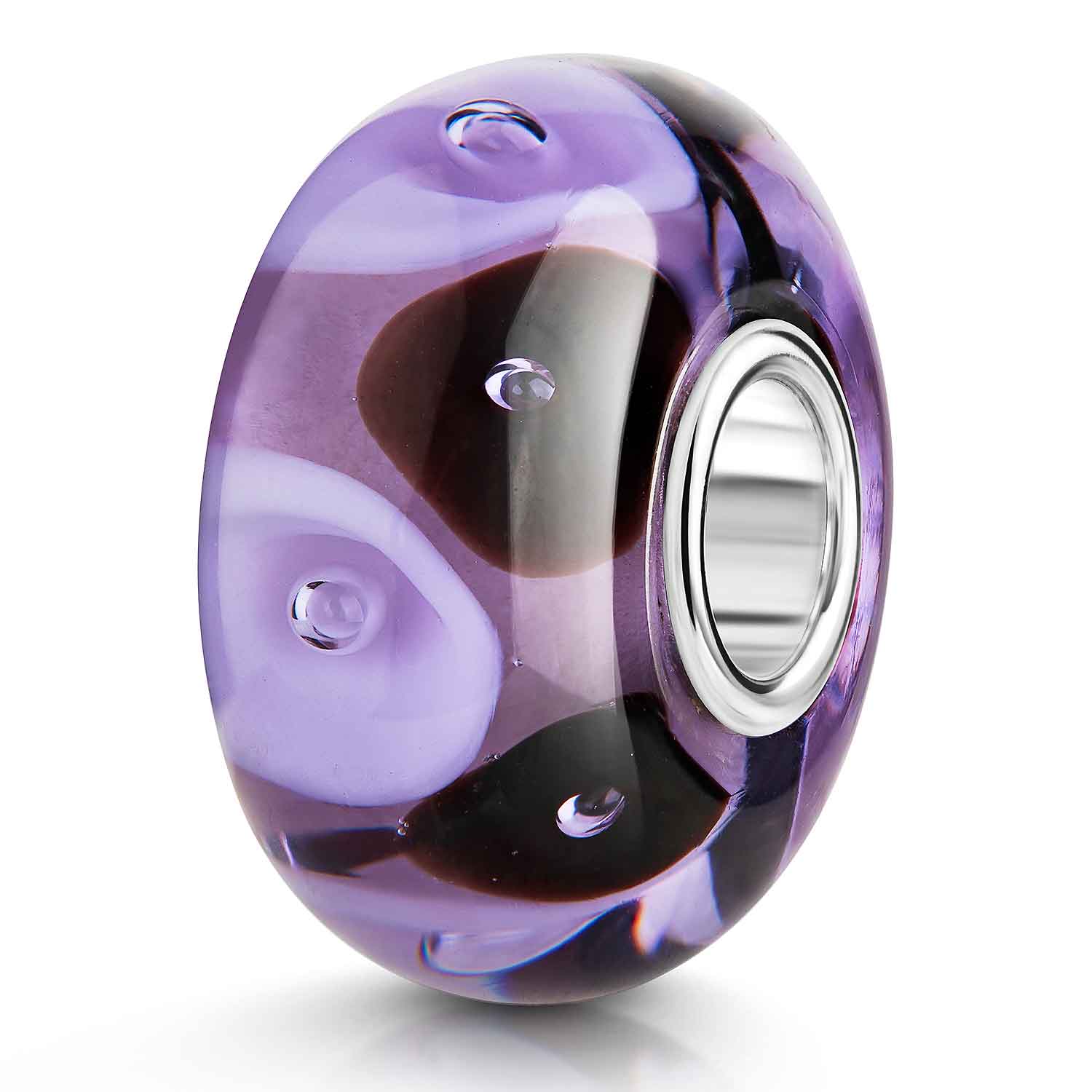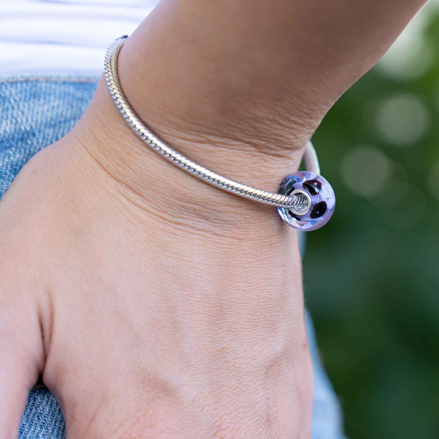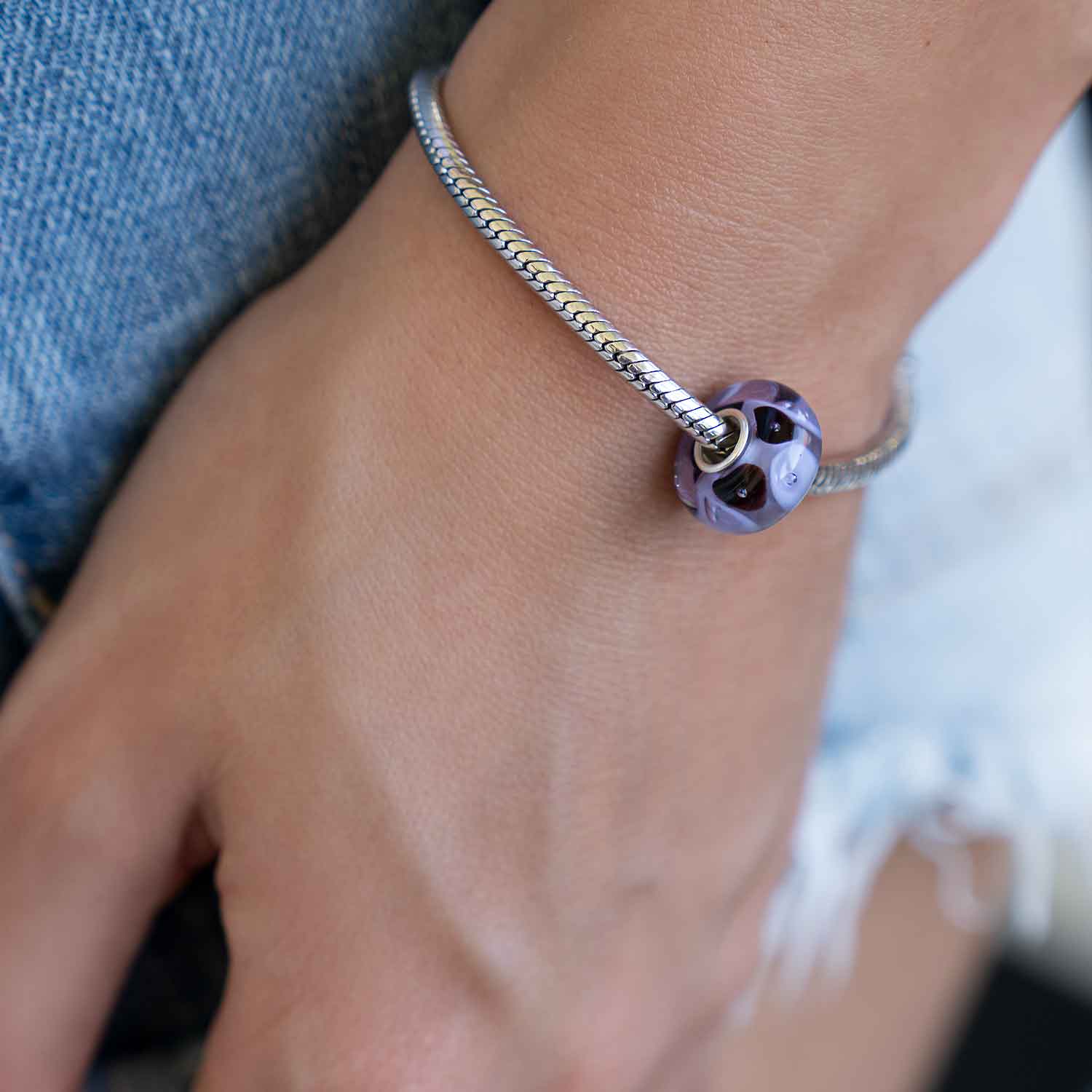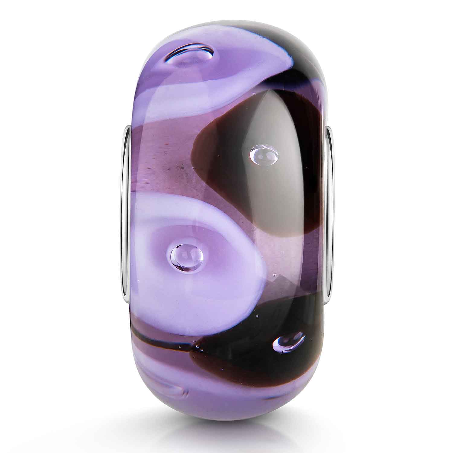 Lila Glas Bead mit Kreisen in Flieder und Dunkelrot sowie kleinen Luftblasen im Glasinneren. Der Bead mit 925 Silber Hülse passt an alle Beads Armbänder und Ketten mit einer max. Stärke von 4,4mm.