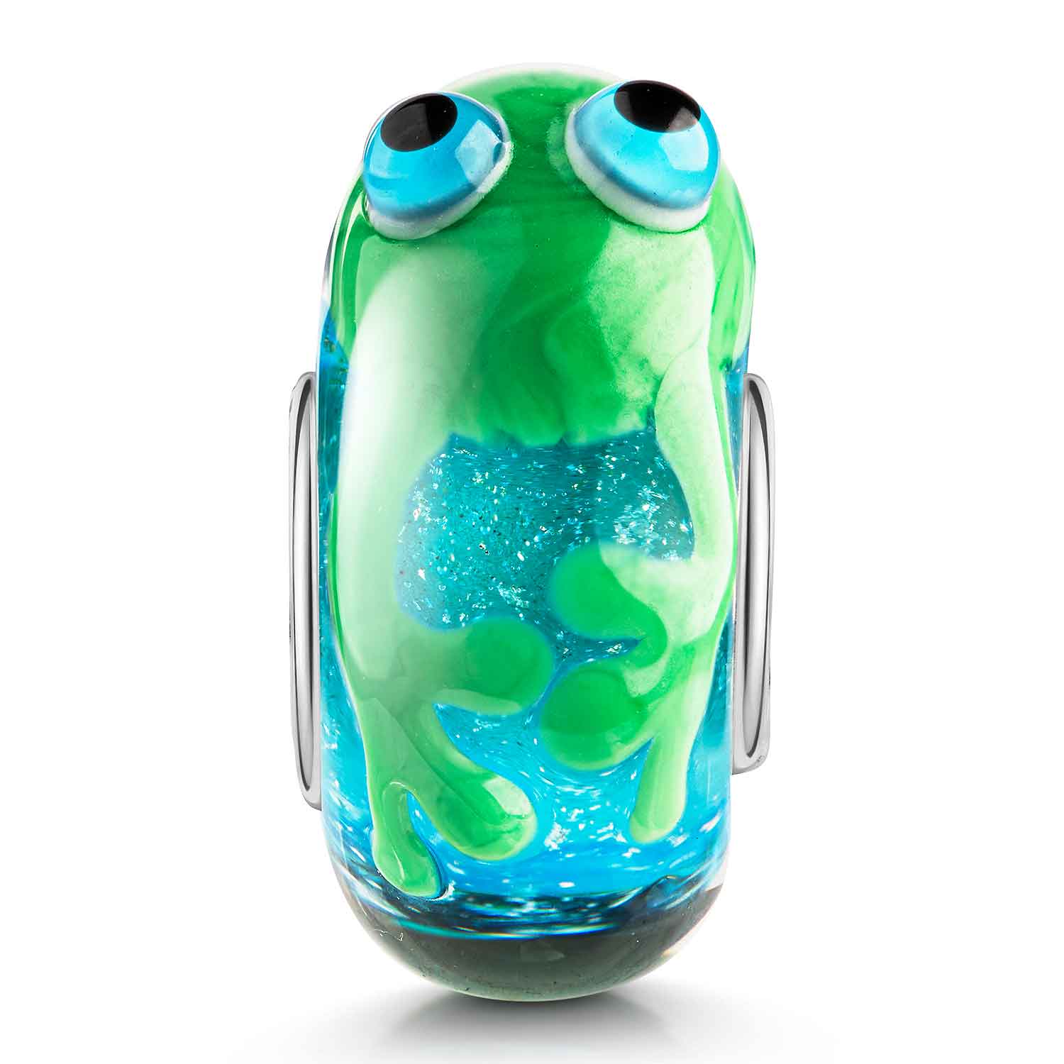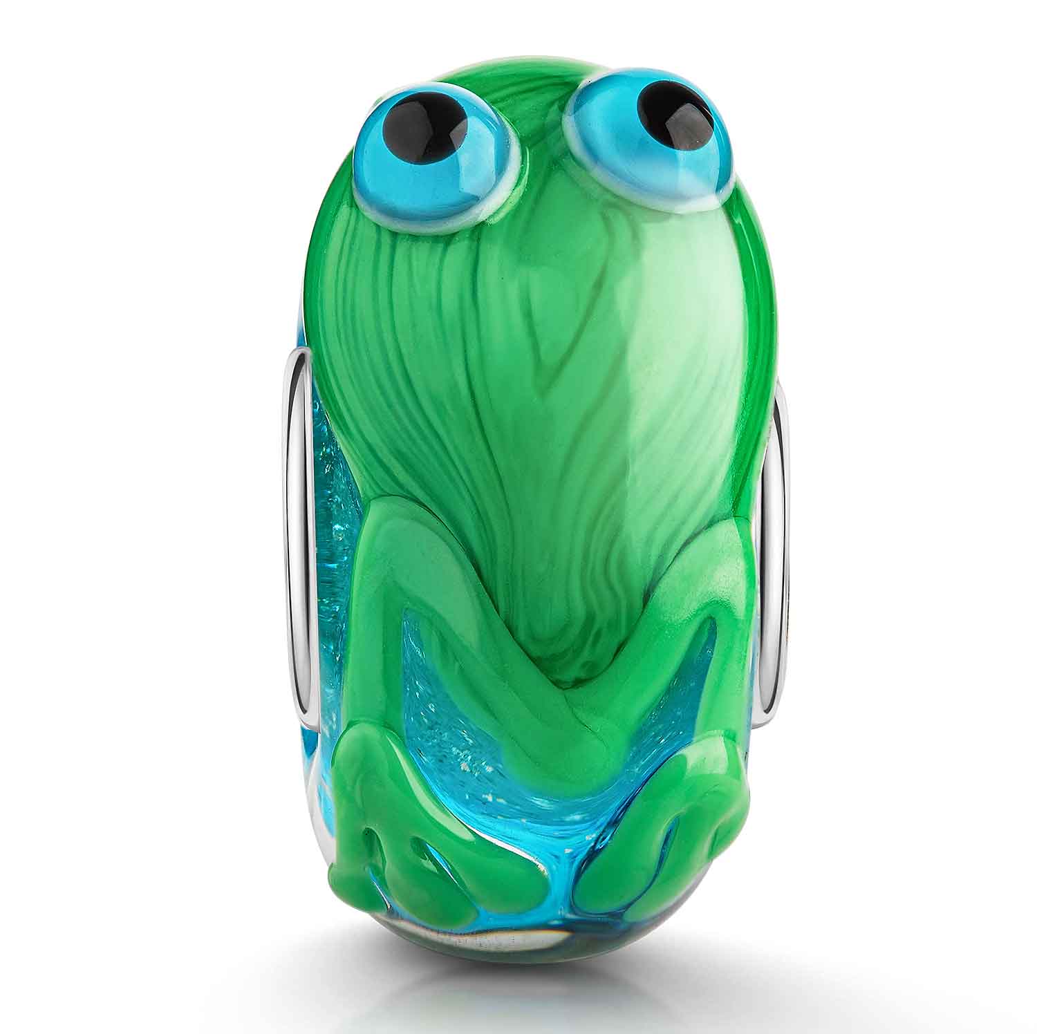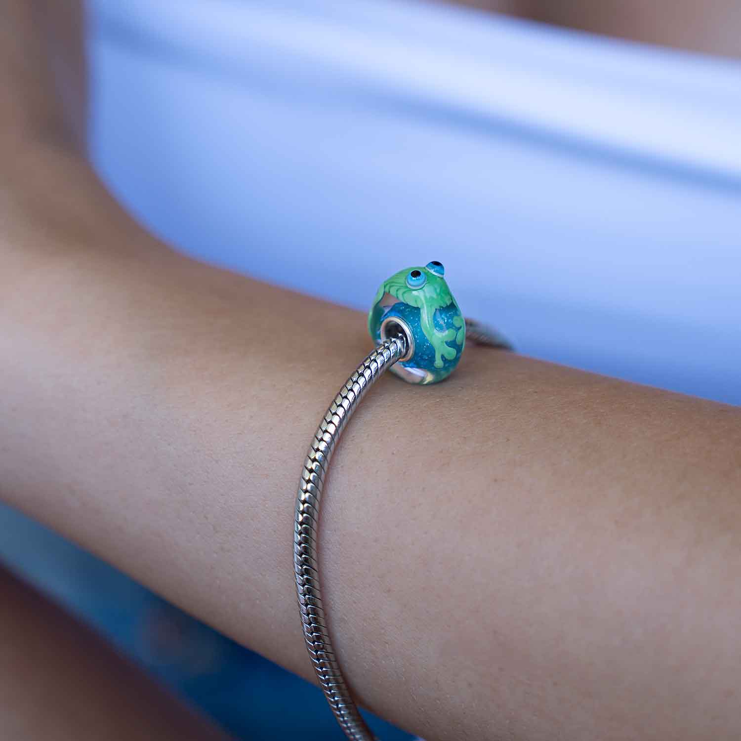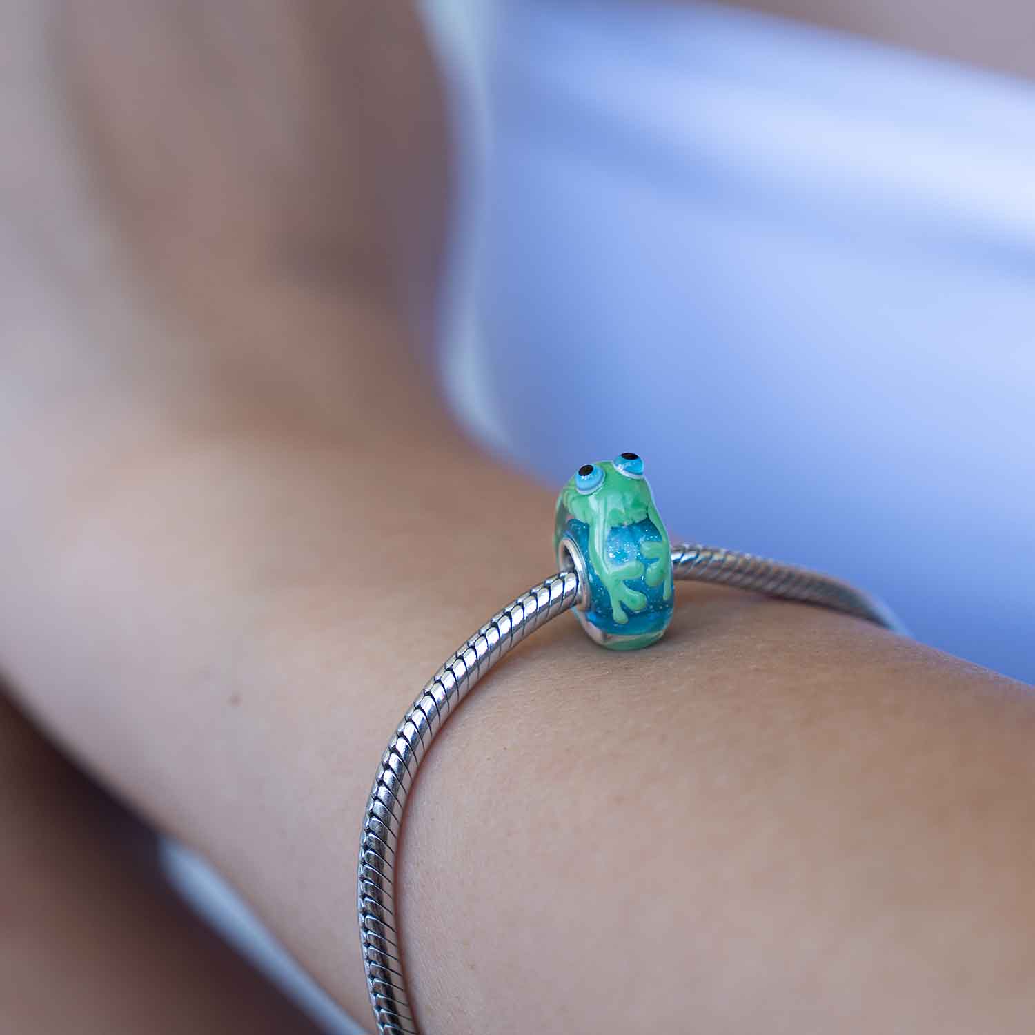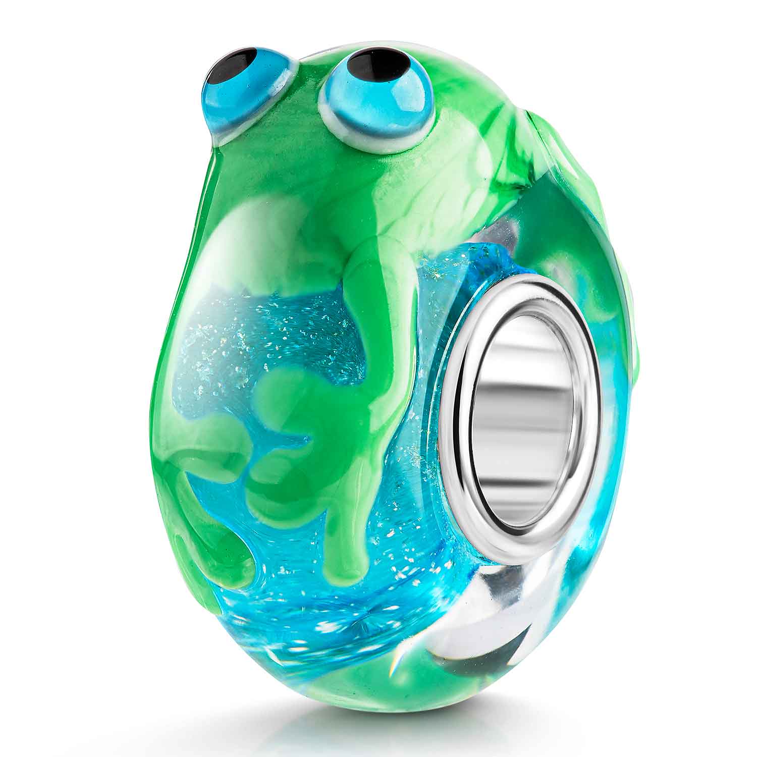 Wunderschöner Frosch Glas Bead in Türkis und Grün wird durch sein 3D Motiv zum Blickfang an Ihrem Armband und ist mit einer Hülse aus reinem 925 Silber ausgestattet. Weitere 3D Tier Beads in unserem Sortiment vorhanden.