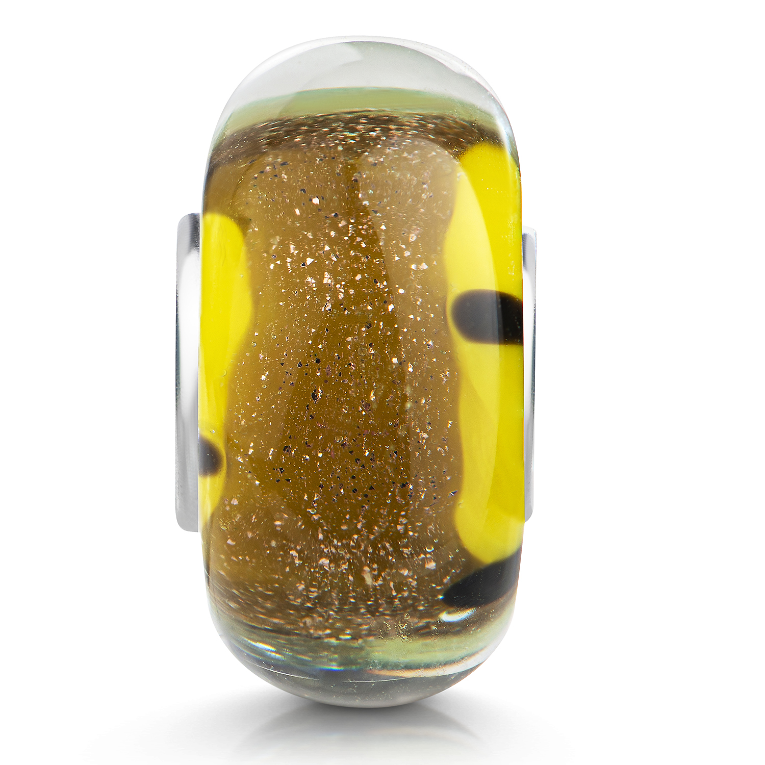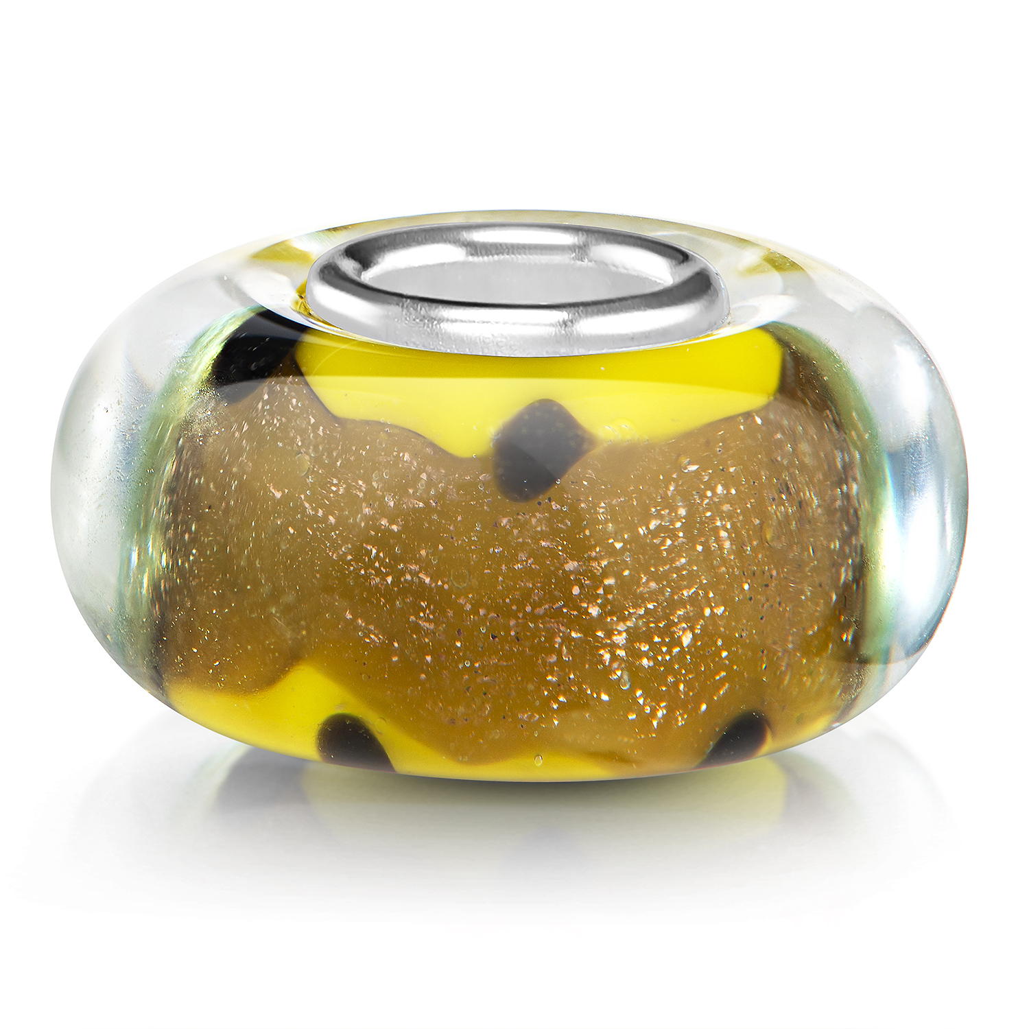 Gelber Glas Bead mit Goldglitzer im Glasinneren sowie einer Punktmusterung. Der Bead ist passend zu allen gängigen Schmuck Bead-Armbändern & Ketten anderer großer Marken bis max. 4,4mm Lochdurchmesser.