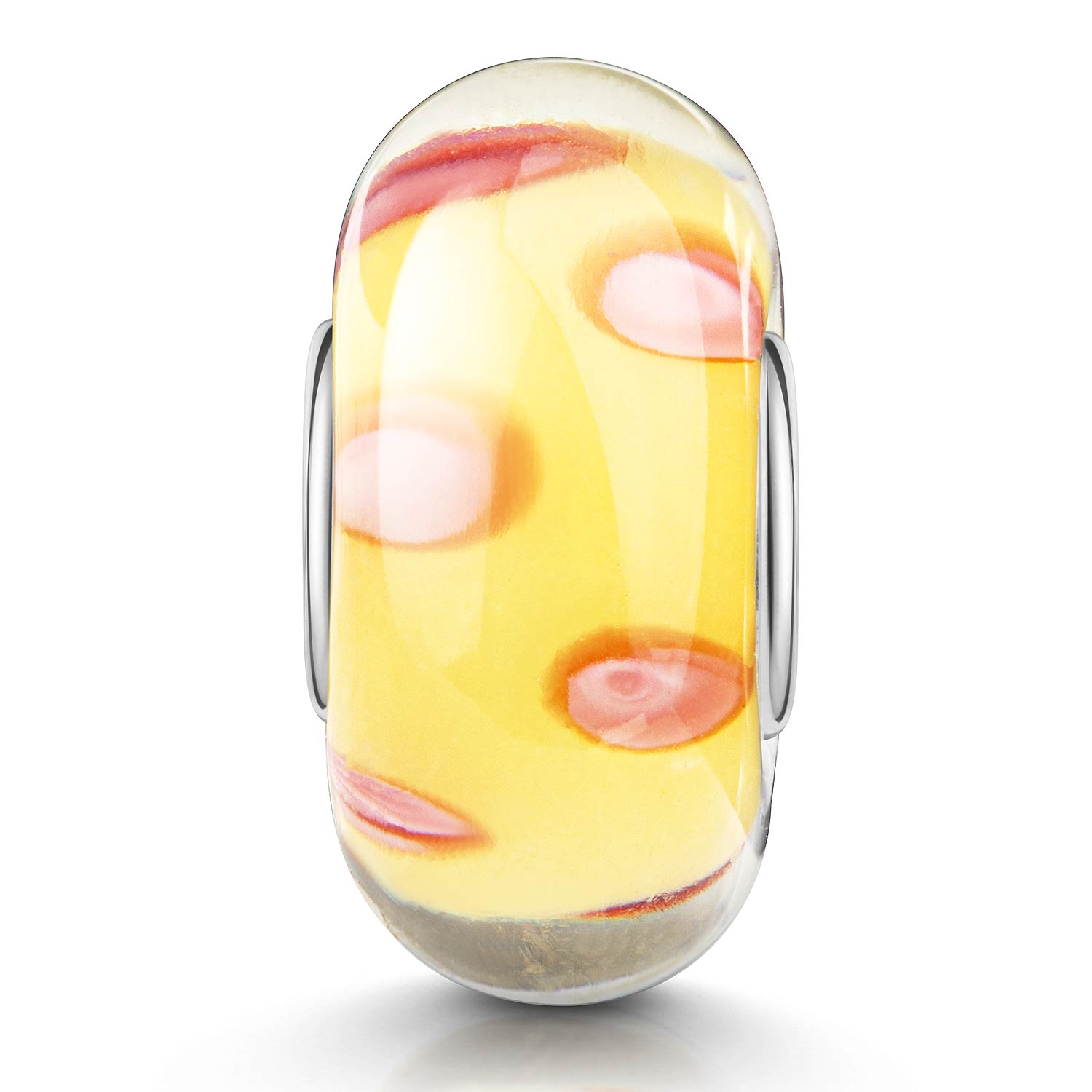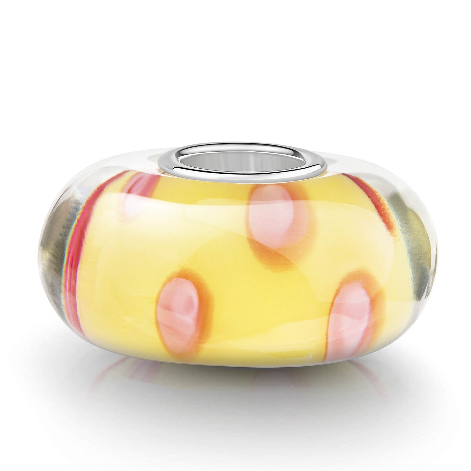 Dieser gelbe Glas Bead ist mit rosa Punkten verziert. Die Hülse besteht aus 925 Sterling Silber und ist passend für alle Armbänder und Ketten bis max 4,2mm Durchmesser.