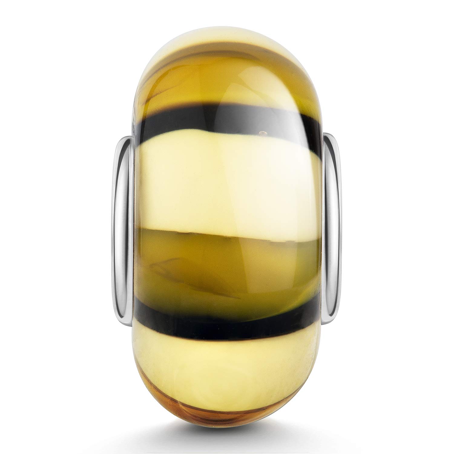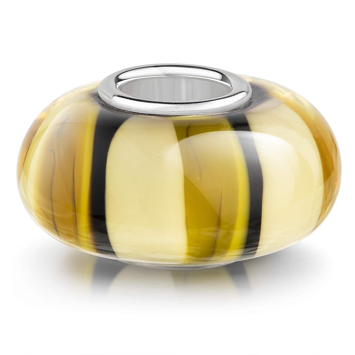 Gestreifter Glas Bead in Gelb, Weiß und Braun mit einer hochwertigen Hülse aus 925 Sterling Silber. Der Bead ist kompatibel mit allen handelsüblichen Beads Armbändern und Ketten bis max. 4,4mm Breite und ist ebenfalls für alle gängigen großen Beads Marken geeignet.