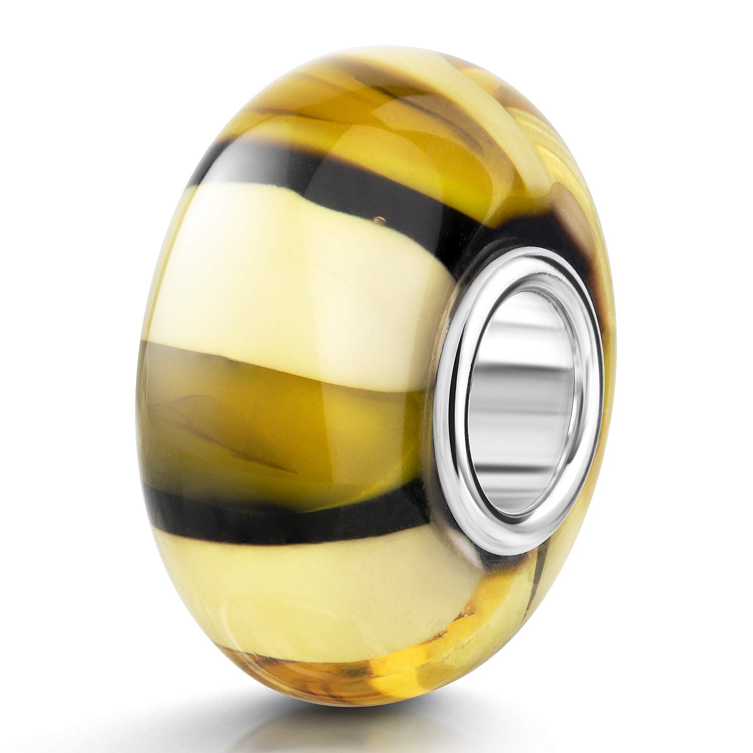 Gestreifter Glas Bead in Gelb, Braun und Weiß mit 925 Silber Hülse. Der Bead passt auf alle Beads Armbänder und Ketten mit einer max. Stärke von 4,4mm.