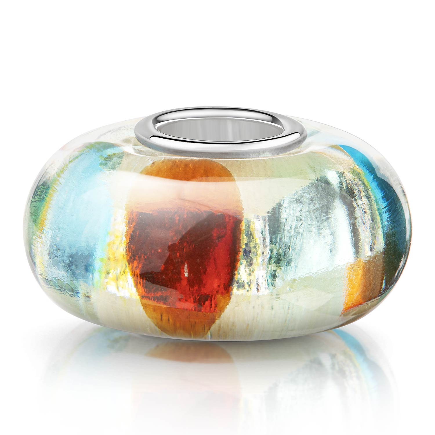 Zart schimmernder Glas Bead mit silberner Glitzerfolie im Glasinneren und Punkten in Blau, Türkis und Orange. Die Glasperle ist zusätzlich mit einer Hülse aus massivem 925 Sterling Silber mit Silberstempel ausgestattet und passt zu allen gängigen Beads Armbändern und Ketten bis max. 4,2mm Breite.