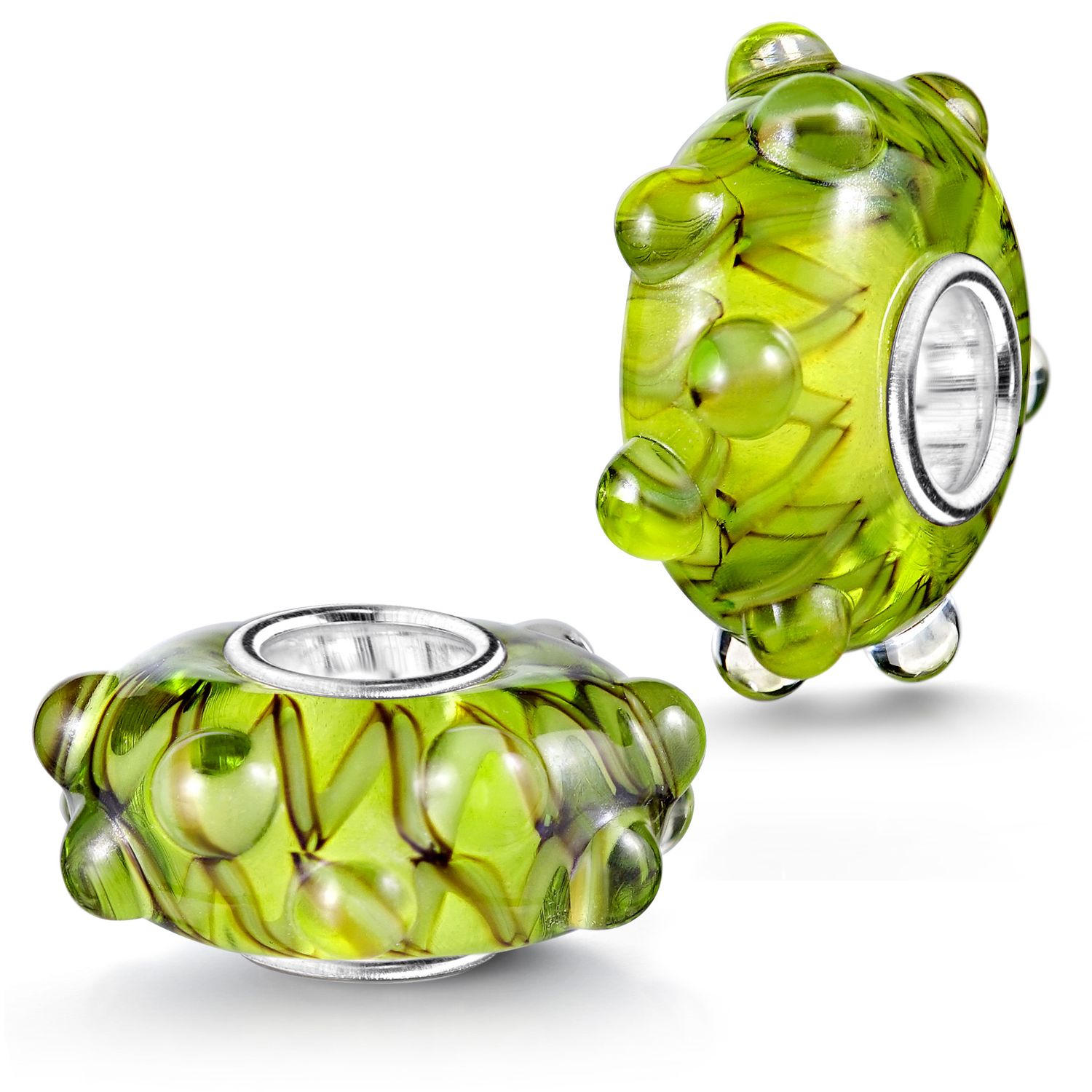 Außergewöhnlicher 3D Glas Bead gefertigt mit einer Hülse aus 925 Sterling Silber ausgestattet. Im Inneres des Glas Beads können Sie ein phantasievolles grünes Muster erkennen. Der Bead ist passend zu allen handelsüblichen Armbändern und Ketten bis max. 4,4mm Durchmesser und ist kompatibel zu allen großen Herstellern.