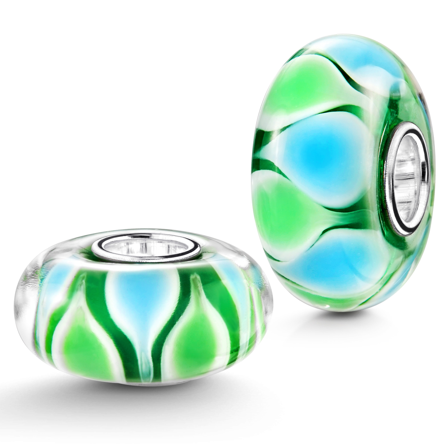 Glas Bead mit grünen und blauen Tupfen. Dieses Glas Bead Modell ist mit einer massivem 925 Silber Hülse ausgestattet und passend auf Armbänder bis 4,4mm.