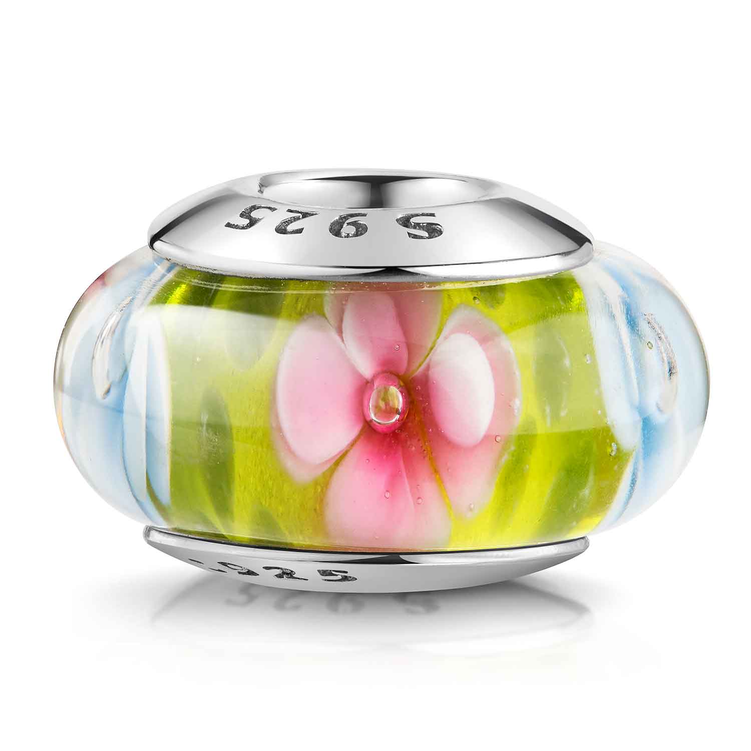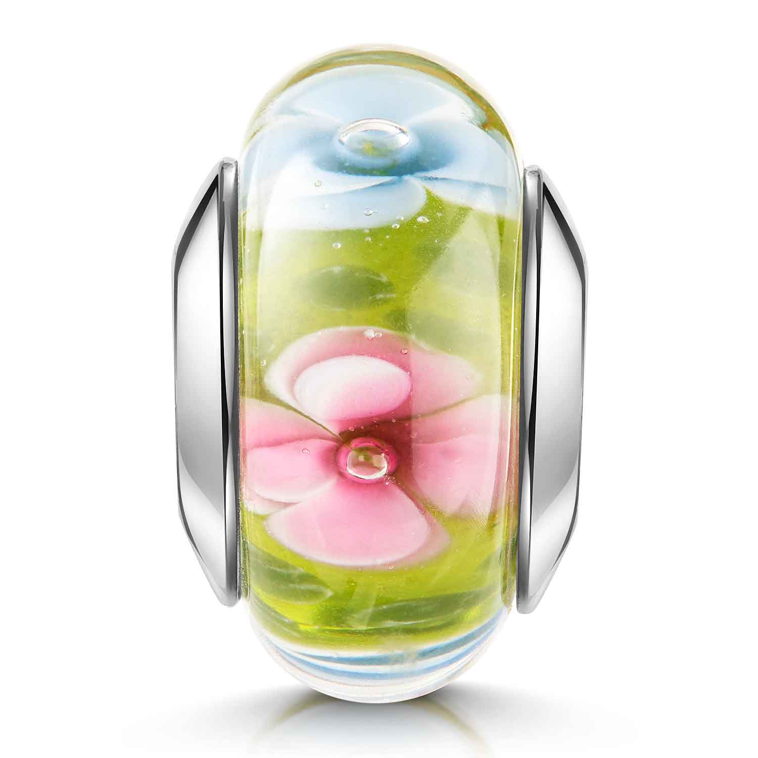 1 x Blüten Glas Charm in Grün, Rosa und Hellblau (ohne Armband) wird in einem Satin Schmuckbeutel geliefert
