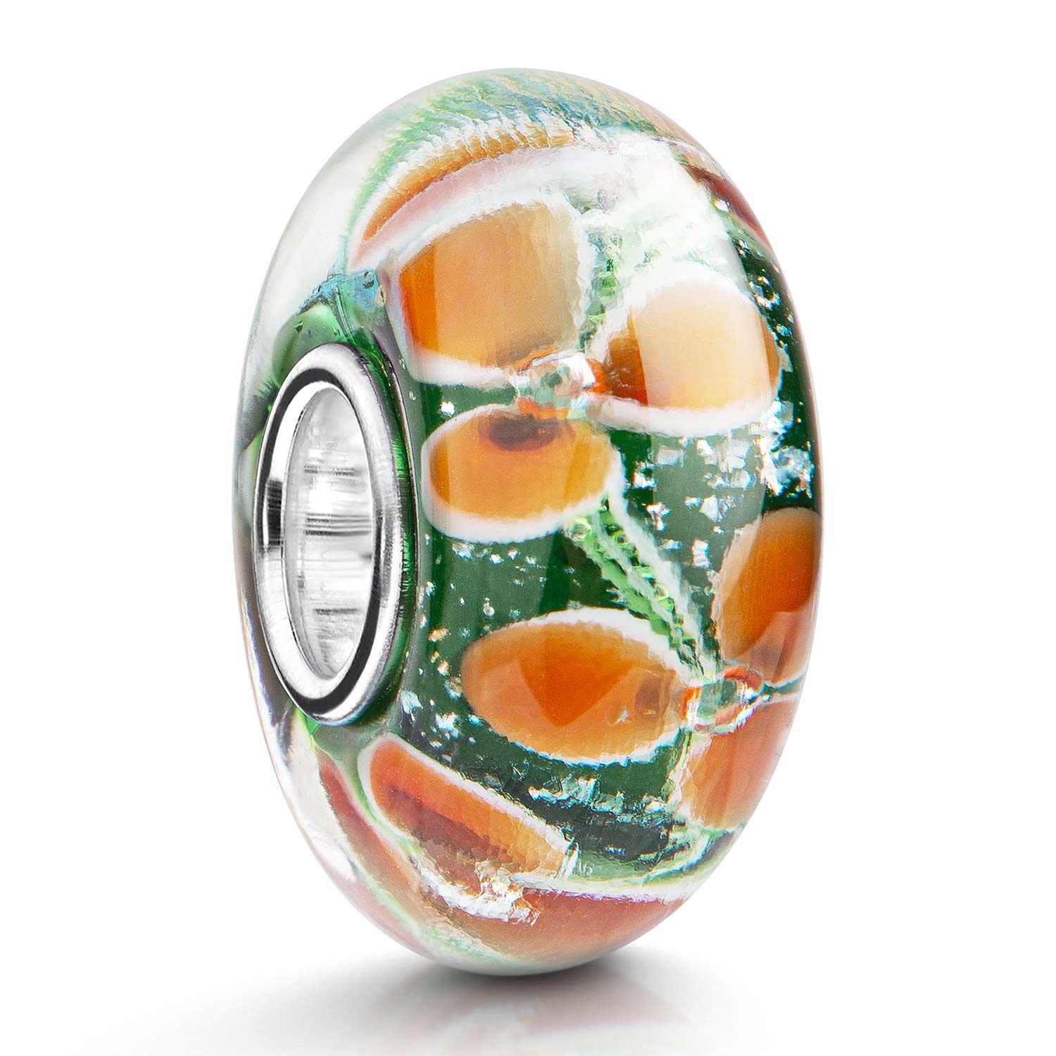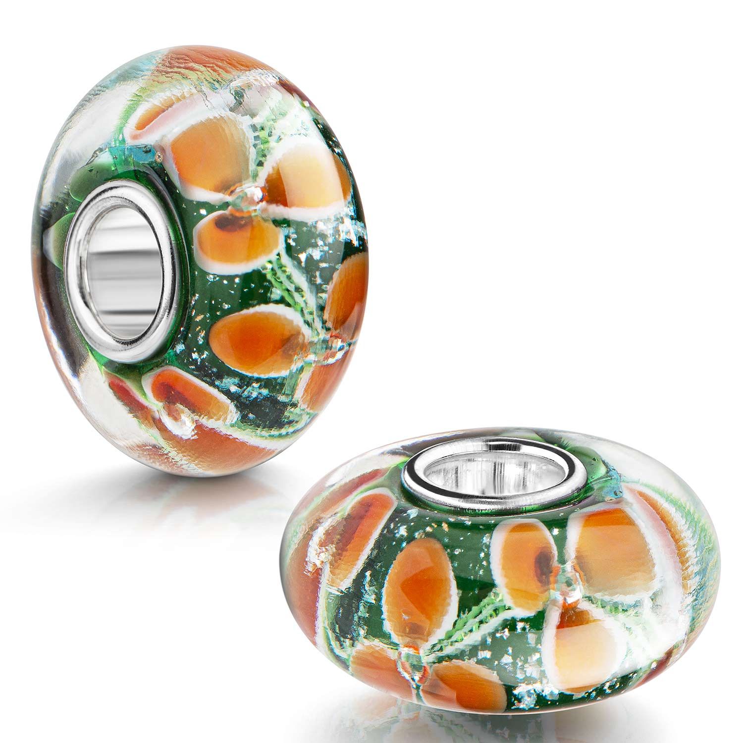 Grüner Glas Bead mit orangenen Blumen und einer Hülse aus 925 Sterling Silber. Die Glasperle ist für Beads Armbänder und Ketten bis max 4,4mm Durchmesser geeignet.