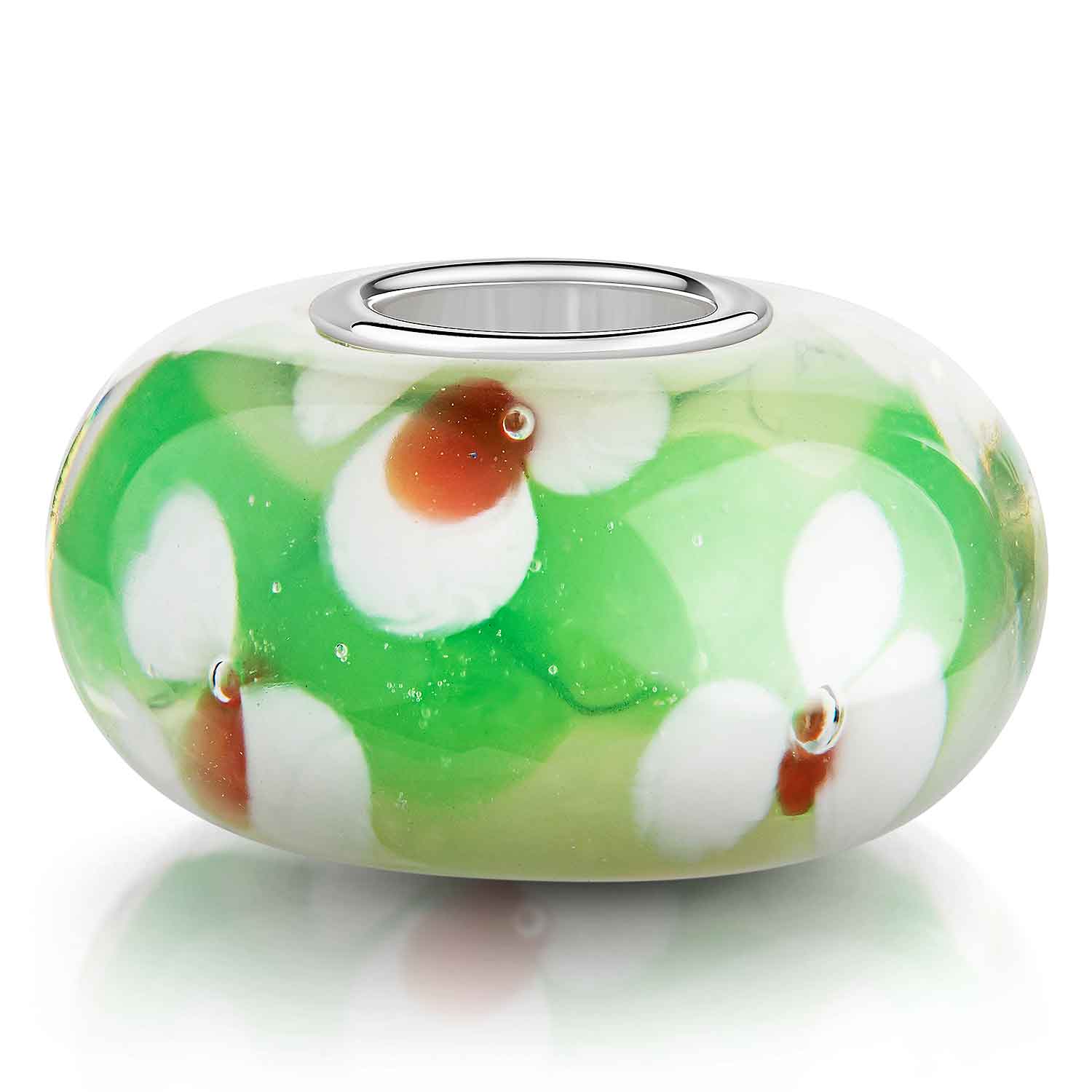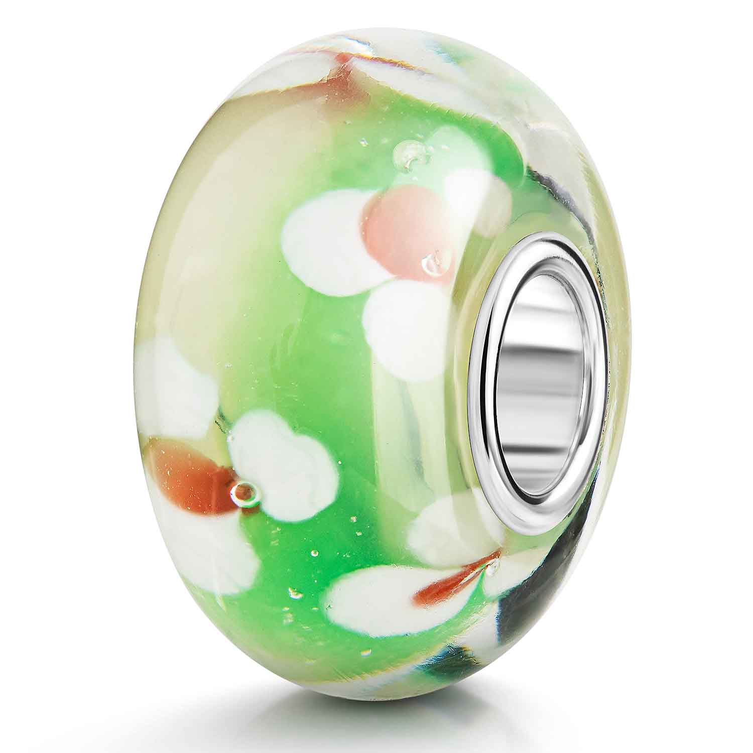 Grüner Glas Bead mit Blumen in Weiß und Rot und einer 925 Silber Hülse. Der Glas Anhänger ist passend auf alle Armbänder bis einer max. Stärke von 4,4mm.