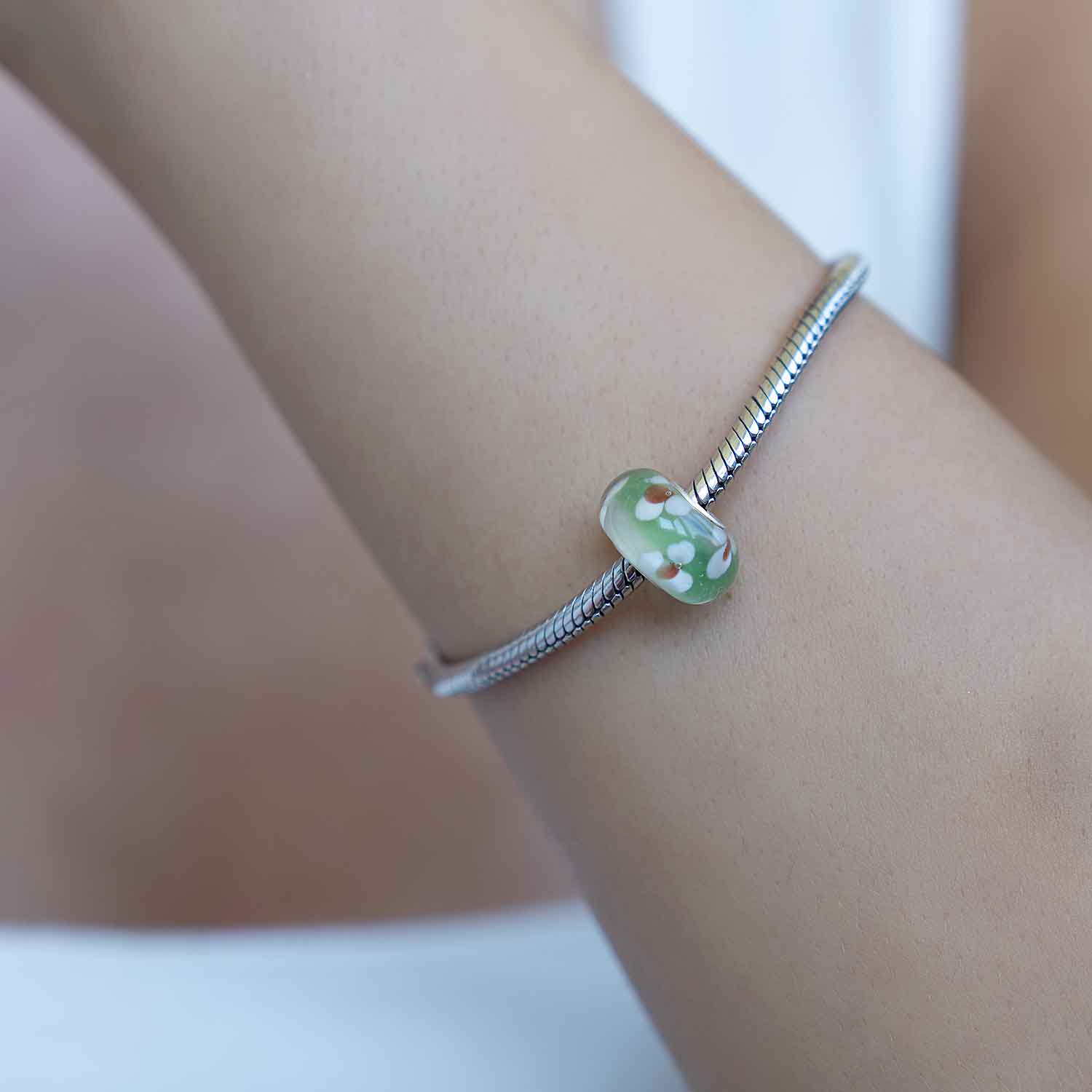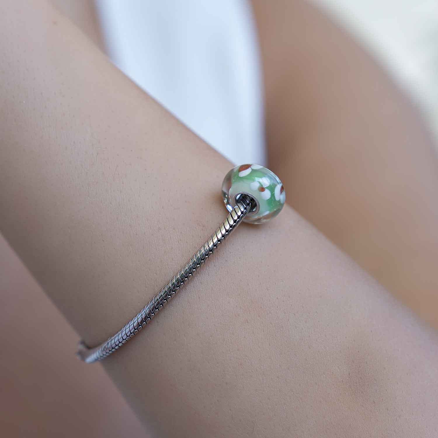 Dieser Glas Bead wird durch seine frischen Farben in Grün und Weiß begeistern und lässt Ihr Beads Armband zu einem richtigen Blickfang werden. Er ist zusätzlich mit einer Hülse aus 925 Sterling Silber ausgestattet. Der Anhänger ist passend zu allen gängigen Beads Armbändern und Ketten bis max. 4,4mm Breite und ist daher auch besonders für alle gängigen großen Beads Marken geeignet.