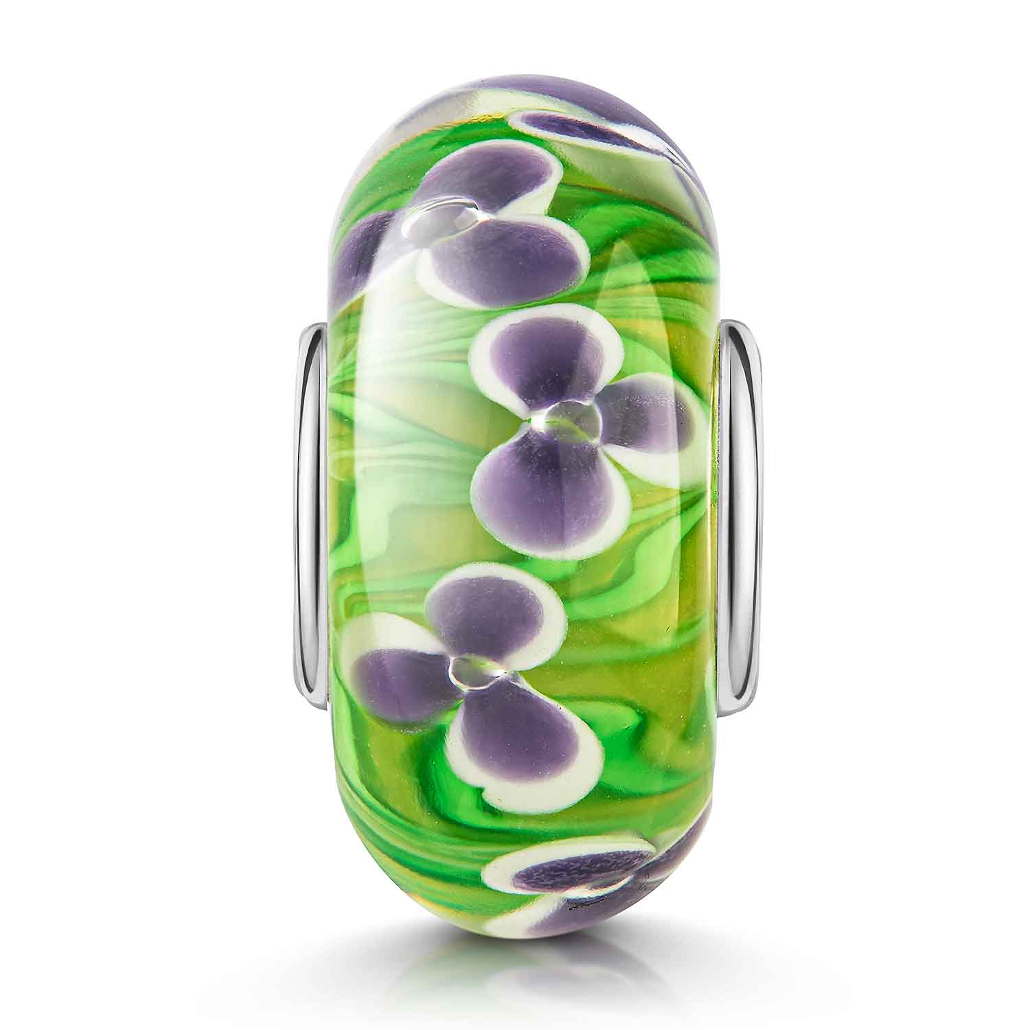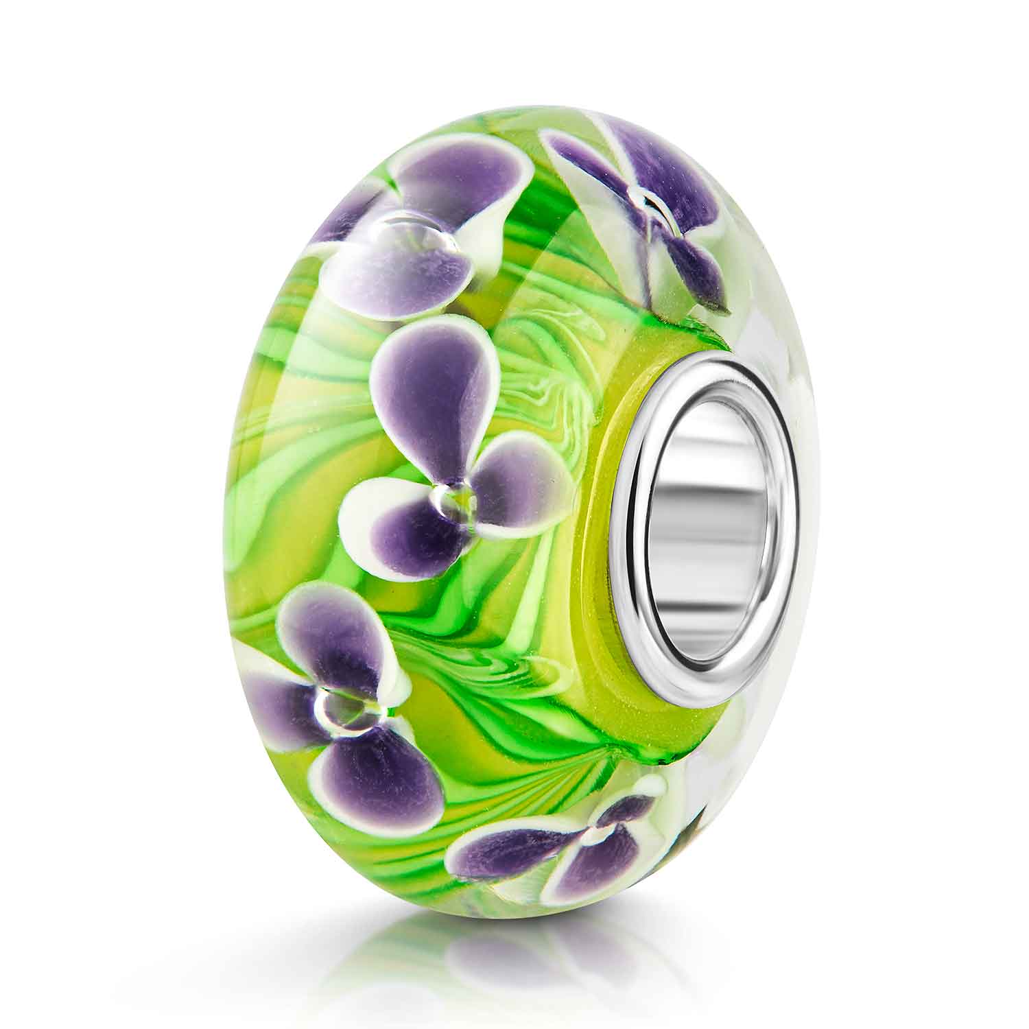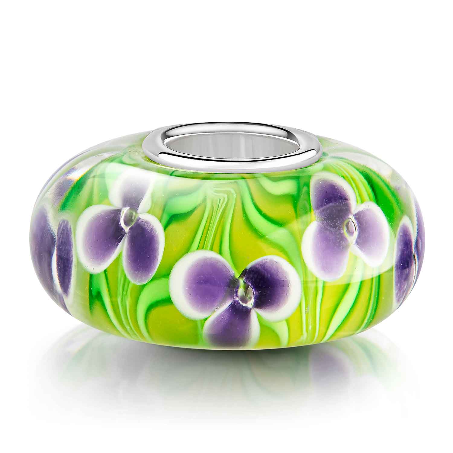 Dieser Glas Bead in den Farben Gelb und Grün und besticht durch die schicken lila-weißen Blütenmotive und erinnert an eine Blumenwiese. Das Glas Bead Element ist mit einer Hülse aus massivem 925 Sterling Silber ausgestattet. Dieser Bead ist passend zu allen gängigen Beads Armbändern und Ketten bis max. 4,4mm Breite/ Durchmesser und ist daher für alle Marken Beads geeignet.