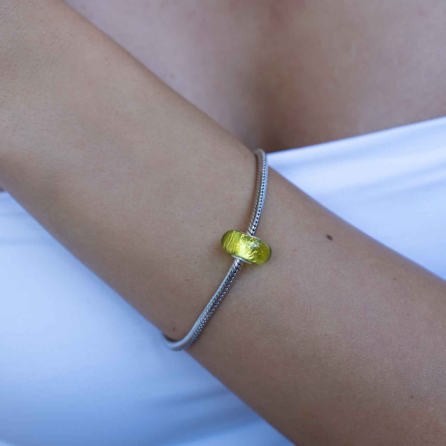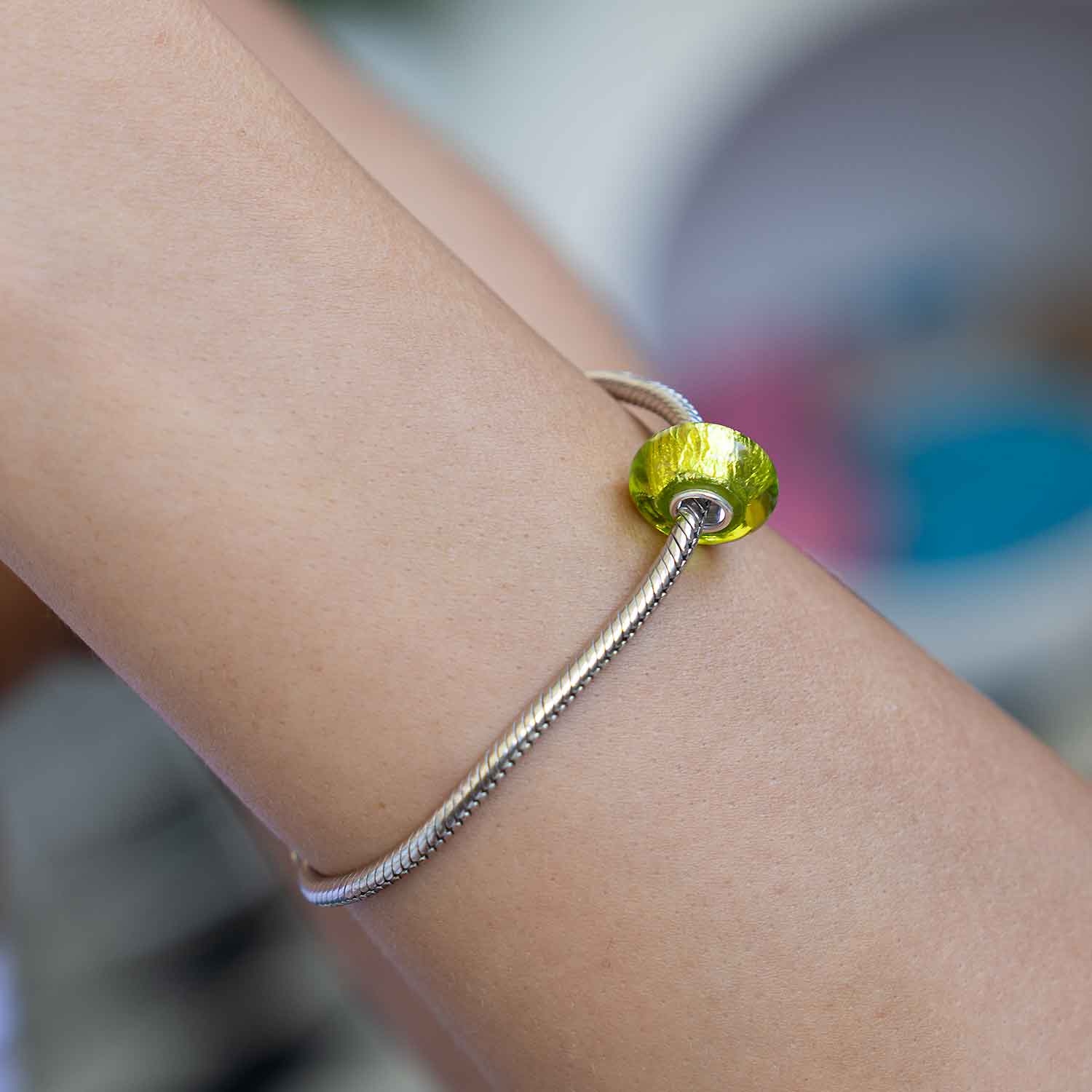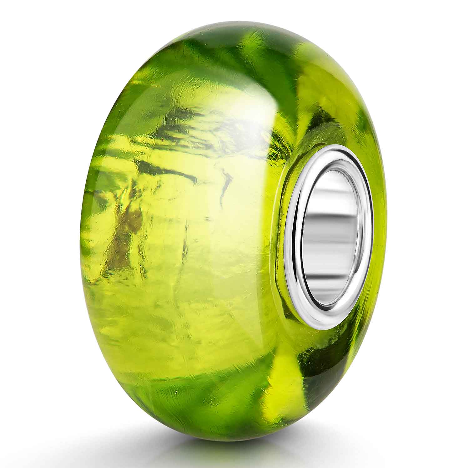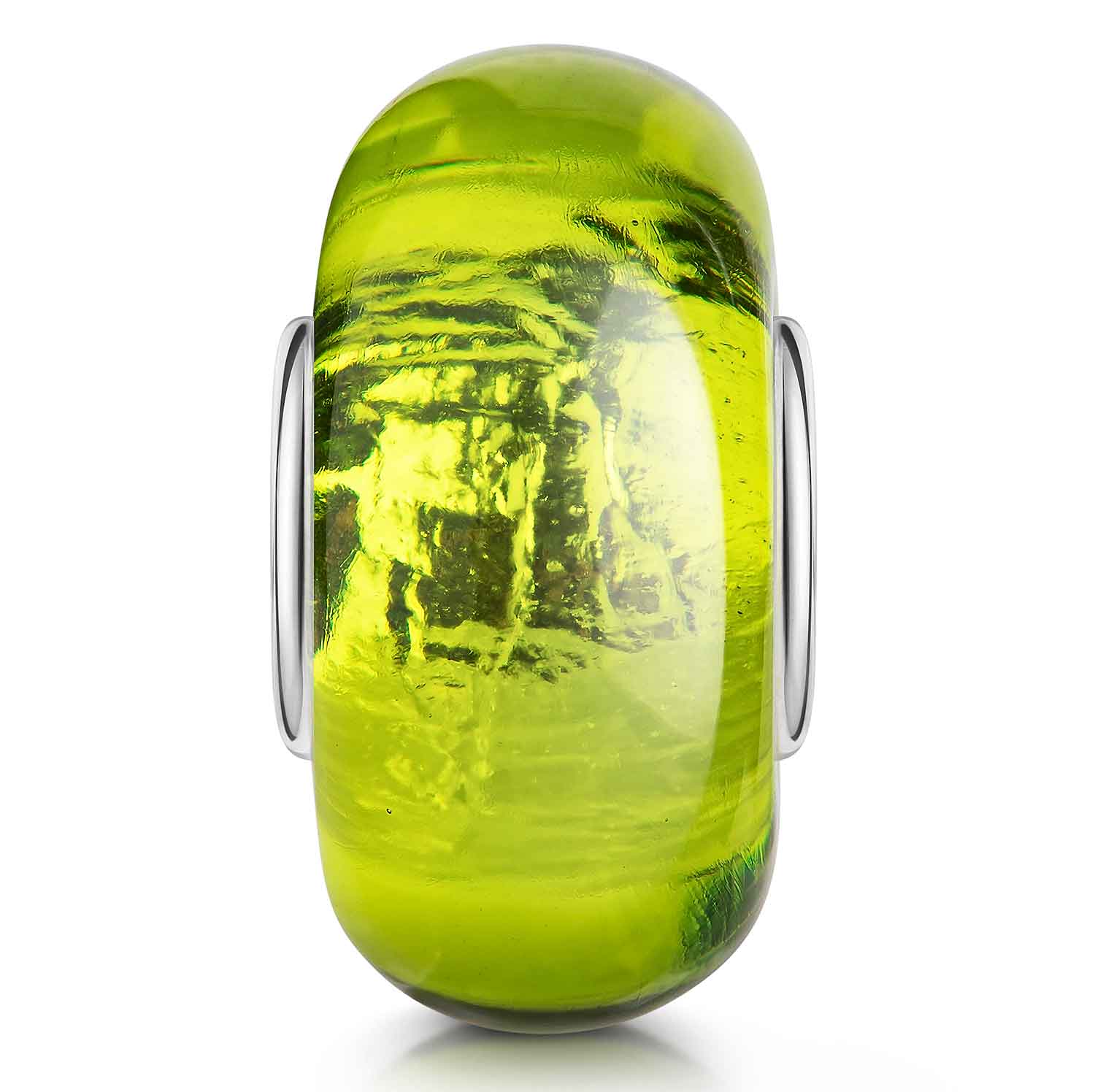 Dieser Glas Bead in einem grünen Farbton hat eine eingearbeitete Glitzerfolie im Glasinneren. Er ist zusätzlich mit einer Hülse aus massivem 925 Sterling Silber ausgestattet. Der Bead ist passend zu allen gängigen Beads Armbändern und Ketten bis max. 4,4mm Breite/ Durchmesser und ist daher auch besonders für alle gängigen großen Beads Marken geeignet.