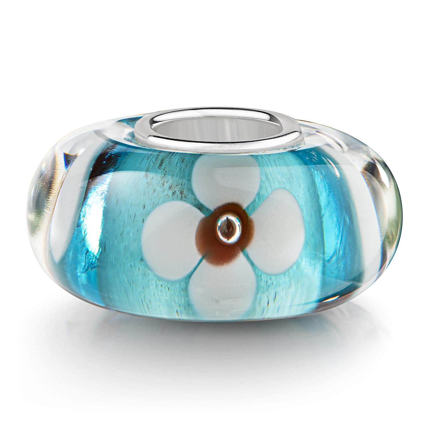 Dieser Glas Bead in den Farbtönen Hellblau und Weiß ist mit Blütenblättern verziert. Er ist passend zu allen gängigen Beads Armbändern und Ketten bis max. 4,4mm Breite und ist daher für alle Marken Beads geeignet. Mit diesem und anderen vielfältigen Beads aus unserer Kollektion können Sie Farbakzente in Ihrer Kleidung setzen und so Ihren Look am Handgelenk oder einer Halskette individuell gestalten.