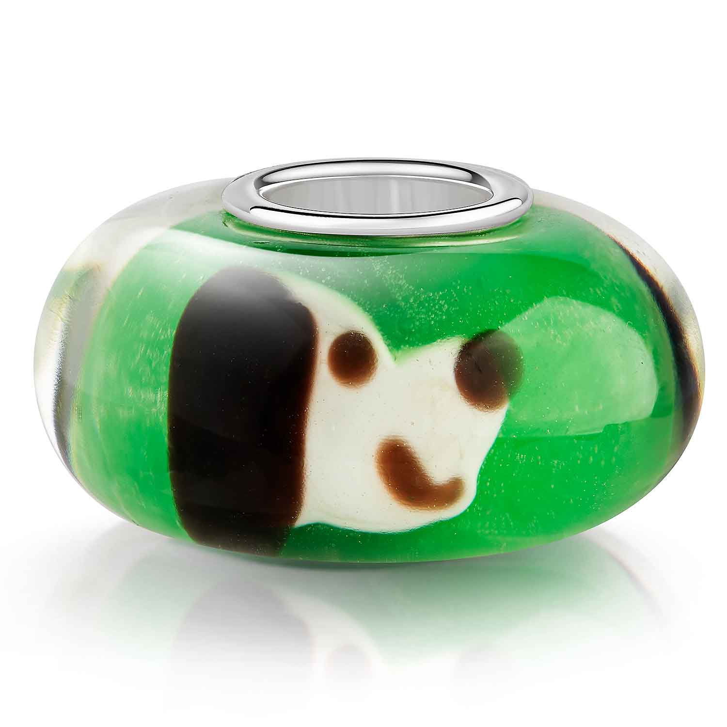 Grüner Glas Bead mit drolligem Hund in den Farben Braun und Weiß. Das Element ist zusätzlich mit einer Hülse aus reinem 925 Sterling Silber ausgestattet. Dieser Silber Glas Bead ist passend zu allen gängigen Beads Armbändern und Ketten bis max. 4,4mm Breite/ Durchmesser und ist daher auch besonders für alle gängigen großen Beads Marken geeignet.