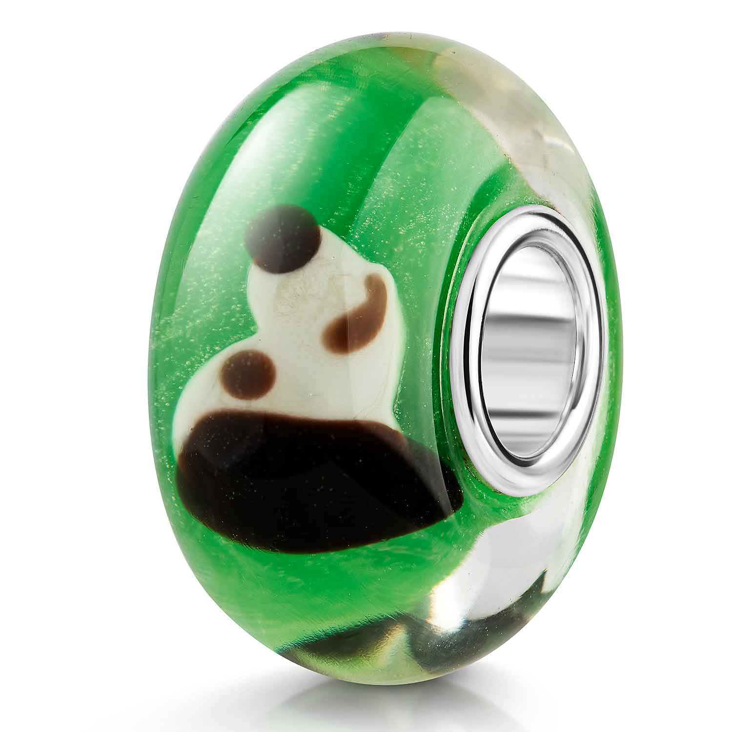 Grüner Glas Bead mit 925 Silberkern und Hunde-Motiv. Diese Glasperle ist passend auf alle Beads Armbänder und Ketten mit einer max. Stärke von 4,4mm.