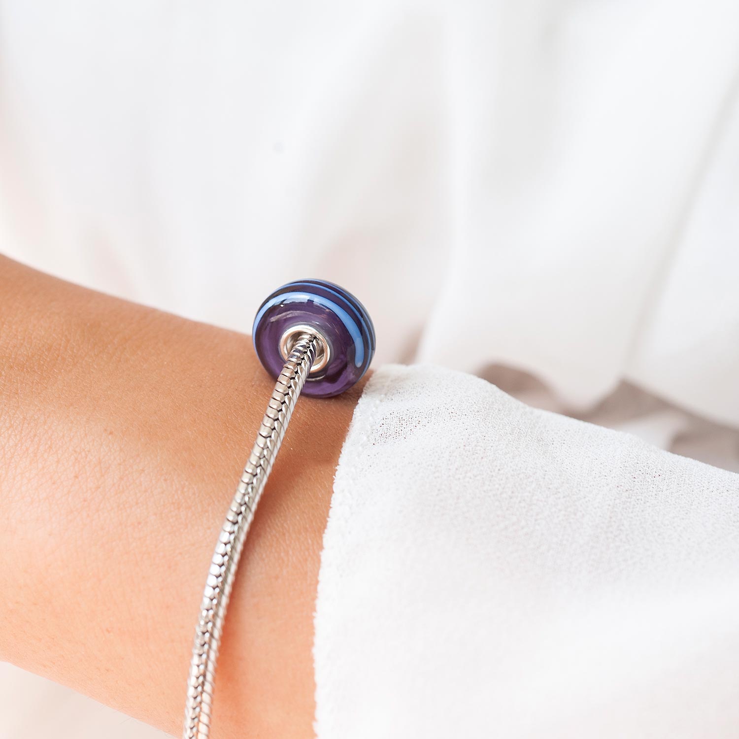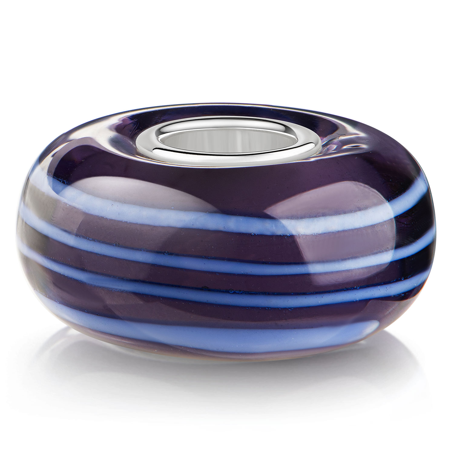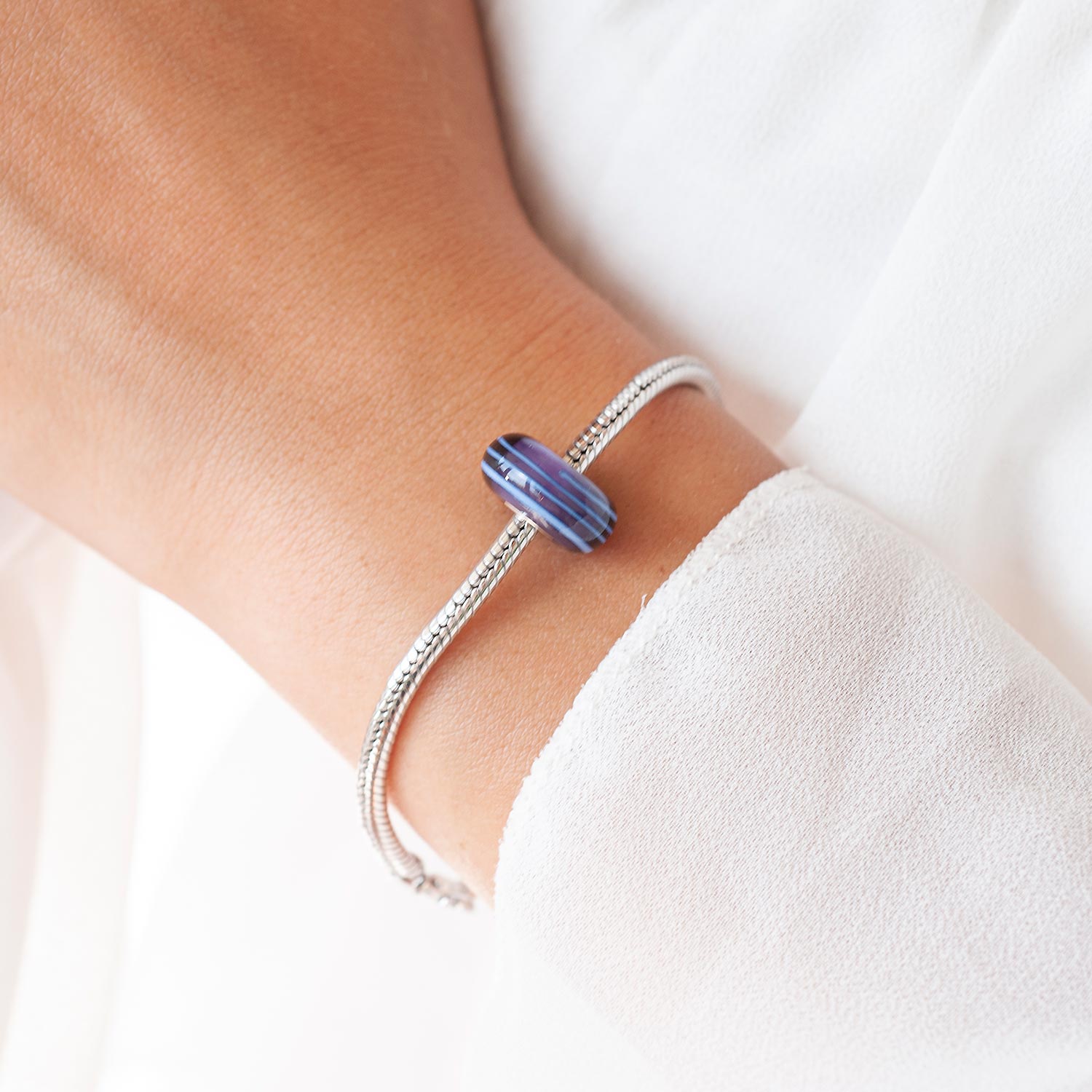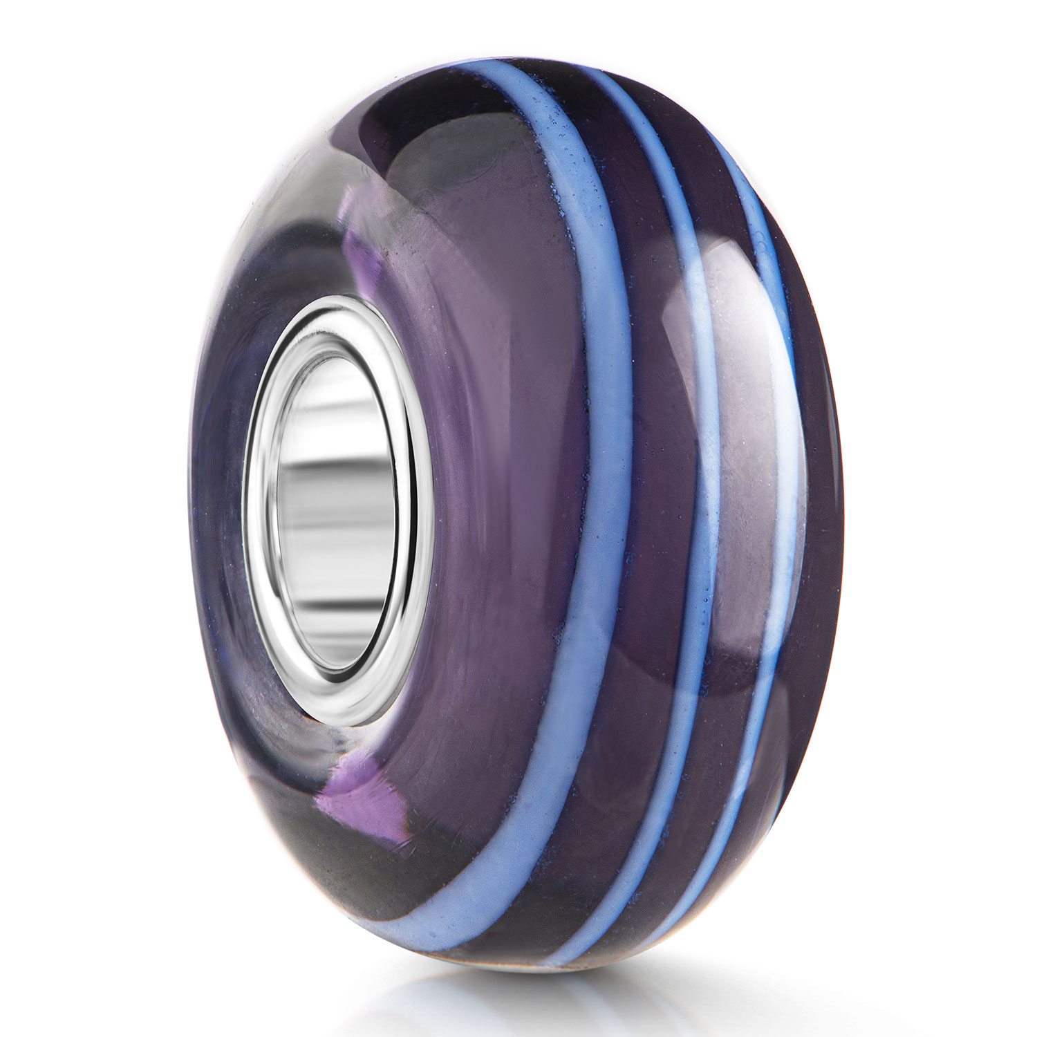 Lila Glas Bead mit hellblauen Linien und einer Hülse aus massivem 925 Sterling Silber. Diese Glas Perle passt auf alle Beads Armbänder und Ketten mit einem max. Durchmesser von 4,2mm.