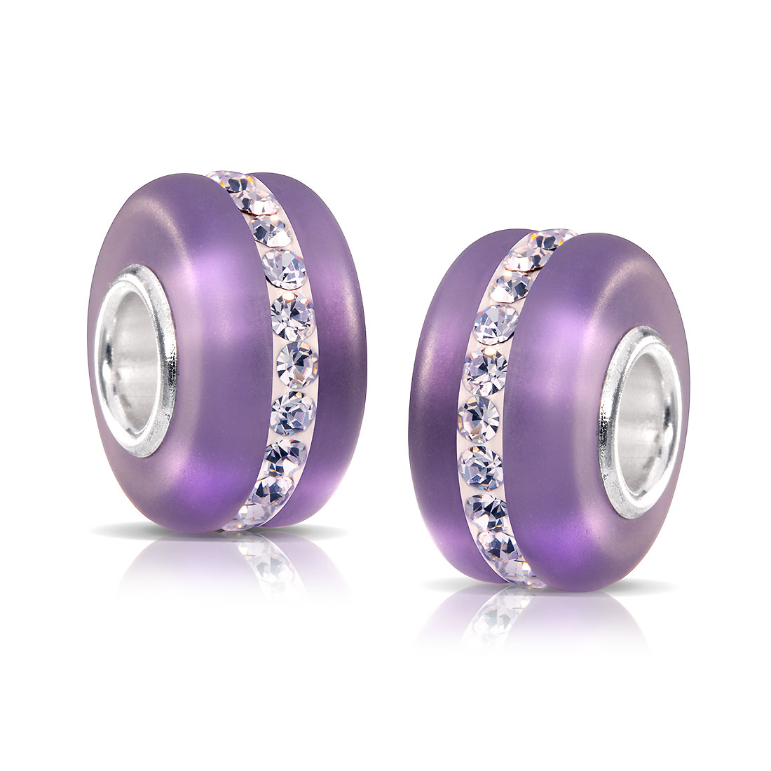 Mattierter Glas Bead in Lila mit weißen Strass Steinen und einer 925er Sterling Silber Hülse - kompatibel mit Basisarmbändern der meisten Hersteller.