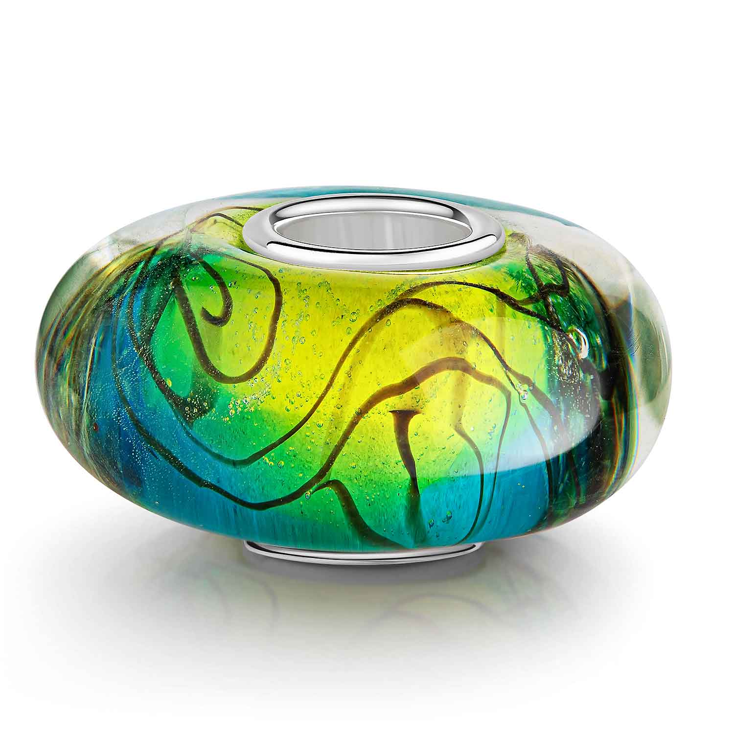 Glas Bead mit 925 Silber Hülse im Linien-Design in Gelb, Grün und Türkis. Er passt auf alle handelsüblichen Beads Armbänder und Ketten bis max. 4,4mm Breite und ist daher für alle Marken Beads geeignet.