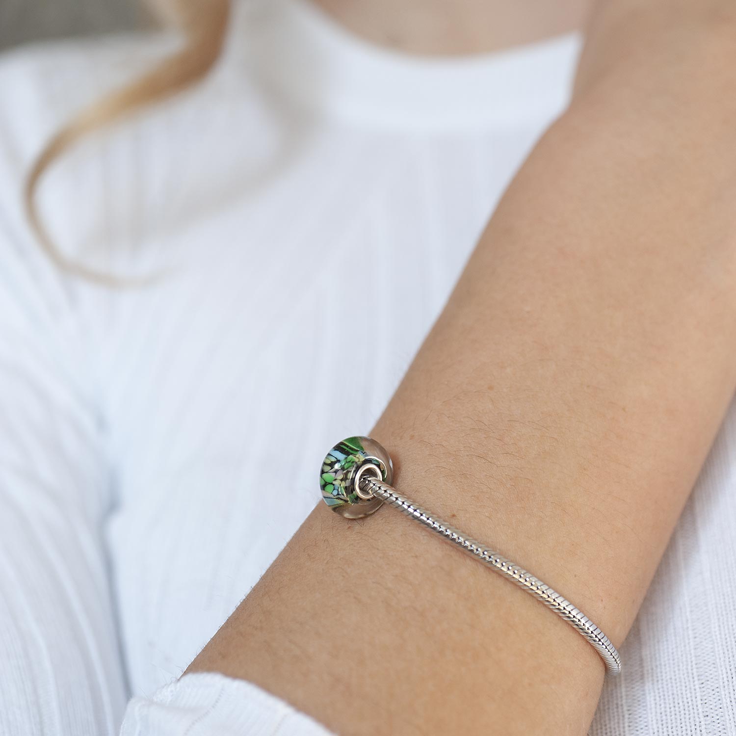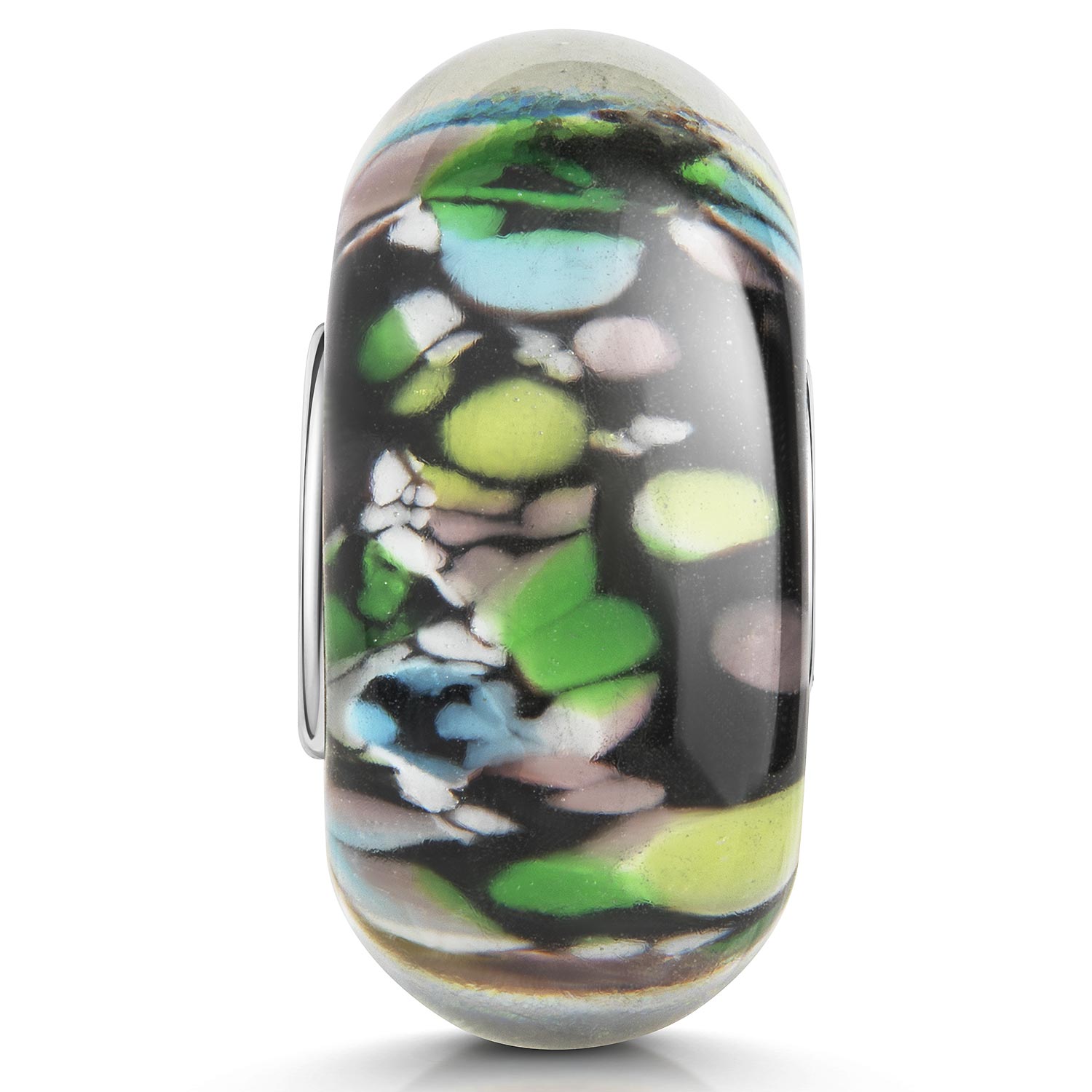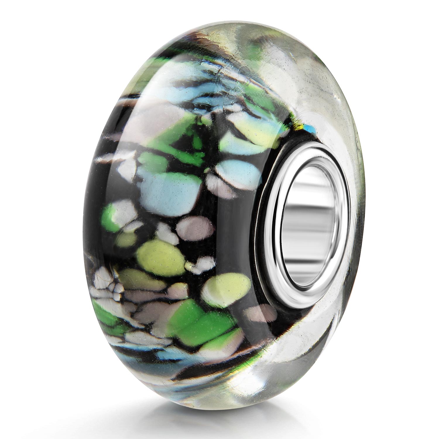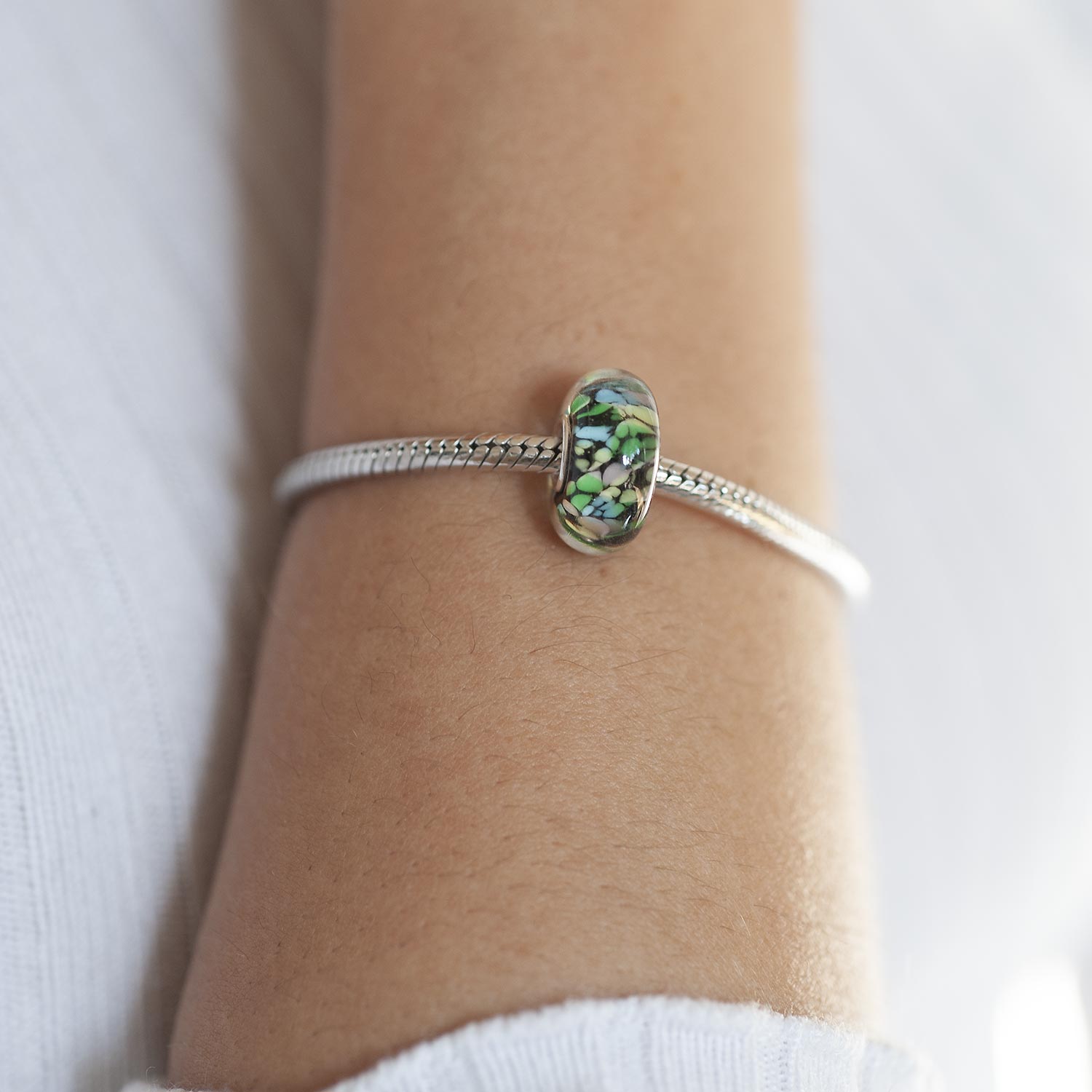 Glas Bead mit Meeresgrund Optik in den Farben schwarz, grün und blau mit einer Hülse aus 925 Silber. Der Bead passt auf Armbänder aller gängigen Bead Markenarmbänder und Ketten bis 4,4mm Stärke.
