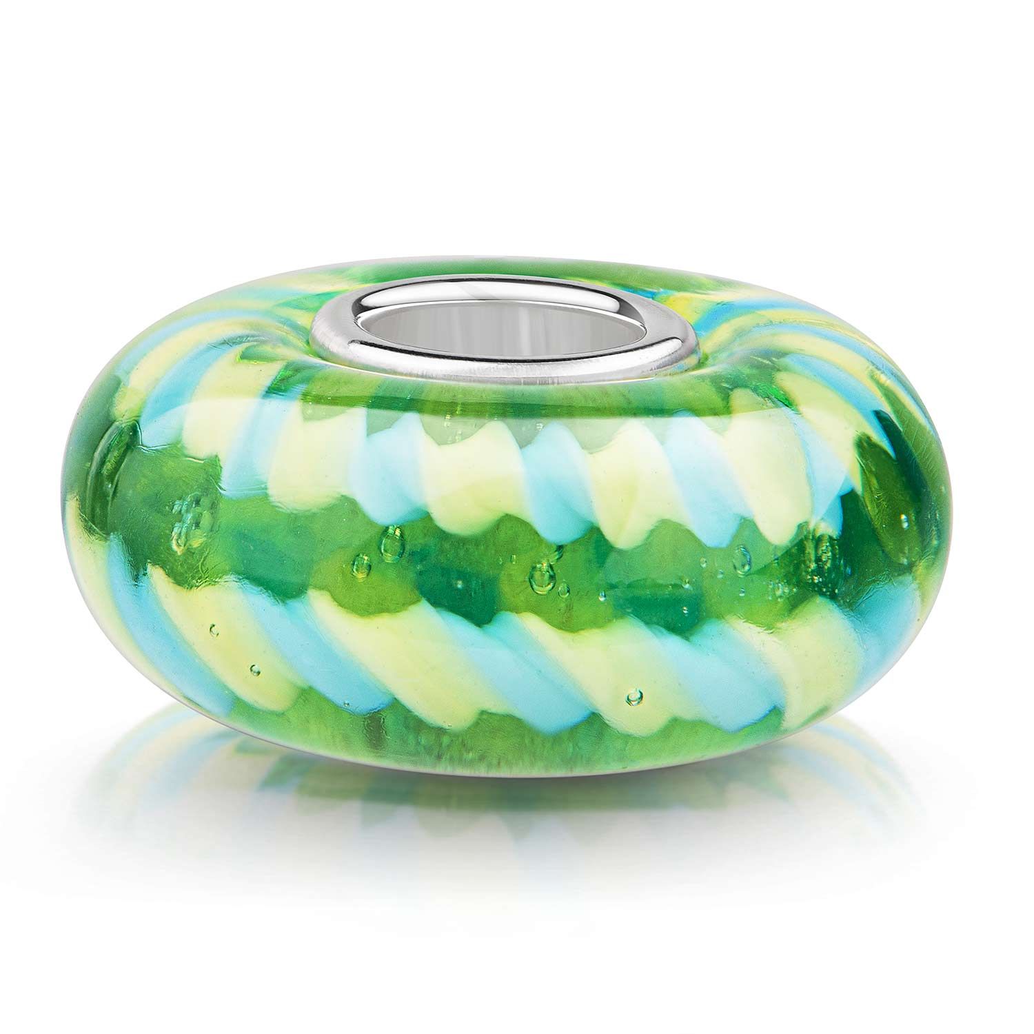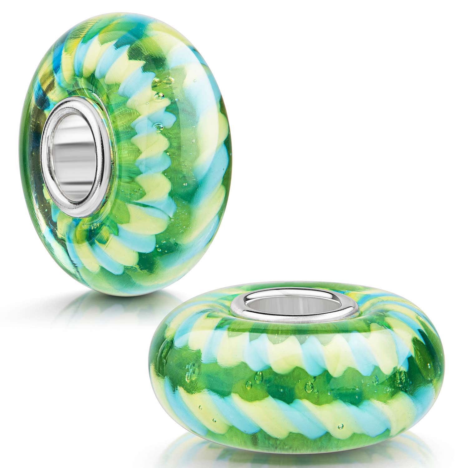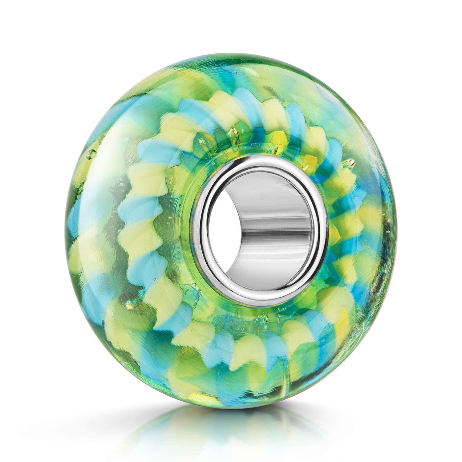 Grüner Glas Bead mit gelbem und blauem Muster und einer Hülse aus 925 Sterling Silber. Die Glasperle ist für Beads Armbänder und Ketten bis max 4,4mm Durchmesser geeignet.