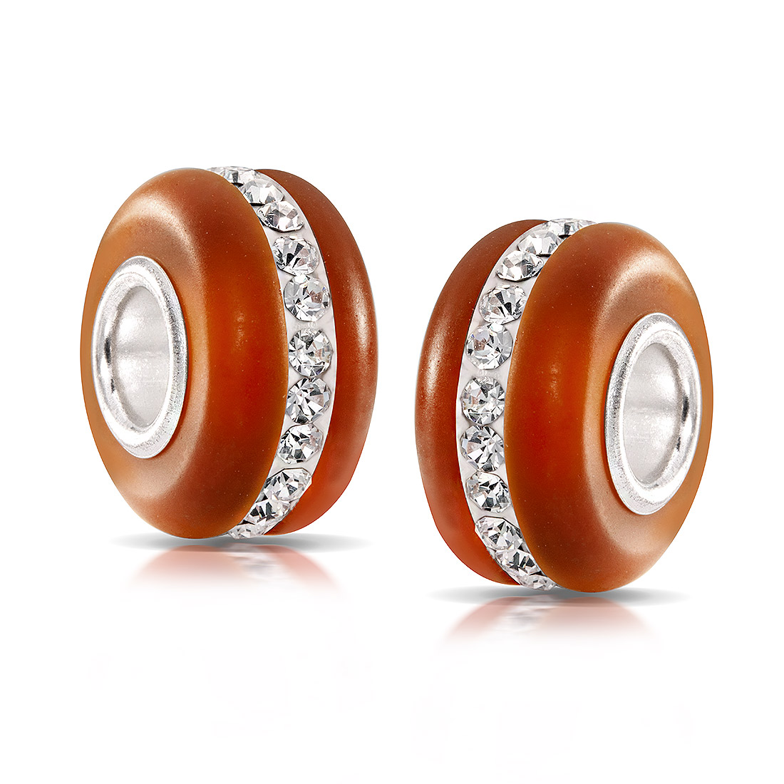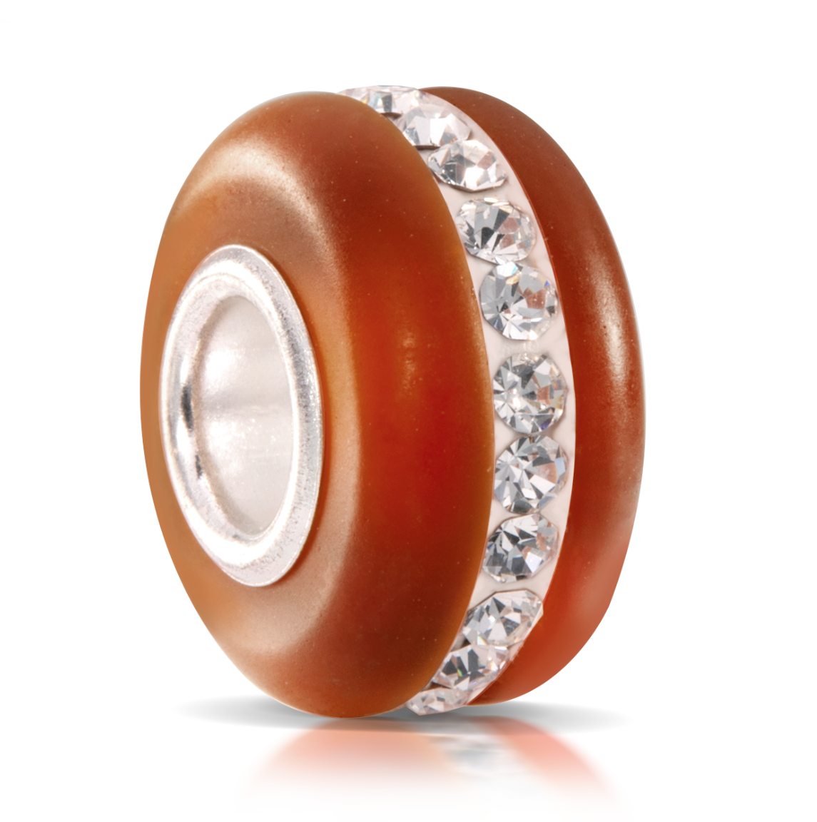 Modischer Glas Bead in einem dunklen orange mit weißen Strass Steinen und einer 925er Sterling Silber Hülse - kompatibel mit Basisarmbändern der meisten Hersteller.