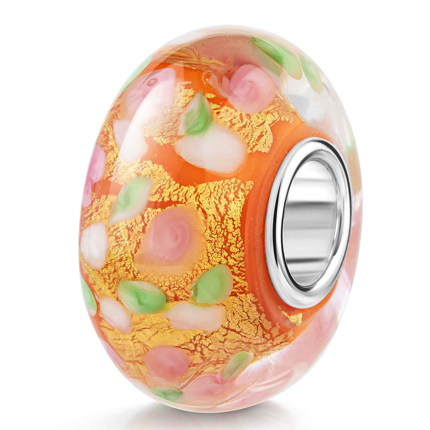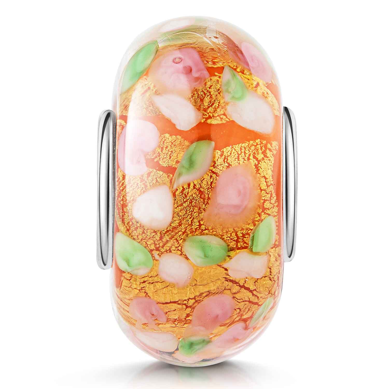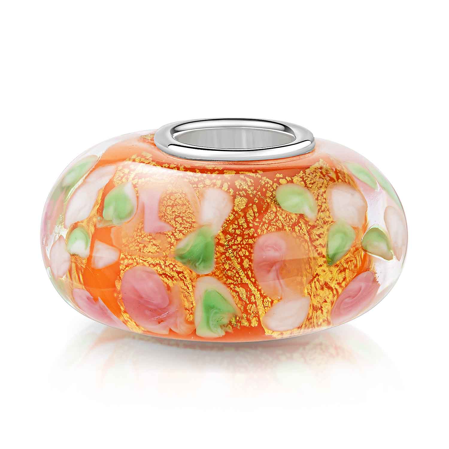 Orangener Glas Bead mit Tupfen in Rosa, Grün und Weiß und goldenen Glitzerfolienstücken im Glasinneren. Die Glasperle ist für Beads Armbänder und Ketten bis max. 4mm Durchmesser geeignet.