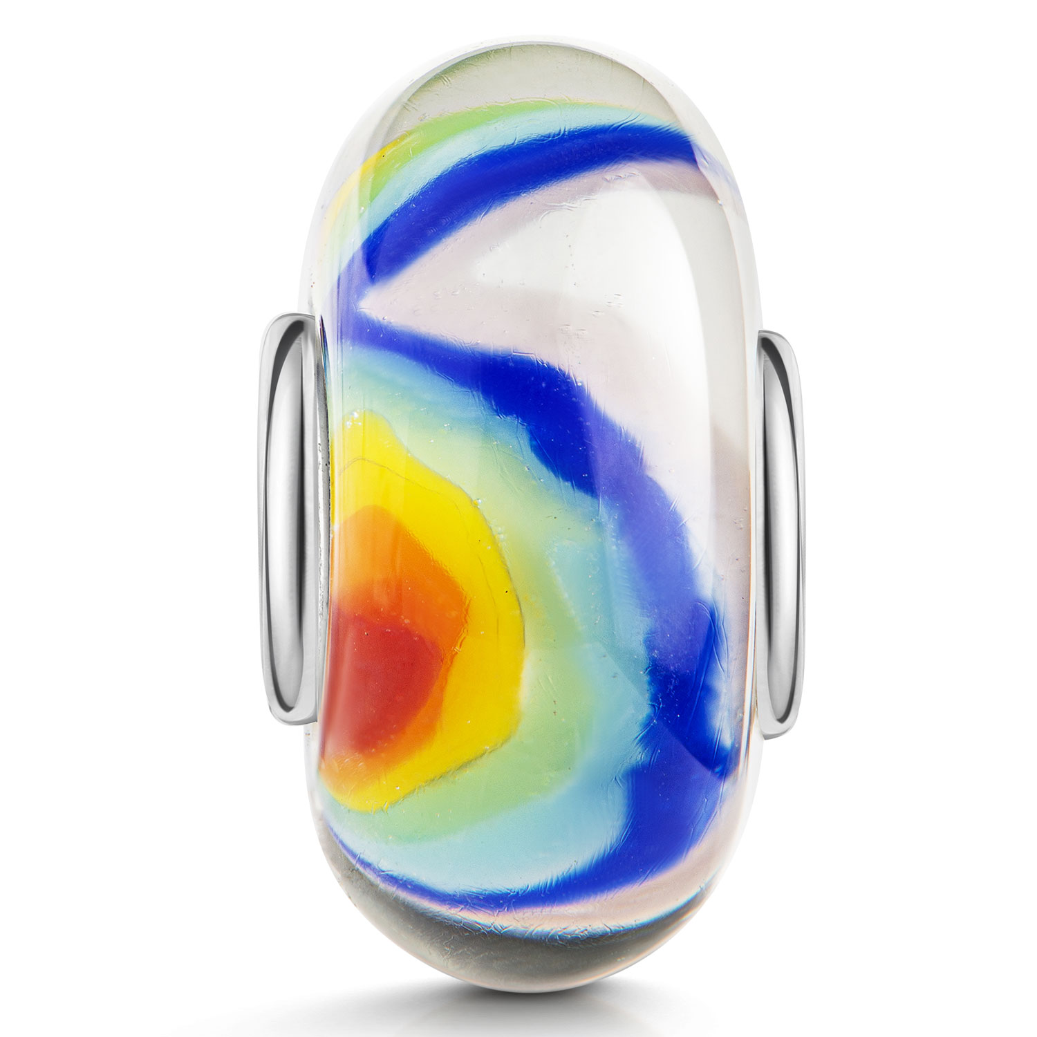 Unser Glas Bead weist ein farbenfrohes Regenbogen-Farbmuster auf. Er ist mit einer Hülse aus massivem 925 Sterling Silber ausgestattet. Dieser Beads Anhänger ist passend zu allen gängigen Beads Armbändern und Ketten bis max. 4,4mm Breite/ Durchmesser und ist daher auch besonders für alle gängigen großen Beads Marken geeignet.