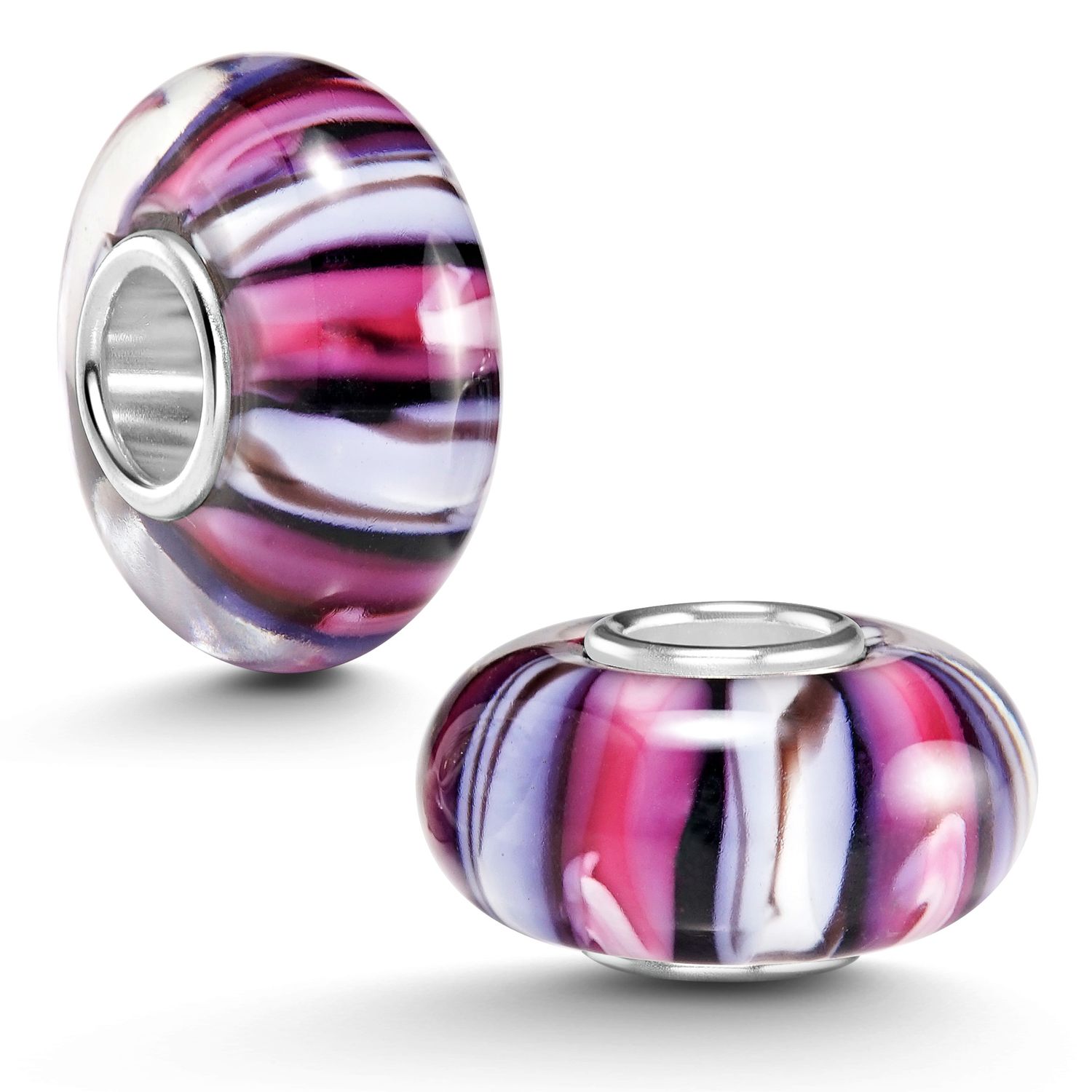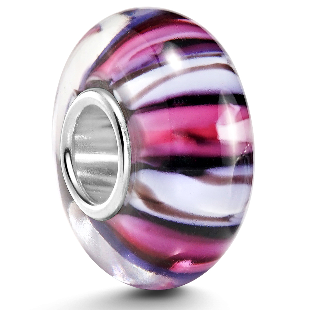 Dieser Glas Bead ist ausgefallen in der Farbgestaltung, wobei abwechselnd pinke und lilafarbene Streifen ineinander übergehen. Er ist zusätzlich mit einer Hülse aus massivem 925 Sterling Silber ausgestattet. Dieser Silber Bead ist passend zu allen gängigen Beads Armbändern und Ketten bis max. 4,4mm Breite/ Durchmesser und ist daher auch besonders für alle gängigen großen Beads Marken geeignet.