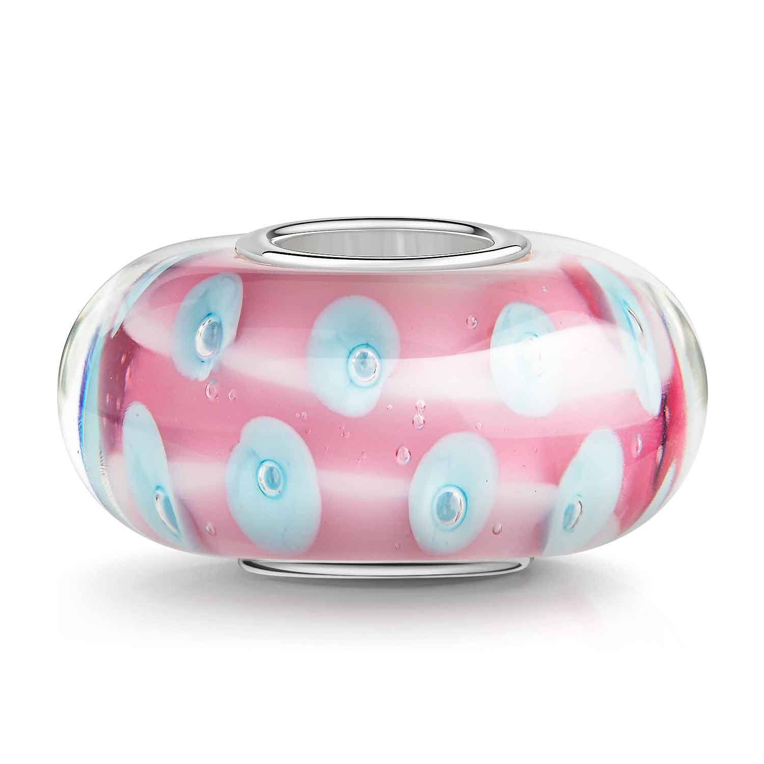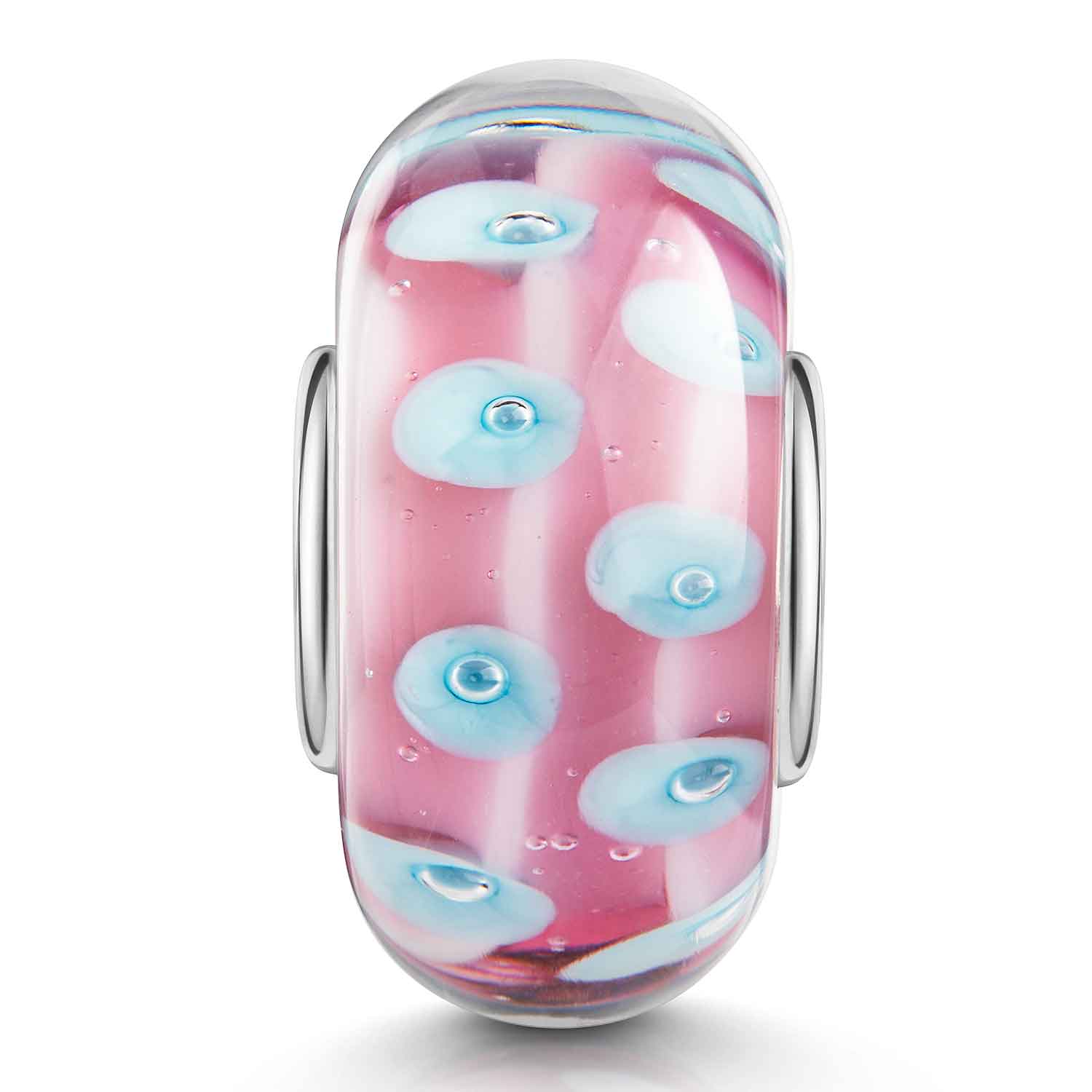 Intensiver rosa Glas Bead mit hellblauen Punkten, ausgestattet mit einer 925 Sterling Silber Hülse.