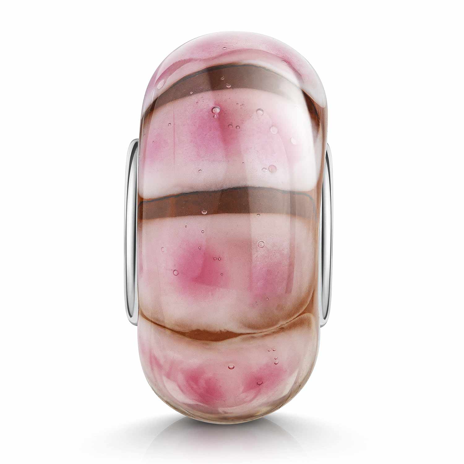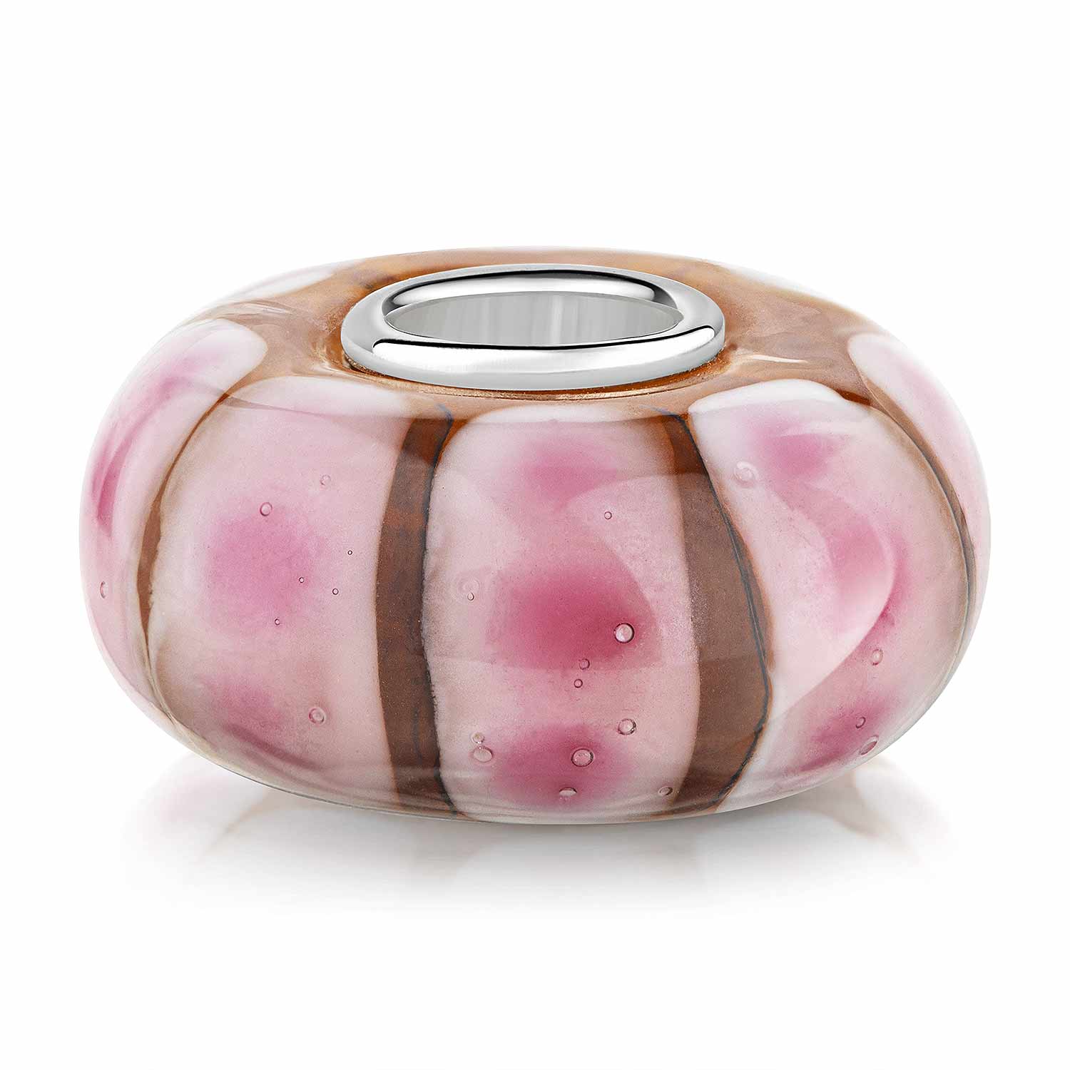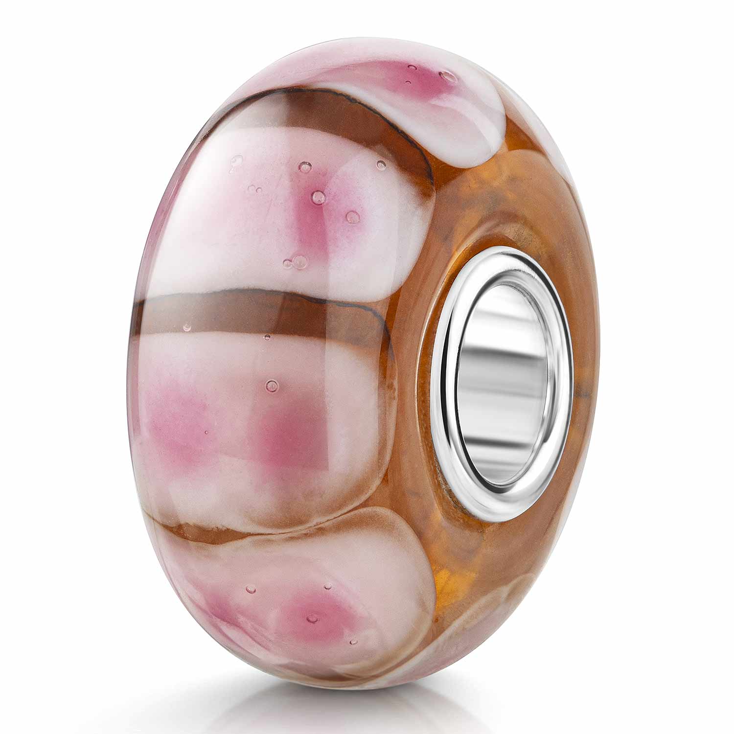 Orangener Glas Bead mit rosa Tupfen, ausgestattet mit Hülse aus massivem 925 Sterling Silber. Lieferung inkl. Materia Satin Schmuckbeutel.