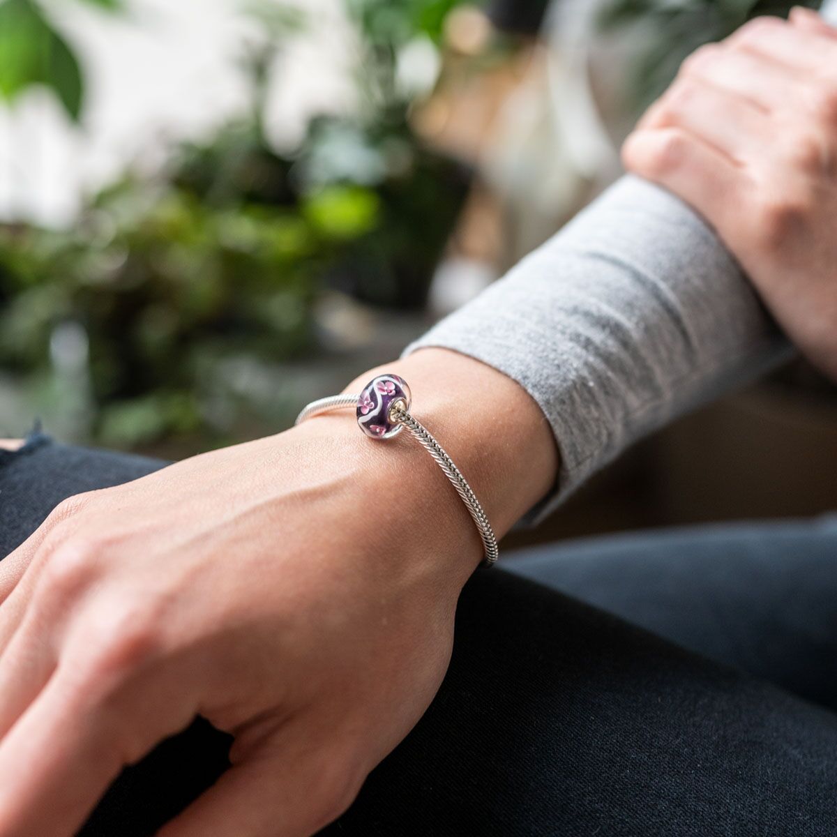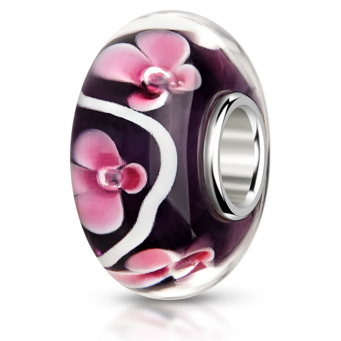 Interessante Glasperle mit Blumen- und Blütenmotiven in Violett und Rosa. Er ist zusätzlich mit einer Hülse aus massivem 925 Sterling Silber ausgestattet. This Silber Bead ist passend zu allen gängigen Beads Armbändern und Ketten bis max. 4,4mm Breite/ Durchmesser und ist daher auch besonders für alle großen Beads Marken geeignet.