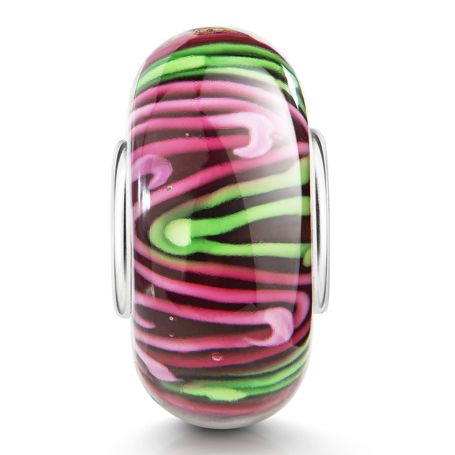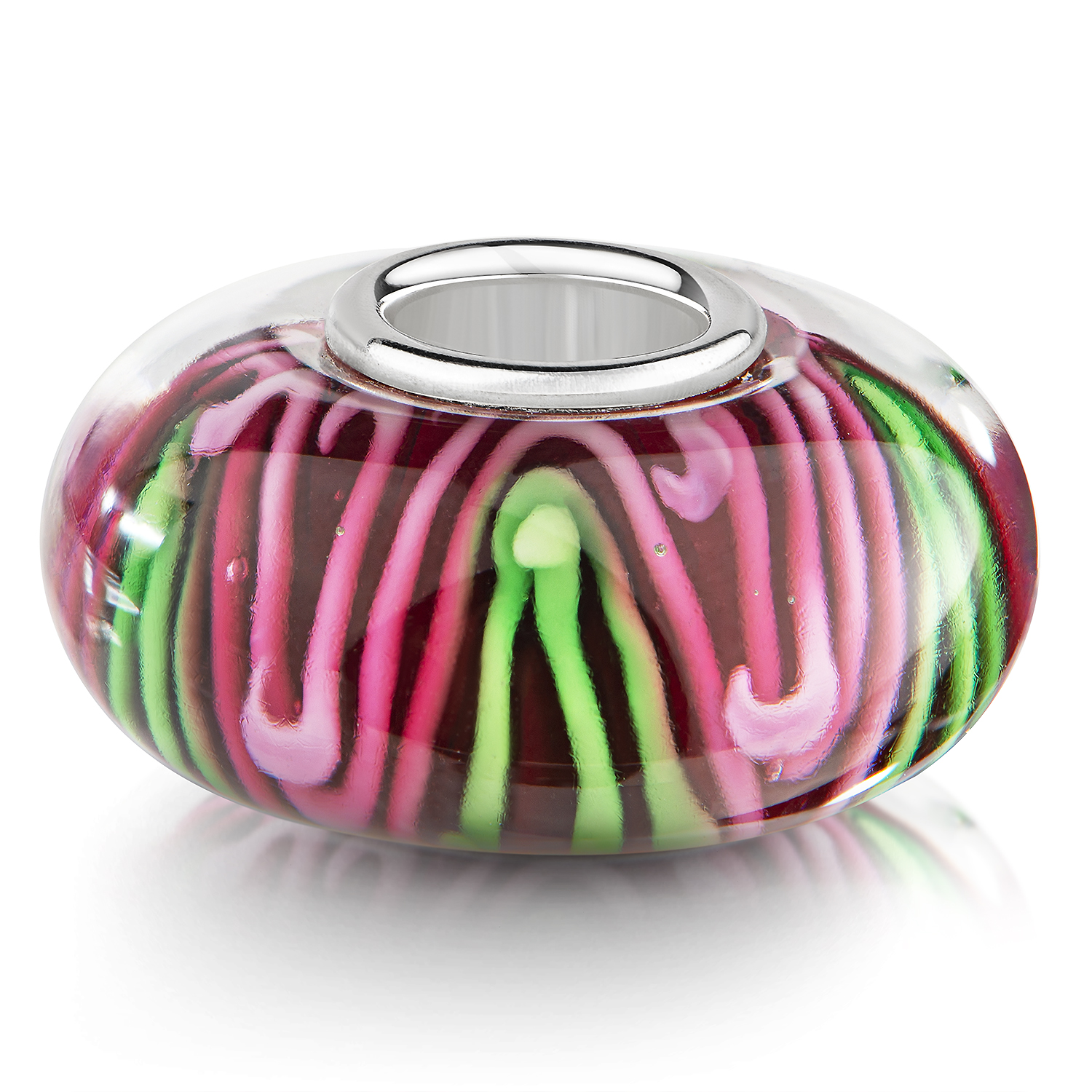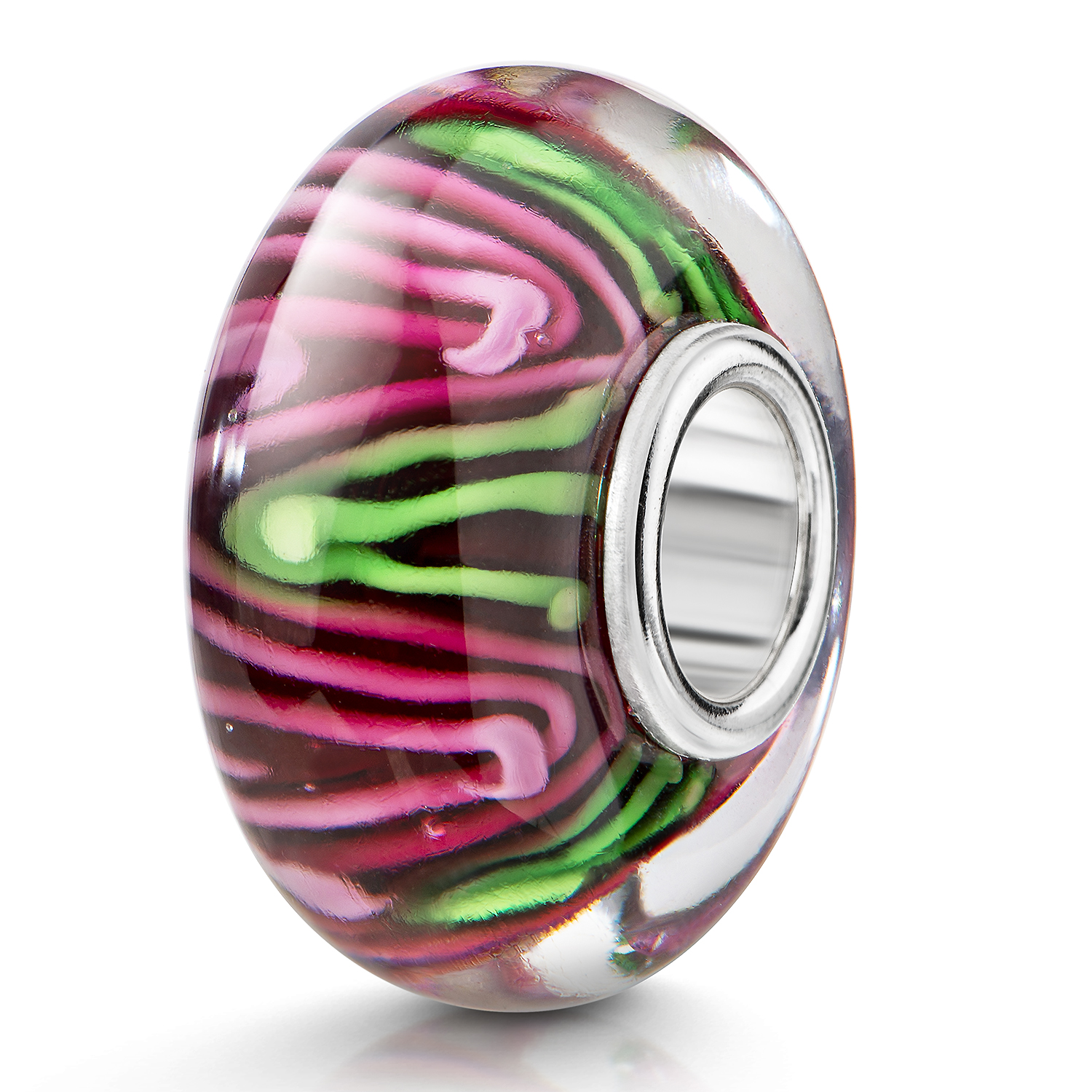 Roter Glas Bead mit Linien im Zick-Zack-Muster in Rosa und Grün. Die Glasperle ist passend zu allen gängigen Schmuck Bead-Armbändern & Ketten anderer großer Marken bis max. 4,4mm Lochdurchmesser.