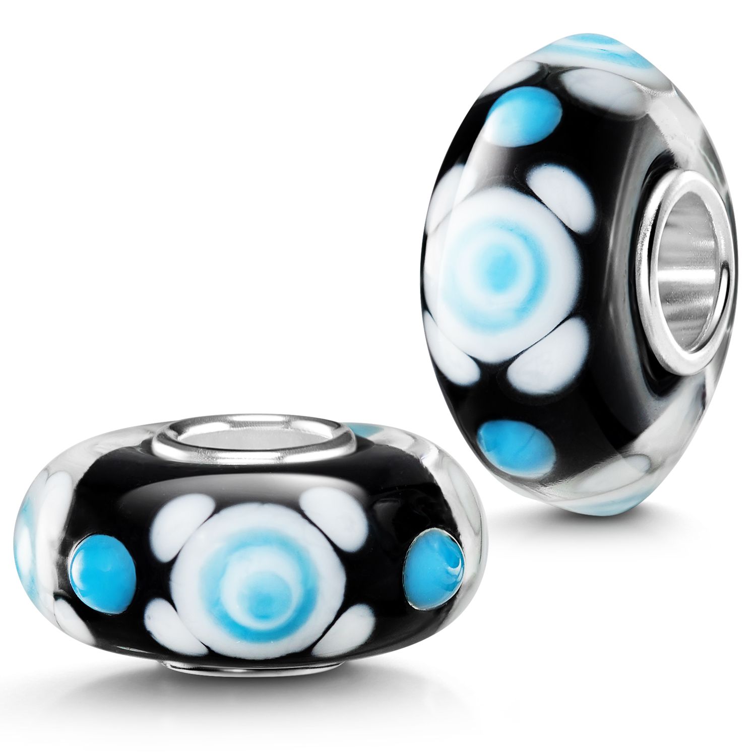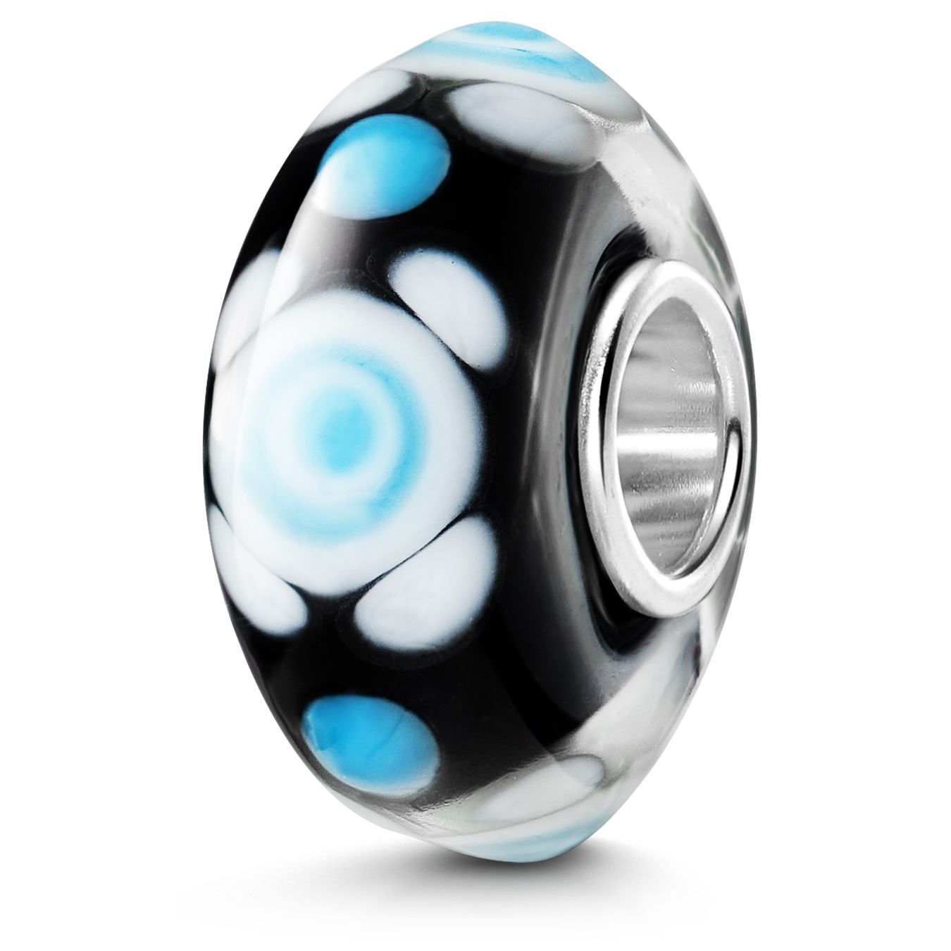 Schwarzer Glas Bead mit Punkten in Blau und Weiß, sowie einer Hülse aus 925 Sterling Silber. Die Glasperle ist für Beads Armbänder und Ketten bis max 4,4mm Durchmesser geeignet.