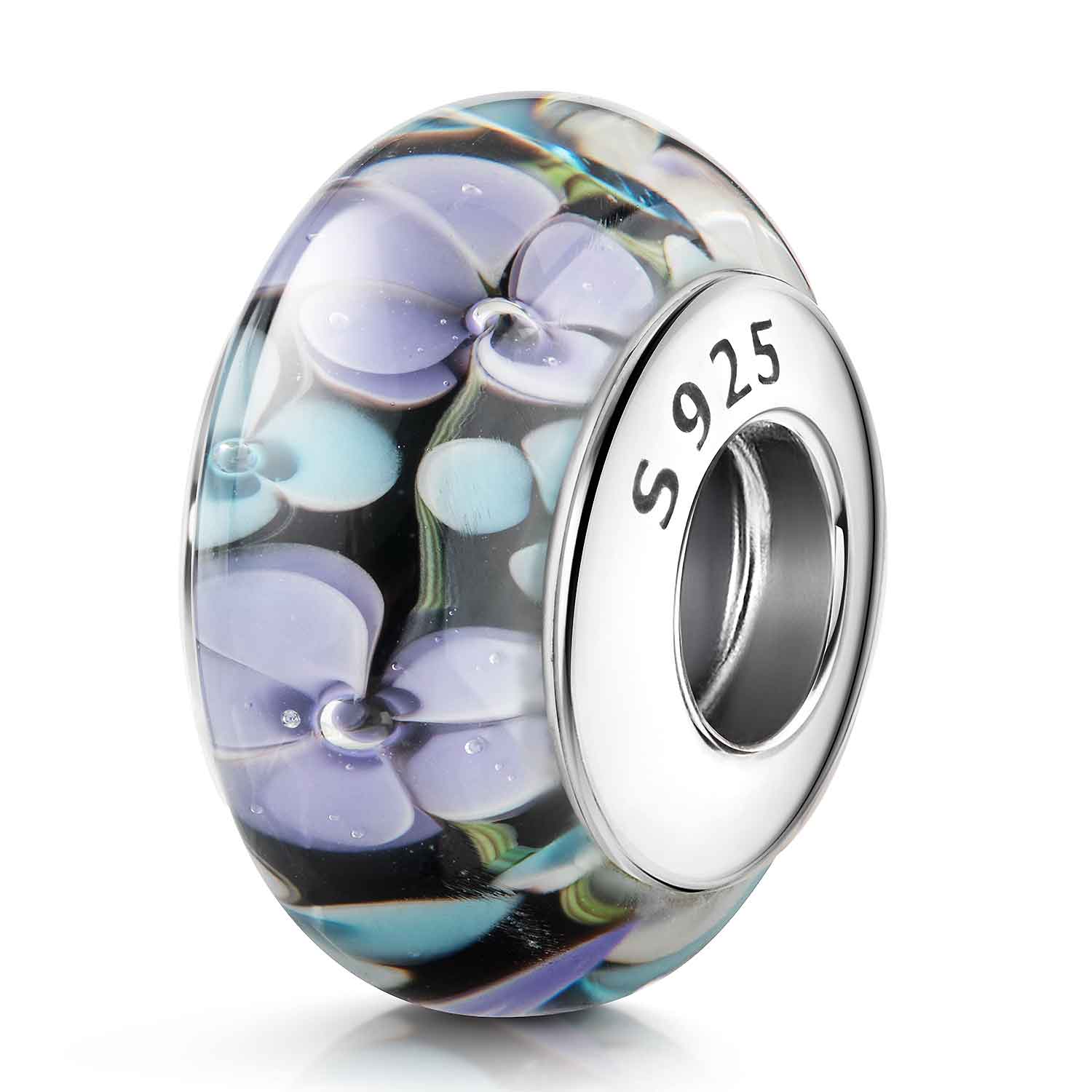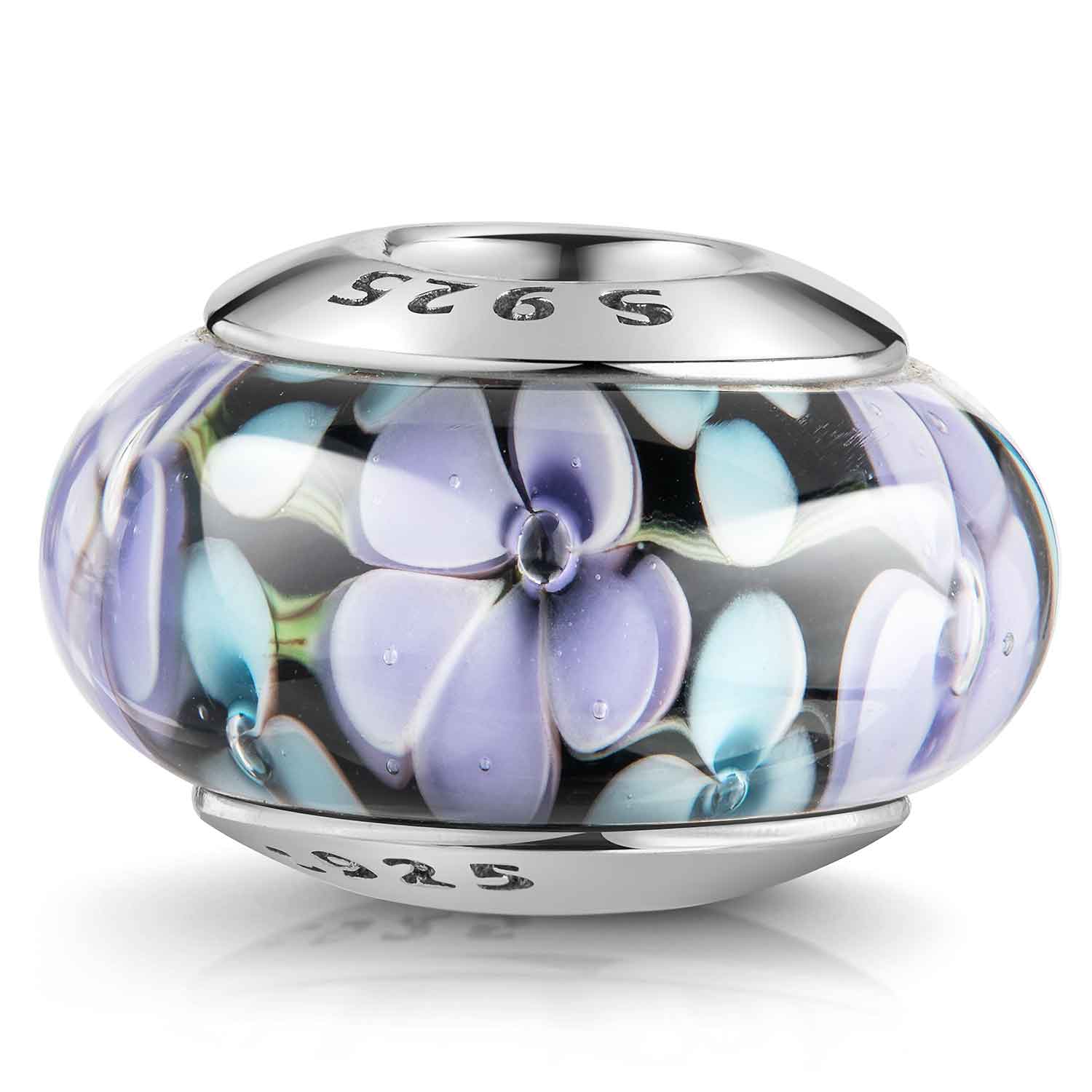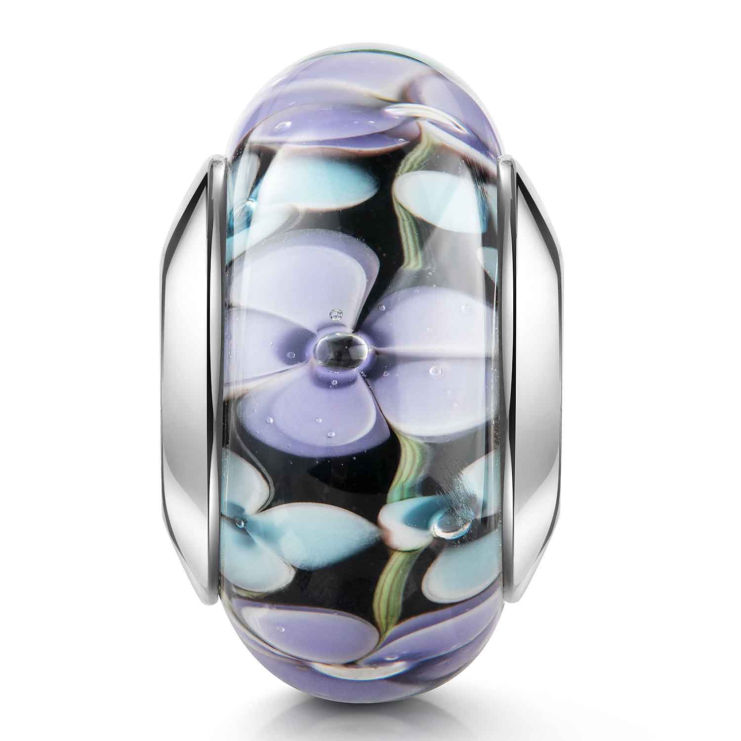 Schwarzer Glasbead verziert mit lilanen und blauen Blumen. Geeignet für Beads Armbänder und Ketten mit oder ohne Gewinde bis Ø3,8mm.