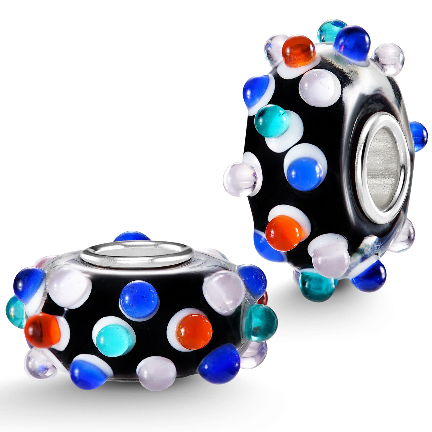 Ausgefallener Glas Bead in 3D Optik in schwarz mit bunten Punkten, ausgestattet mit einer 925 Sterling Silber Hülse. Dieses Bead Element ist kompatibel zu allen Beads Armbändern & Ketten mit einer max. Stärke von 4,4mm.