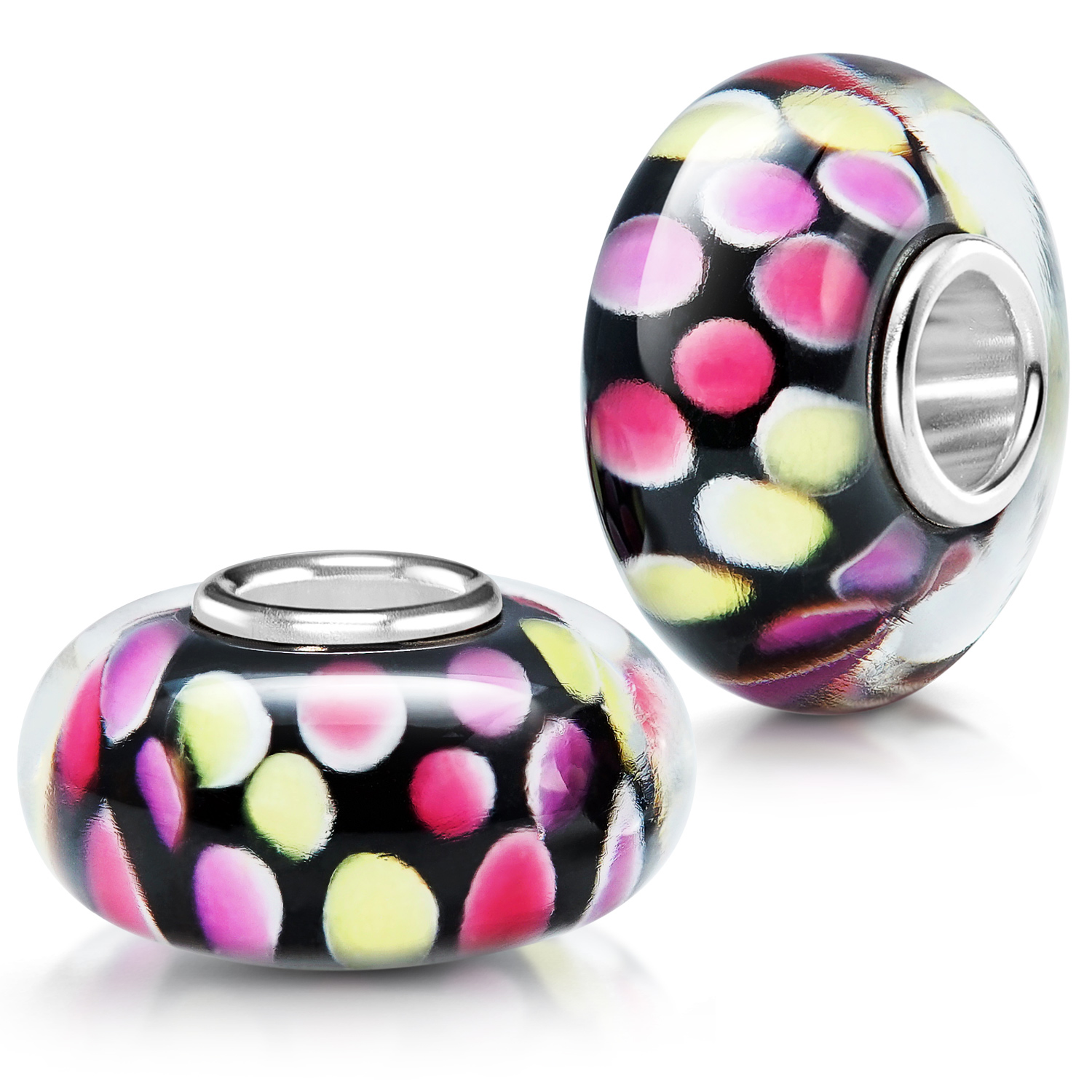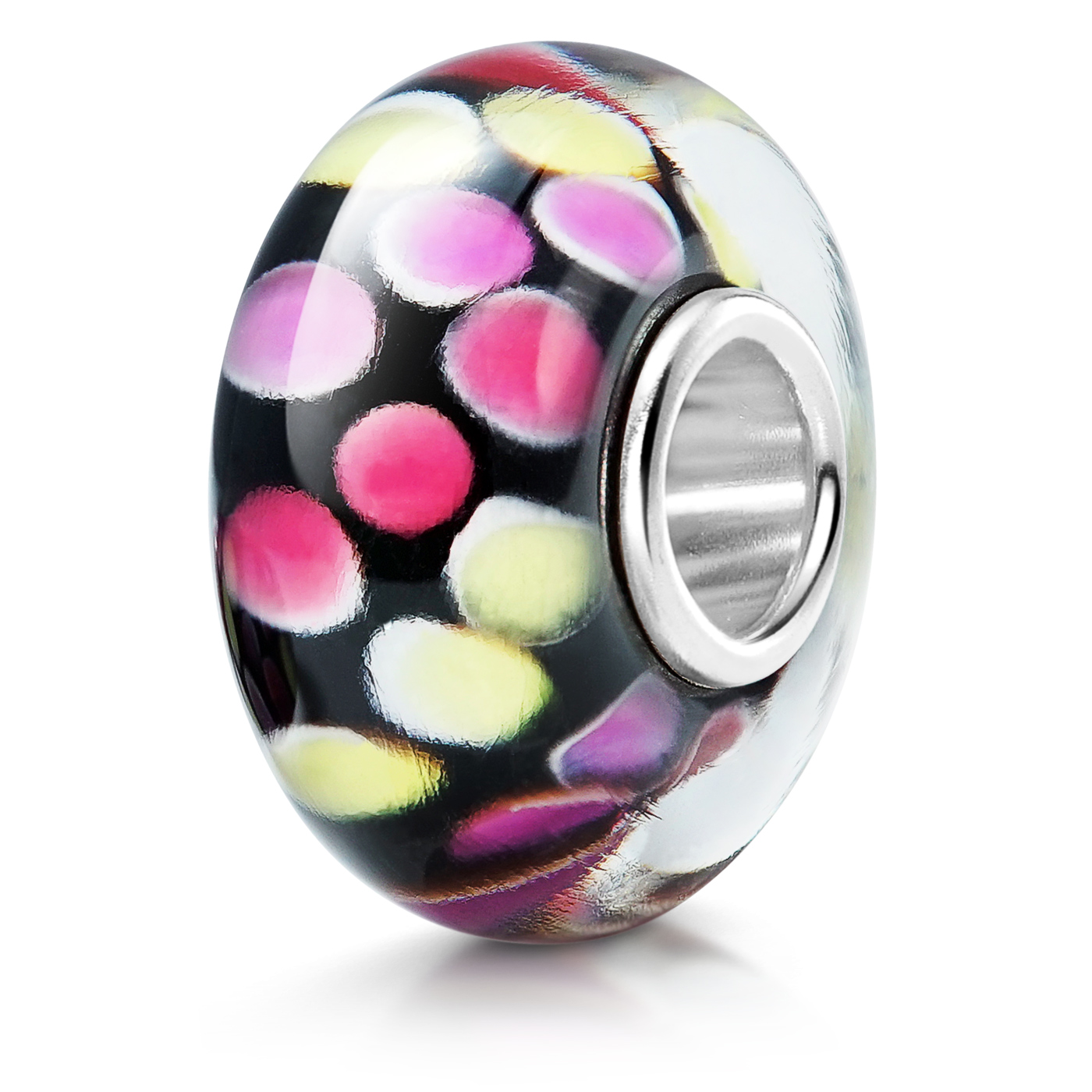 Sehr farbenfroher, gepunkteter Glas Bead in schwarz, pink, gelb und rosa. Der Bead ist mit einer hochwertigen Hülse aus 925 Sterling Silber ausgestattet. Er eignet sich für alle handelsüblichen Beads Armbänder und Ketten bis max. 4,4mm Breite und ist auch für alle gängigen großen Beads Marken geeignet.