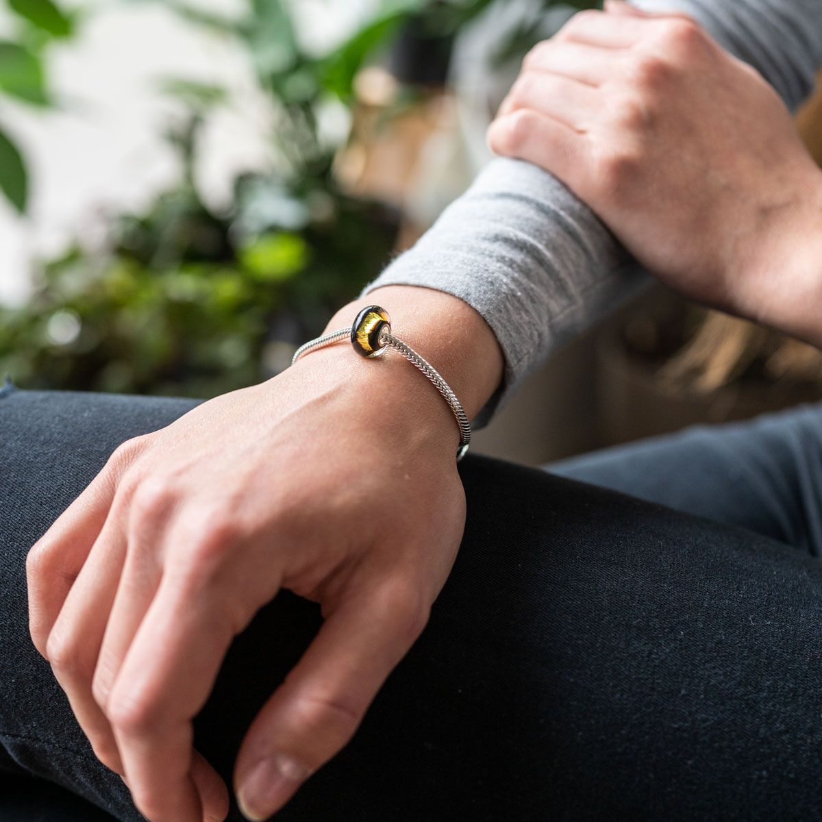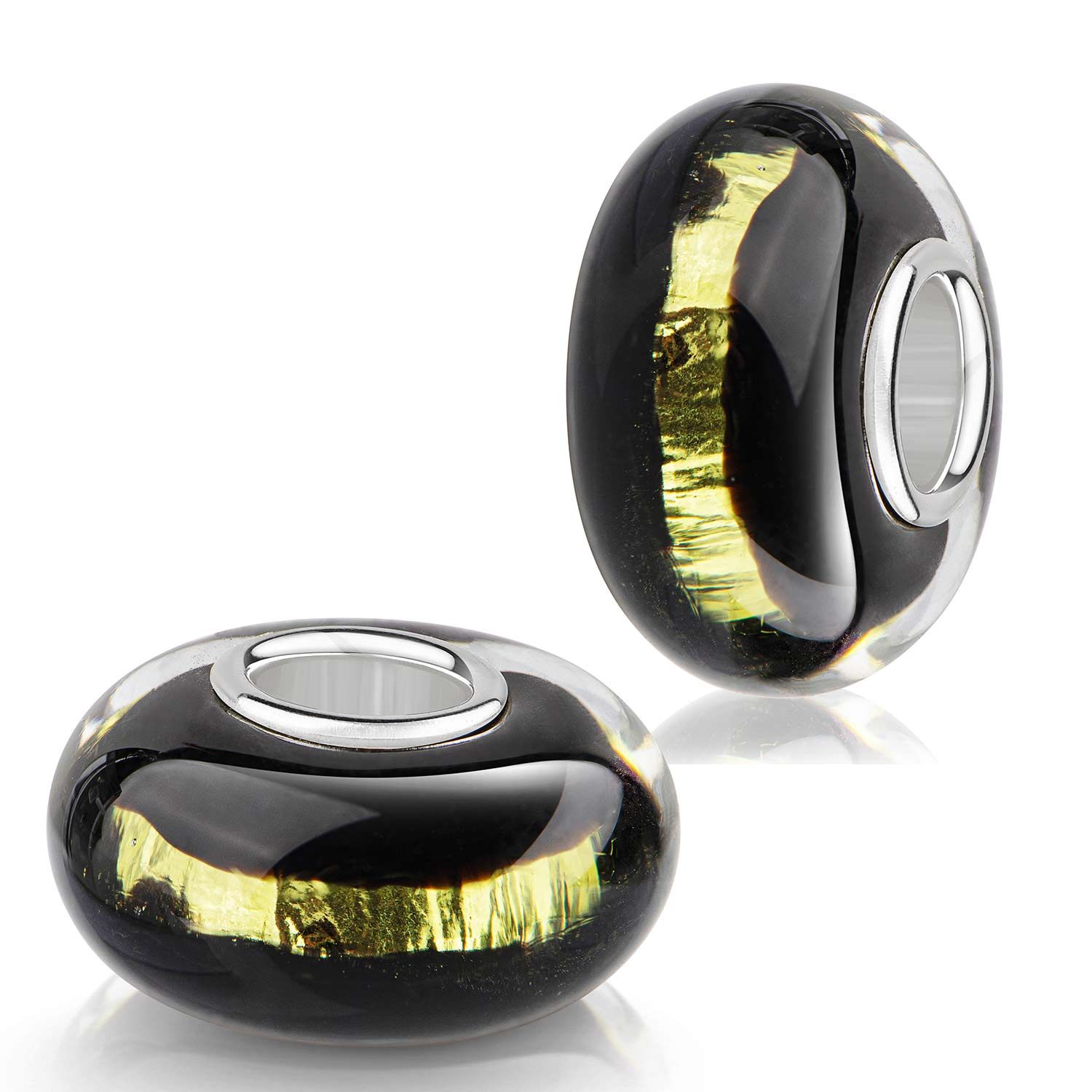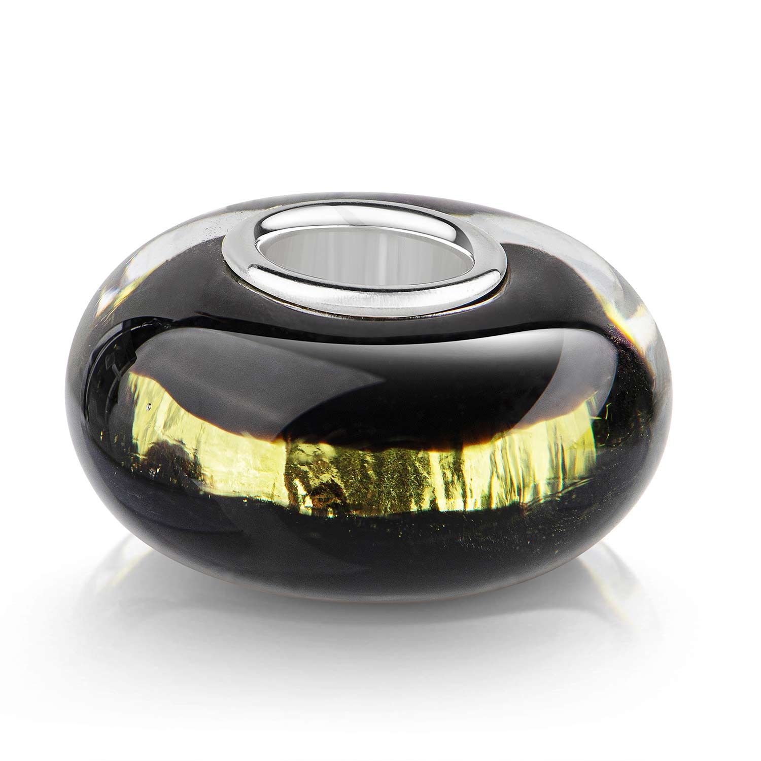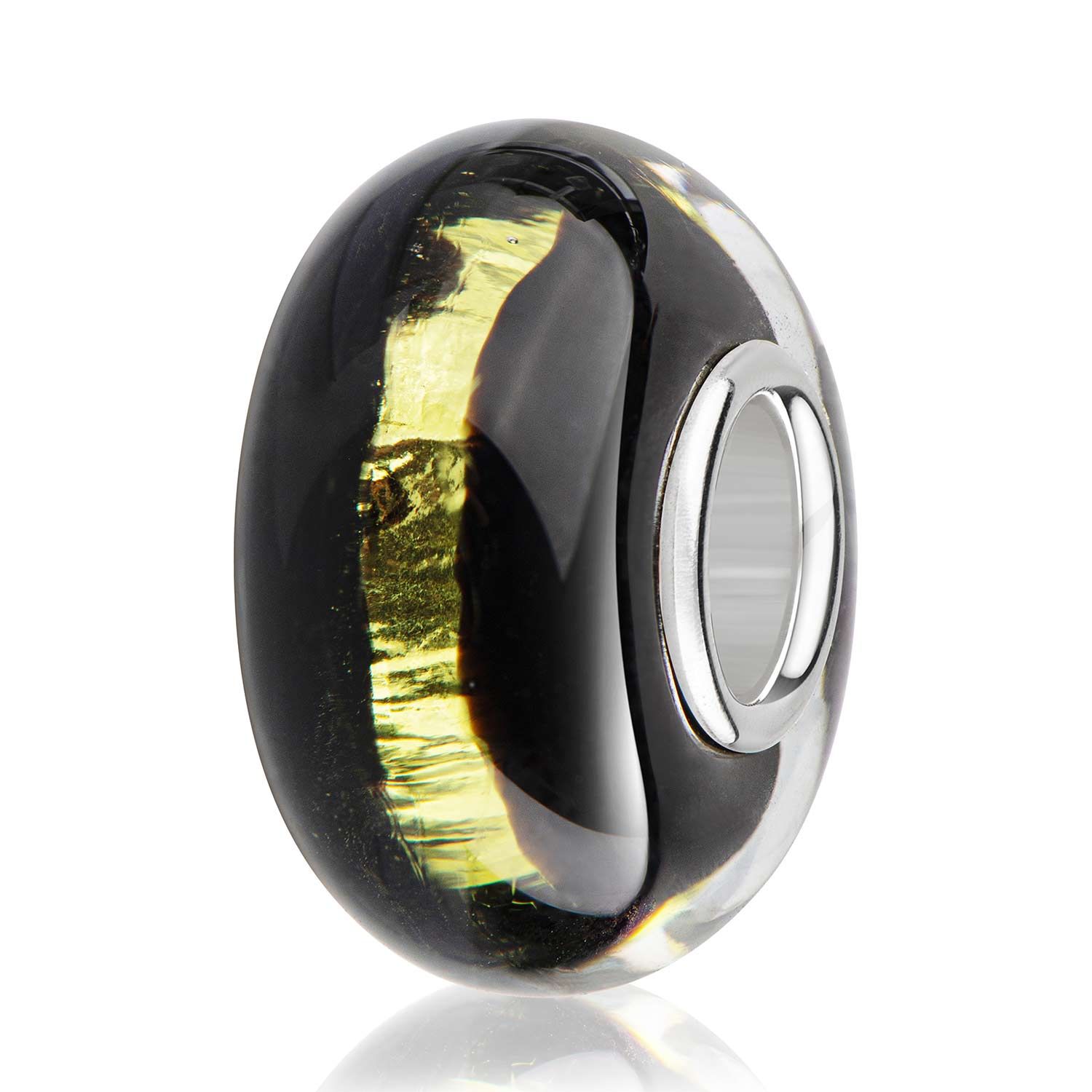 Dieser schwarze Glas Bead mit goldener Glitzerfolie im Inneren erzeugt einen besonderen Schimmer an ihrem Armband. Er ist passend zu allen gängigen Beads Armbändern/ Ketten mit einem max. Durchmesser von 4,4mm. Somit ist er auch kompatibel zu allen bekannten Beads-Marken. Tragen Sie diesen Bead an einem Armband oder als edlen Beads-Kettenanhänger.